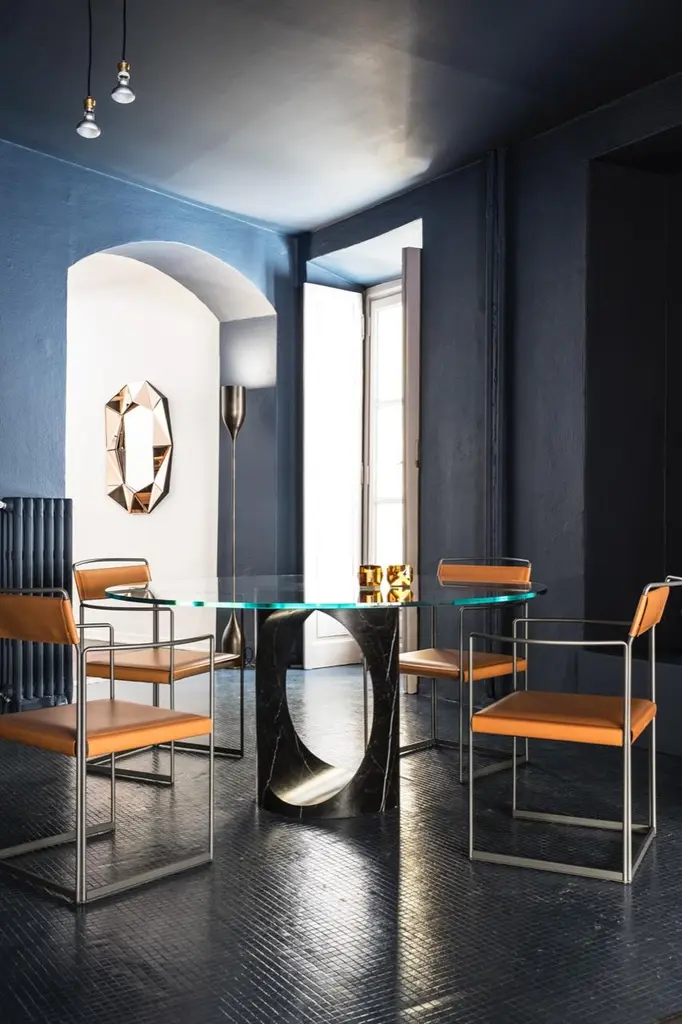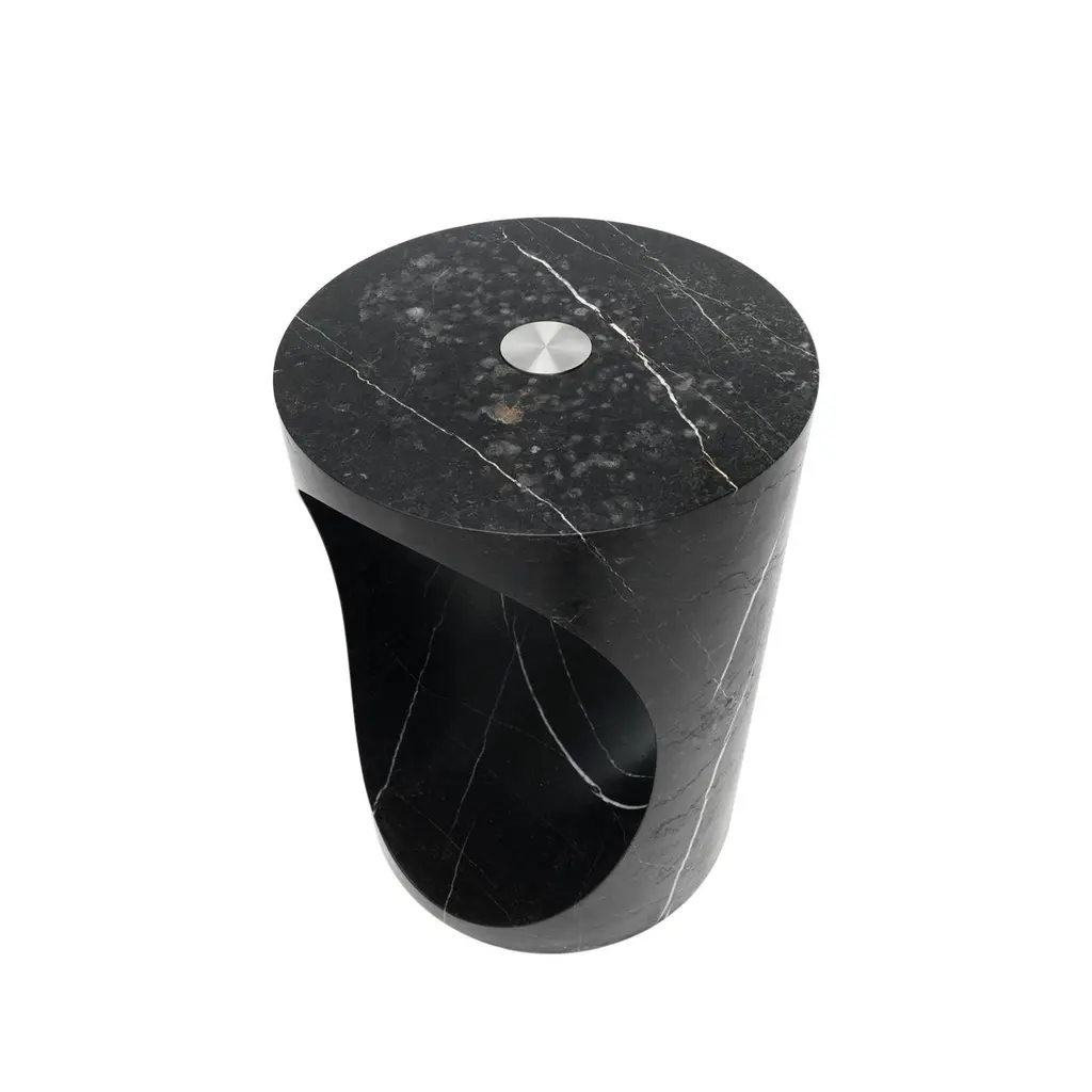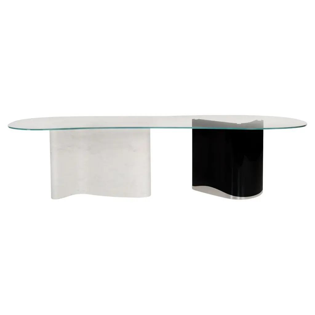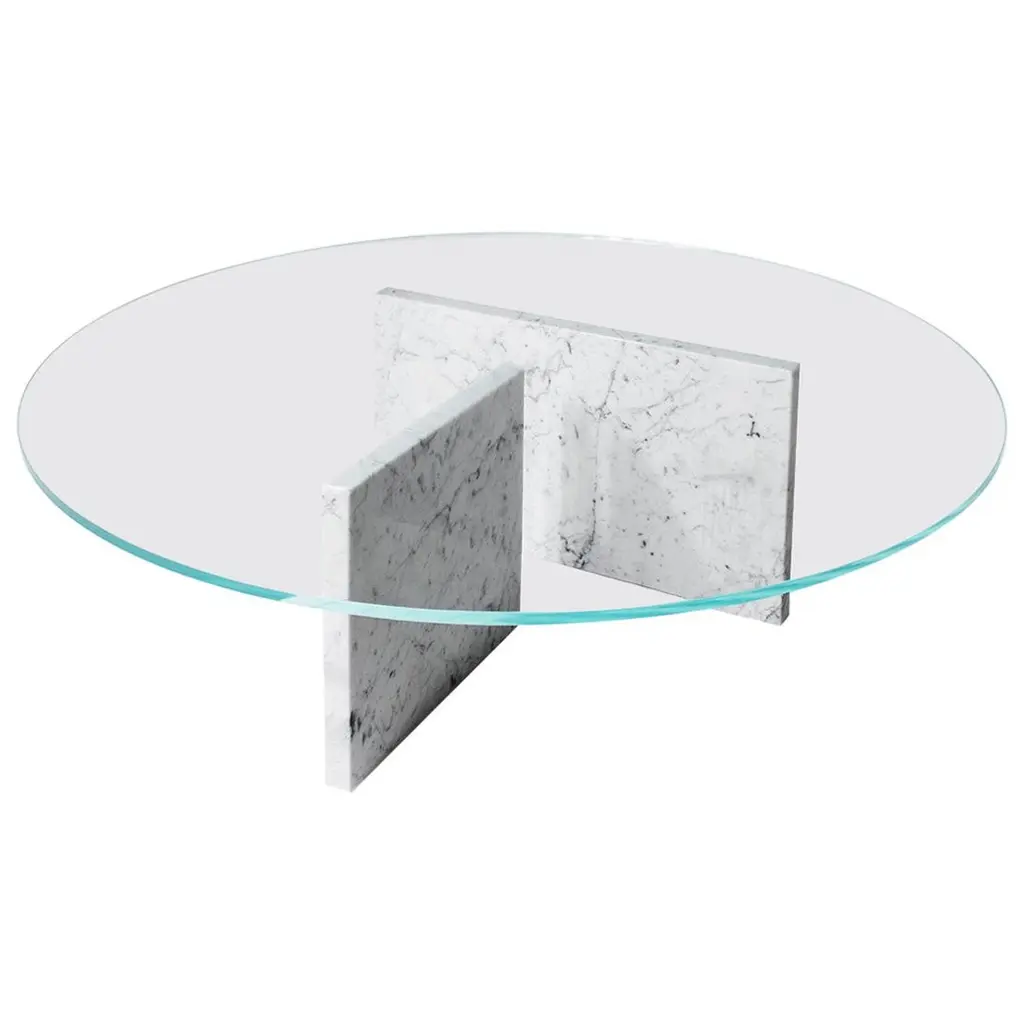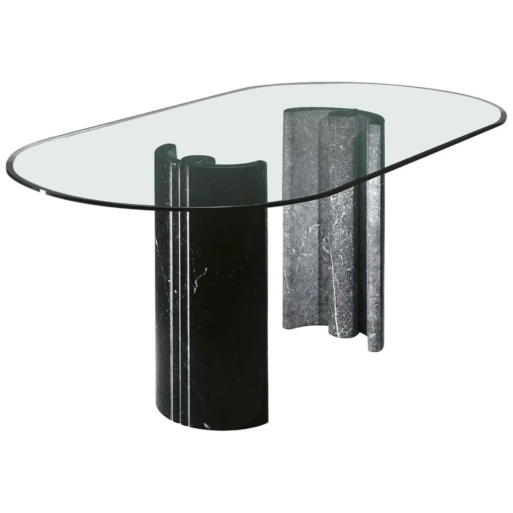 Roll is Epònimo’s central stem dining table. The base, carved from a single block of marble, is a geometric and yet organic sculpture that changes dramatically when viewed from different angles. Functionally it supports a thick but clear glass top which maintains a perfect visual balance with the marble volume below without hindering the view of it. With our standard glass top our roll table seats 8 people.New Saint Laurent marble and 15 mm extra-clear tempered glass. Other stones are available upon request.