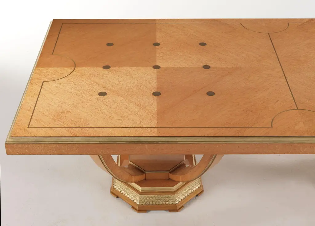 Pleasure is a line of furnishings characterized by an elegant and refined charm. The dining table of the collection, with an art deco design, features a sculptural base, while the top is embellished by brass inlays. The details in patinated antiqued gold complete the ensemble with a precious touch.Pleasure Dining table with structure in erable bird's eye maple. Top with brass inlays. Details are finished in antique gold with patina JG286.