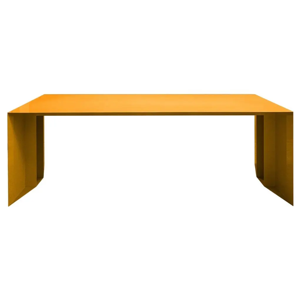 An iron origami that seems light, a game of cross shaped forms and surfaces of any geometric shape define this collection of tables, characterized by a feature common to all my protects: colour.The cross shaped base fits any shape of top, all produced with a 3mm metal plate of customizable colour, a project in the making, a construction game in which the end user is free to create their own custom table, a project within a project.The top could be Oval, elliptical, Rectangular, Squared with a custom made dimensions. Legs and Top are separated to be shipped in easy way. Customer can choose any color from Ral Code. Separate colors of legs and top is always possible.