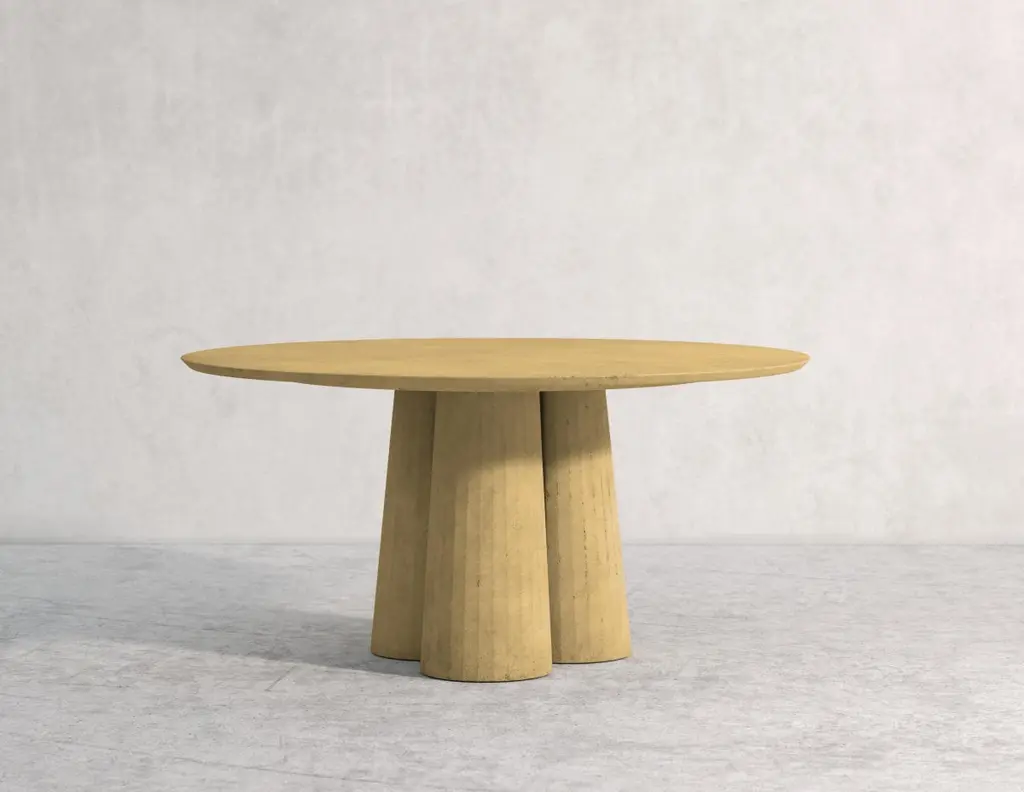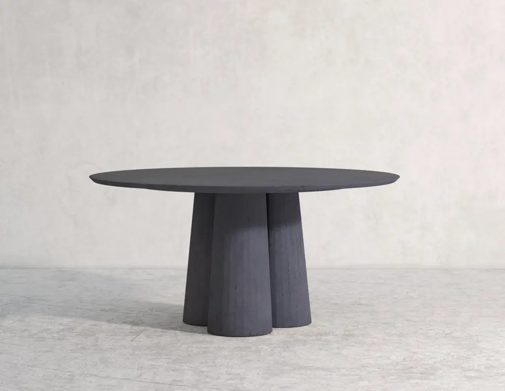 Rounded shape dining table part of a collection of modular system in ultra-high performing cement mortar. UHPC tabletop and base colored in the mixture and sandblasted. Available in eight different colors: Brick, silver, powder, cream, fir, dark, chocolate, ink and ultra marine. Each item is hand treated and is protected with water repellent products to reduce the absorption of oily substances and to minimize the making of stains.Surrealism, primitivism, metaphysics and brutalism. Art together with architecture and design build a scenario of inspirations and continuous references through which the material rises to an expressive language, ready to welcome and rework formal suggestions of different origins.Fusto is the series that introduces the new design approach. As in classical architecture, Fusto is the column that holds tables, consoles, bookcases and pedestals. Volumes and proportions are integrated in a timeless geometry, enriched with facets that make the color vibrate in a game of lights and shadows.Fusto is eternal architecture. Our products are easily recognizable by the exclusive treatment of the material and the passionate quest for lightness and style.The artisanal handicraft, the use of modern materials and innovative techniques, with a completely “Made in Italy” production, further enhances the prestige of Italian design.