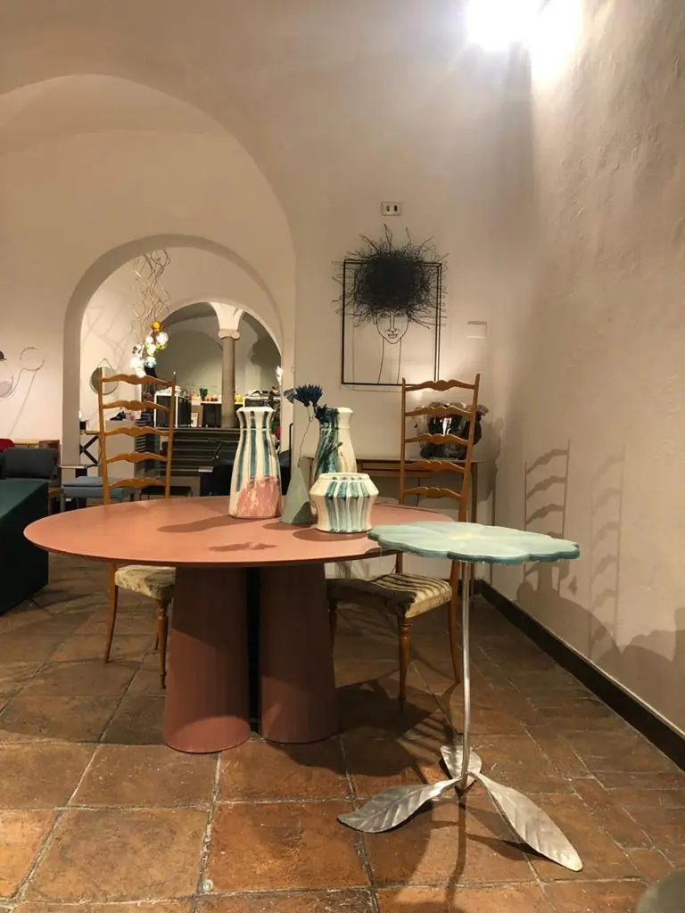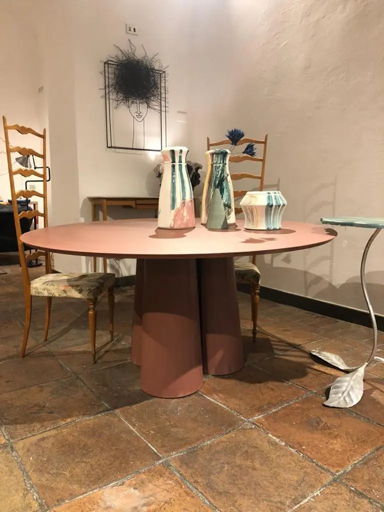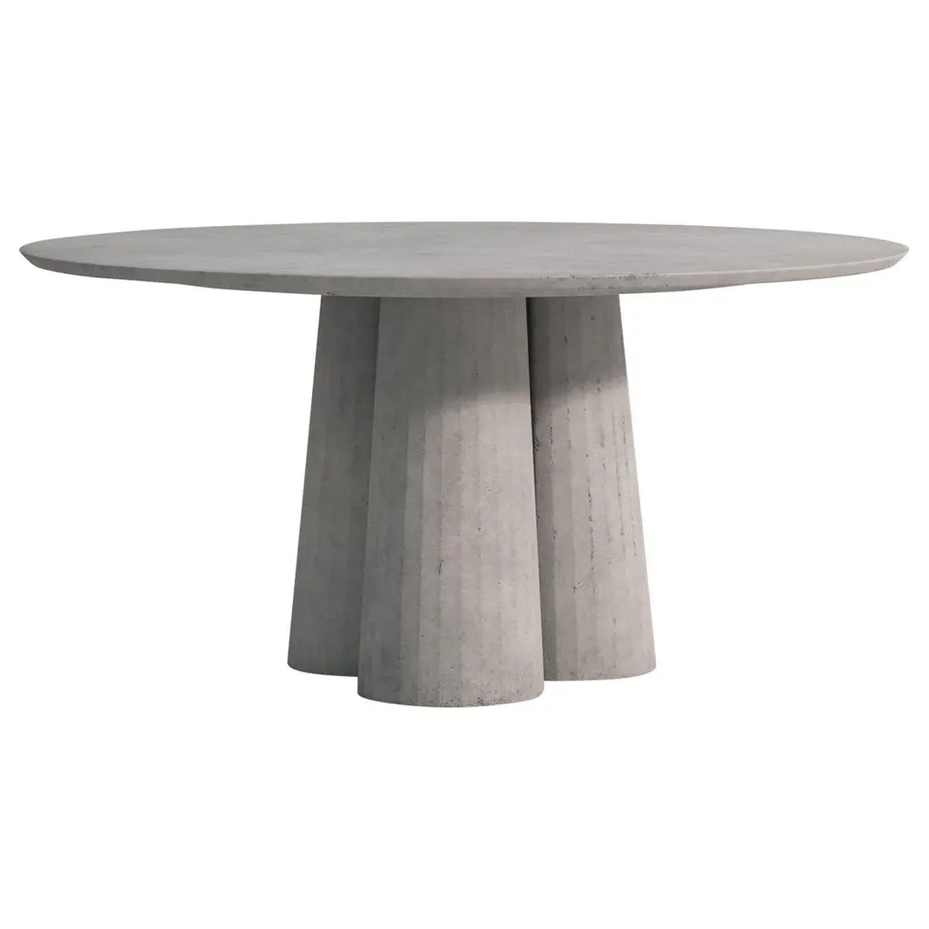 Rounded shape dining table part of a collection of modular system in ultra-high performing cement mortar. UHPC tabletop and base colored in the mixture and sandblasted. Available in eight different colors: Brick, silver, powder, cream, fir, dark, chocolate, ink and ultra marine. Each item is hand treated and is protected with water repellent products to reduce the absorption of oily substances and to minimize the making of stains.Surrealism, primitivism, metaphysics and brutalism. Art together with architecture and design build a scenario of inspirations and continuous references through which the material rises to an expressive language, ready to welcome and rework formal suggestions of different origins.Fusto is the series that introduces the new design approach. As in classical architecture, Fusto is the column that holds tables, consoles, bookcases and pedestals. Volumes and proportions are integrated in a timeless geometry, enriched with facets that make the color vibrate in a game of lights and shadows.Fusto is eternal architecture. Our products are easily recognizable by the exclusive treatment of the material and the passionate quest for lightness and style.The artisanal handicraft, the use of modern materials and innovative techniques, with a completely “Made in Italy” production, further enhances the prestige of Italian design.