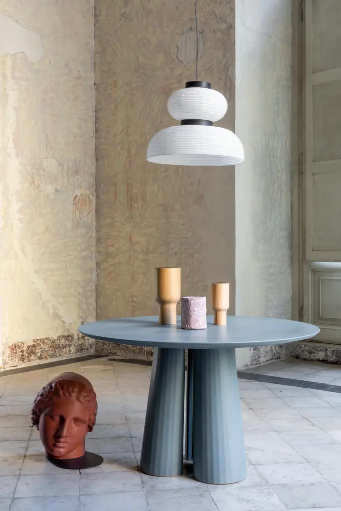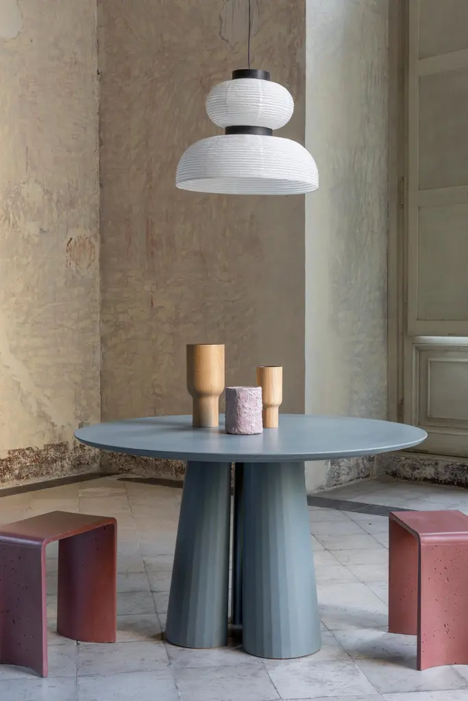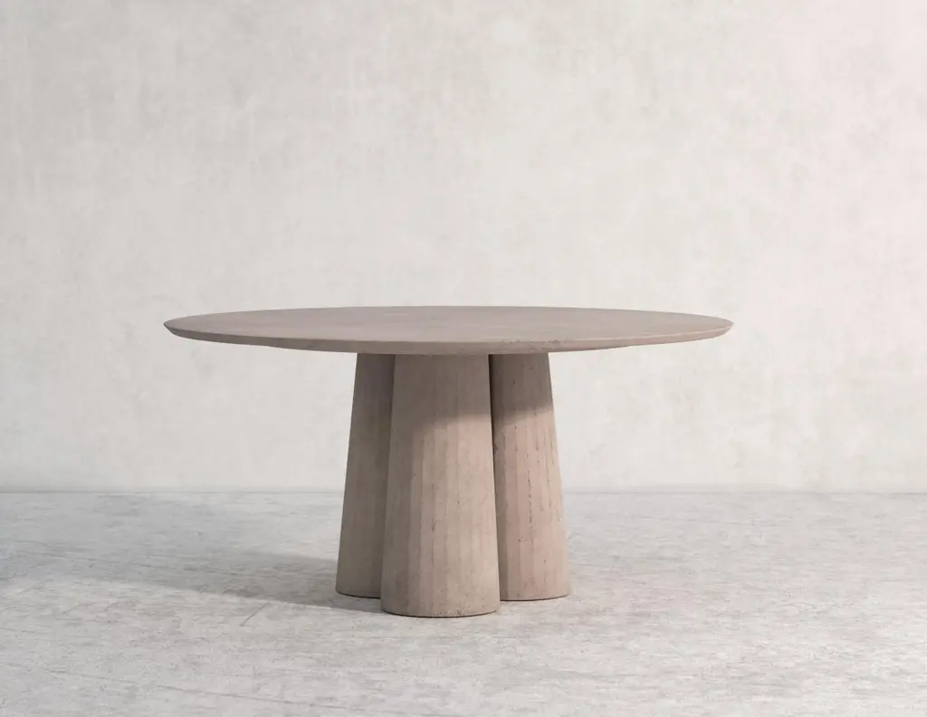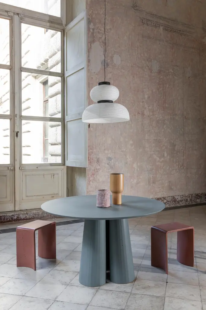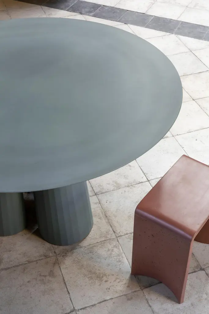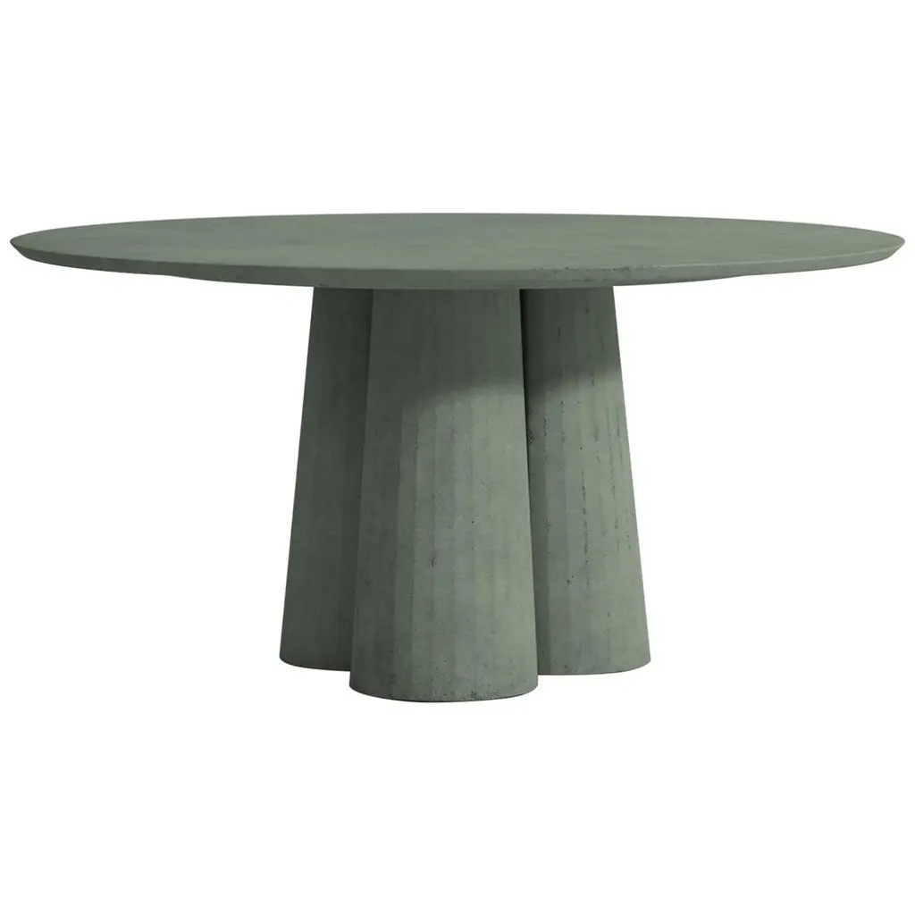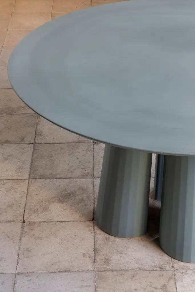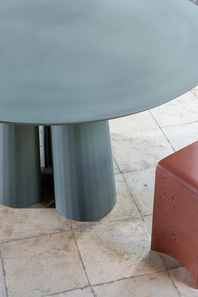 Rounded shape dining table part of a collection of modular system in ultra-high performing cement mortar. UHPC tabletop and base colored in the mixture and sandblasted. Available in eight different colors: Brick, silver, powder, cream, fir, dark, chocolate, ink and ultra marine. Each item is hand treated and is protected with water repellent products to reduce the absorption of oily substances and to minimize the making of stains.Surrealism, primitivism, metaphysics and brutalism. Art together with architecture and design build a scenario of inspirations and continuous references through which the material rises to an expressive language, ready to welcome and rework formal suggestions of different origins.Fusto is the series that introduces the new design approach. As in classical architecture, Fusto is the column that holds tables, consoles, bookcases and pedestals. Volumes and proportions are integrated in a timeless geometry, enriched with facets that make the color vibrate in a game of lights and shadows.Fusto is eternal architecture. Our products are easily recognizable by the exclusive treatment of the material and the passionate quest for lightness and style.The artisanal handicraft, the use of modern materials and innovative techniques, with a completely “Made in Italy” production, further enhances the prestige of Italian design.Each piece is a unique, made by hand. No two are the same.