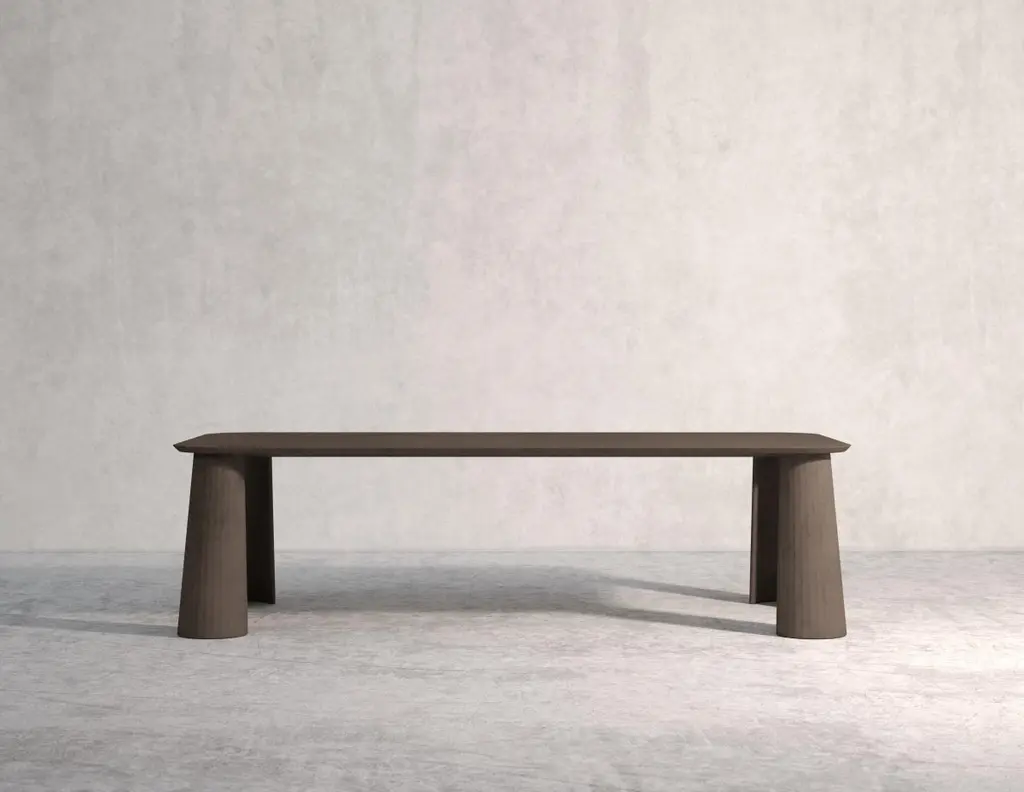Rectangular shape dining table part of a collection of modular system in ultra-high performing cement mortar. UHPC tabletop and base colored in the mixture and sandblasted. Available in eight different colors: Brick, silver, powder, cream, fir, dark, chocolate, ink and ultramarine. Each item is hand treated and is protected with water repellent products to reduce the absorption of oily substances and to minimize the making of stains.Surrealism, primitivism, metaphysics and brutalism. Art together with architecture and design build a scenario of inspirations and continuous references through which the material rises to an expressive language, ready to welcome and rework formal suggestions of different origins.Fusto is the series that introduces the new design approach. As in classical architecture, Fusto is the column that holds tables, consoles, bookcases and pedestals. Volumes and proportions are integrated in a timeless geometry, enriched with facets that make the color vibrate in a game of lights and shadows.Fusto is eternal architecture. Our products are easily recognizable by the exclusive treatment of the material and the passionate quest for lightness and style.The range of colors presented is indicative and may be subject to technically unavoidable tone tolerances caused by the moment in which the pieces are casted.The artisanal handicraft, the use of modern materials and innovative techniques, with a completely “Made in Italy” production, further enhances the prestige of Italian design.