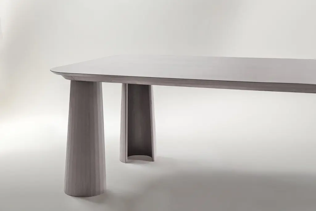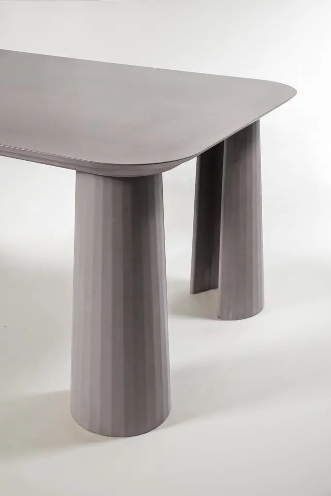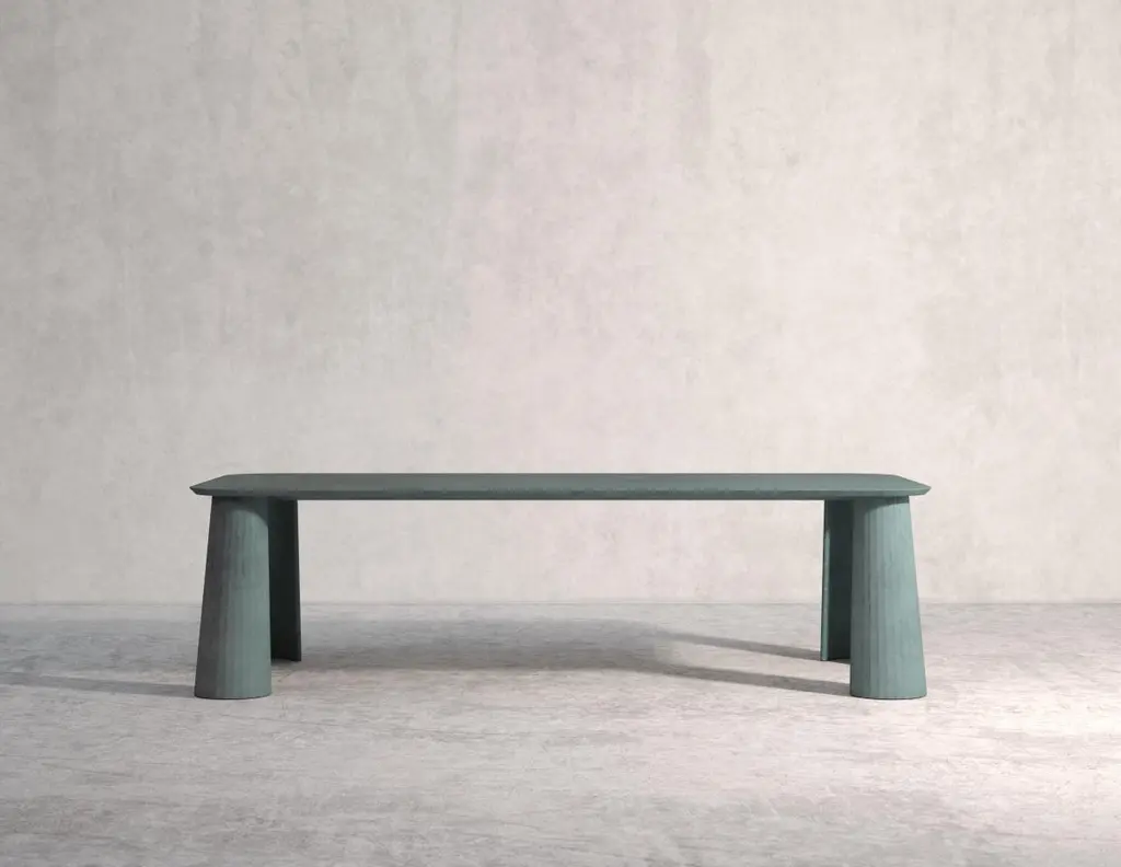 Rectangular shape dining table part of a collection of modular system in ultra-high performing cement mortar. UHPC tabletop and base colored in the mixture and sandblasted. Available in eight different colors: Brick, silver, powder, cream, fir, dark, chocolate, ink and ultra marine. Each item is hand treated and is protected with water repellent products to reduce the absorption of oily substances and to minimize the making of stains.Surrealism, primitivism, metaphysics and brutalism. Art together with architecture and design build a scenario of inspirations and continuous references through which the Material rises to an expressive language, ready to welcome and rework formal suggestions of different origins.Fusto is the series that introduces the new design approach. As in classical architecture, Fusto is the column that holds tables, consoles, bookcases and pedestals. Volumes and proportions are integrated in a timeless geometry, enriched with facets that make the color vibrate in a game of lights and shadows.Fusto is eternal architecture. Our products are easily recognizable by the exclusive treatment of the Material and the passionate quest for lightness and style. Any imperfections on the surface such as chromatic variations, porosity, fine cracks, and granulations of different colors are characteristics of the Material and of the artisan process;for this reason they are not to be considered defects.The artisanal handicraft, the use of modern materials and innovative techniques, with a completely “Made in Italy” production, further enhances the prestige of Italian design.
