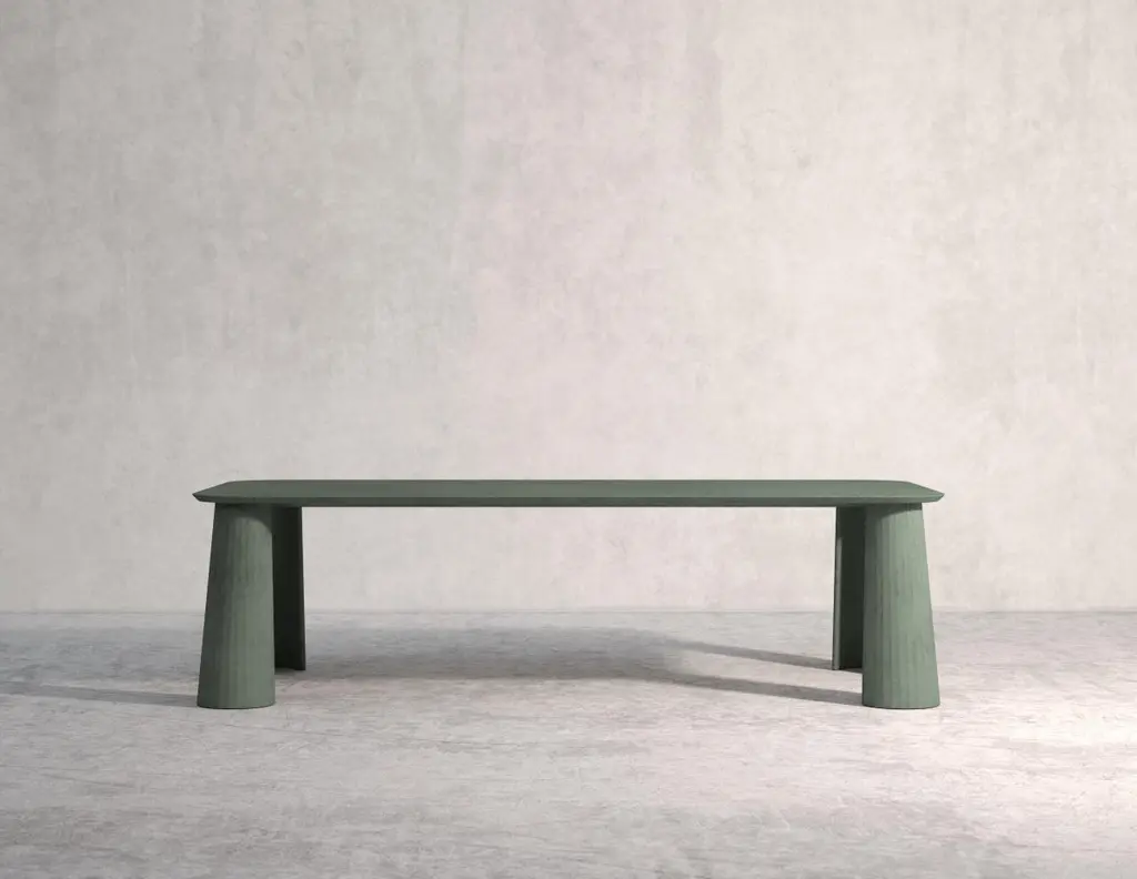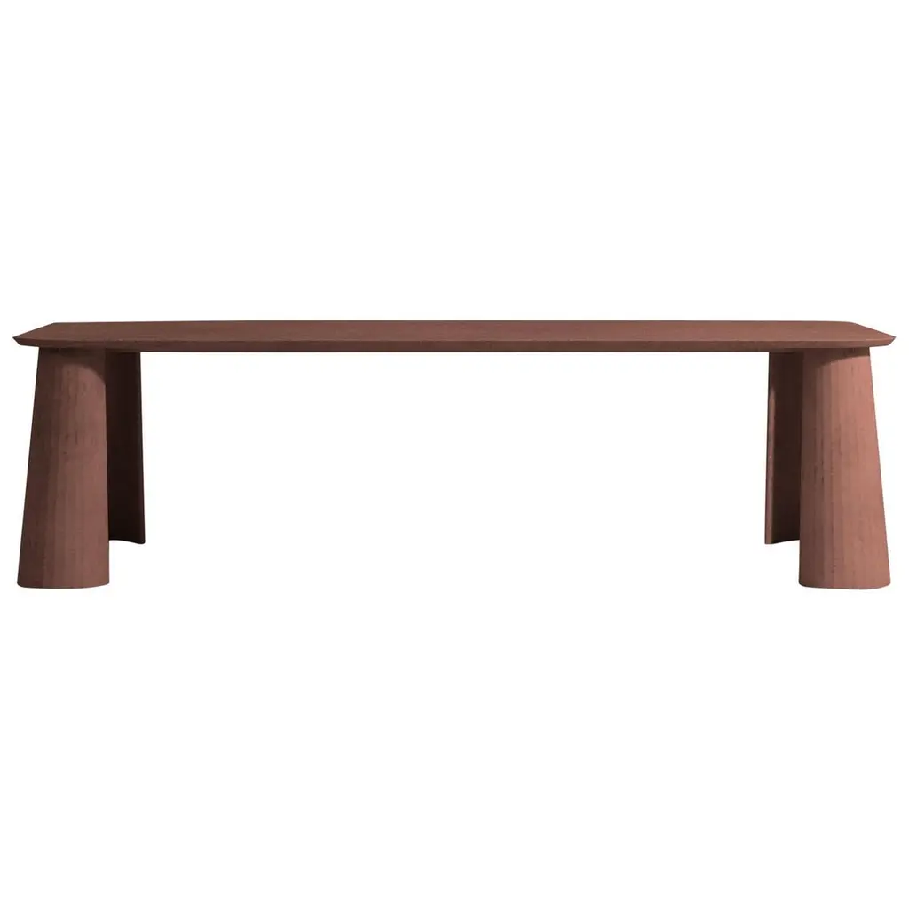 Rectangular shape dining table part of a collection of modular system in ultra-high performing cement mortar. UHPC tabletop and base colored in the mixture and sandblasted. Available in eight different colors: Brick, silver, powder, cream, fir, dark, chocolate, ink and ultra marine. Each item is hand treated and is protected with water repellent products to reduce the absorption of oily substances and to minimize the making of stains.Surrealism, primitivism, metaphysics and brutalism. Art together with architecture and design build a scenario of inspirations and continuous references through which the material rises to an expressive language, ready to welcome and rework formal suggestions of different origins.Fusto is the series that introduces the new design approach. As in classical architecture, Fusto is the column that holds tables, consoles, bookcases and pedestals. Volumes and proportions are integrated in a timeless geometry, enriched with facets that make the color vibrate in a game of lights and shadows.Fusto is eternal architecture. Our products are easily recognizable by the exclusive treatment of the material and the passionate quest for lightness and style.The artisanal handicraft, the use of modern materials and innovative techniques, with a completely “Made in Italy” production, further enhances the prestige of Italian design.