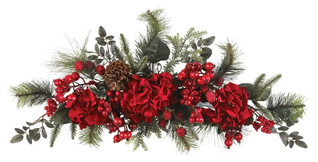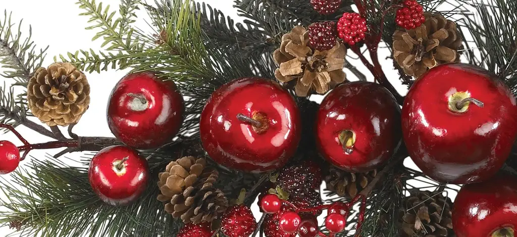 Create a vibrant splash in your home or office d_cor with this stunning apple, pine, and berry swag. Perfect for the holiday season, this colorful work of art contains a mix of juicy red apples and plump ripe berries surrounded by lush pine foliage. This finely crafted design adds a touch authentic beauty to any room it graces. A full 2.5 feet in length, it's the perfect size to drape across a fireplace mantle or dining room table.