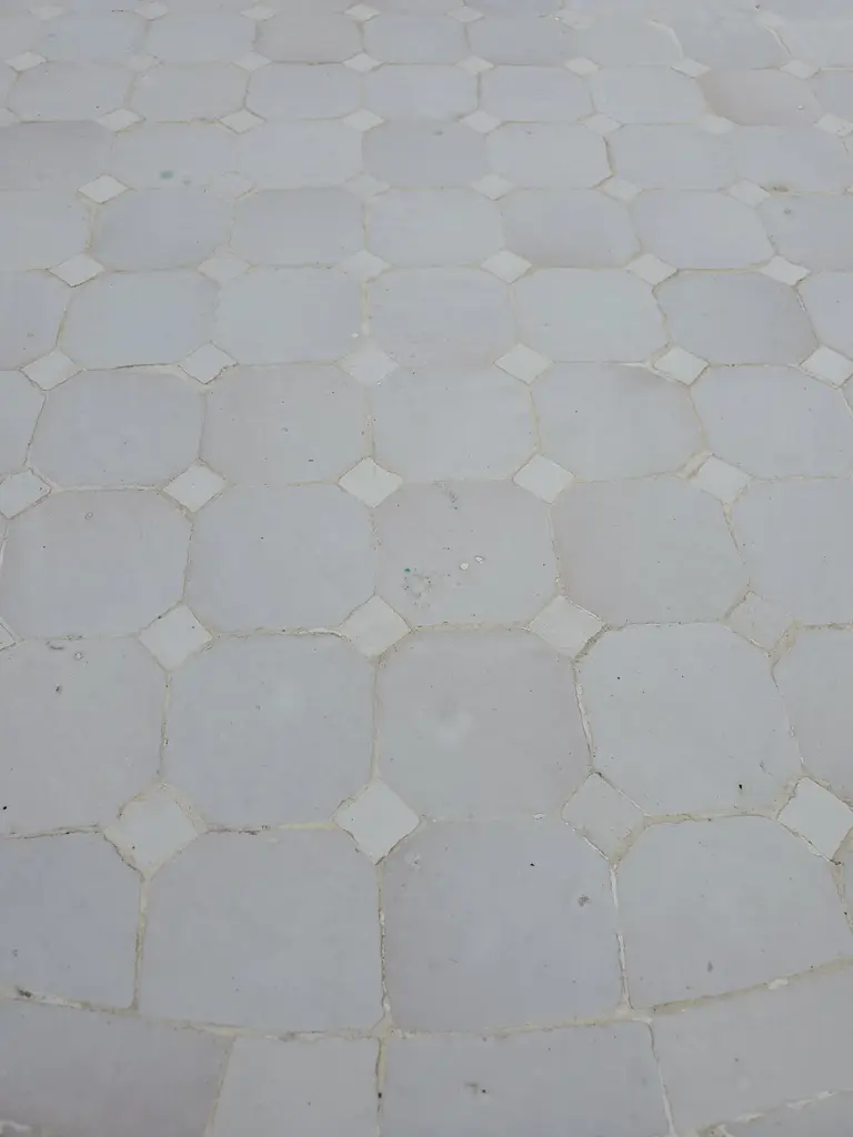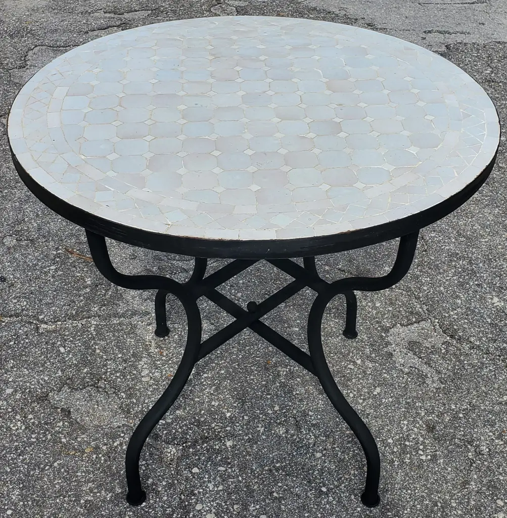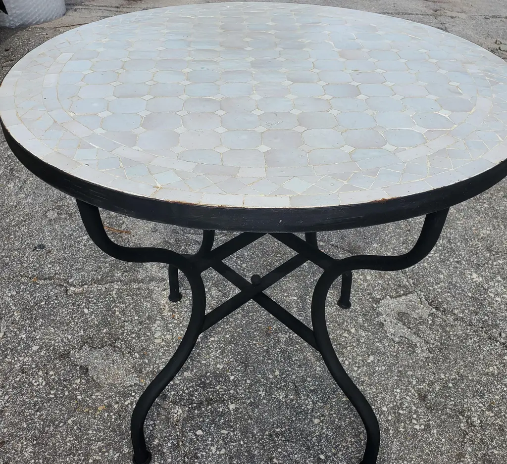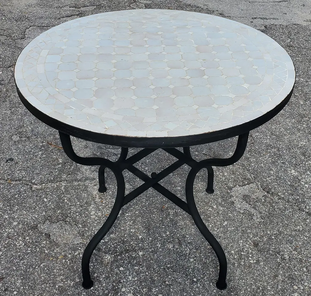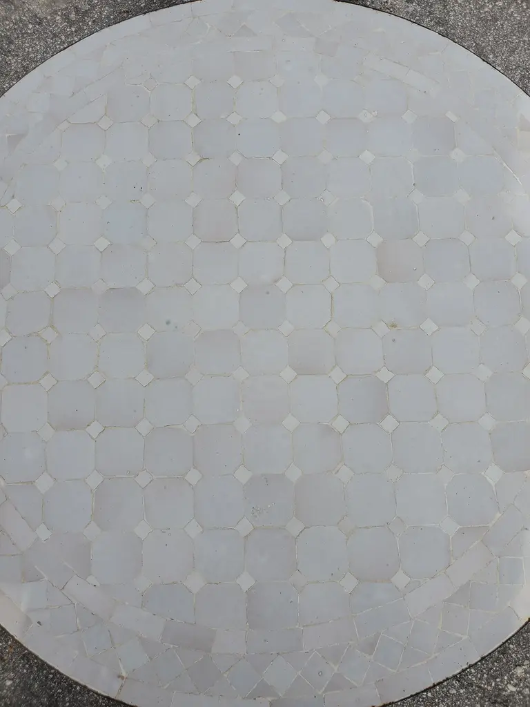 Amazing all white custom made Moroccan mosaic table measuring 32" in diameter and 29" in height. An indoor / outdoor dining table that sits two to three people. Very intricate design involving the popular CR4 design, a very typical pattern known to Morocco for centuries. This tabletop is also eligible for coffee table height and the base is available. The subtle variations and small flaws in a handmade item are what give it a unique personality and undeniable charm.