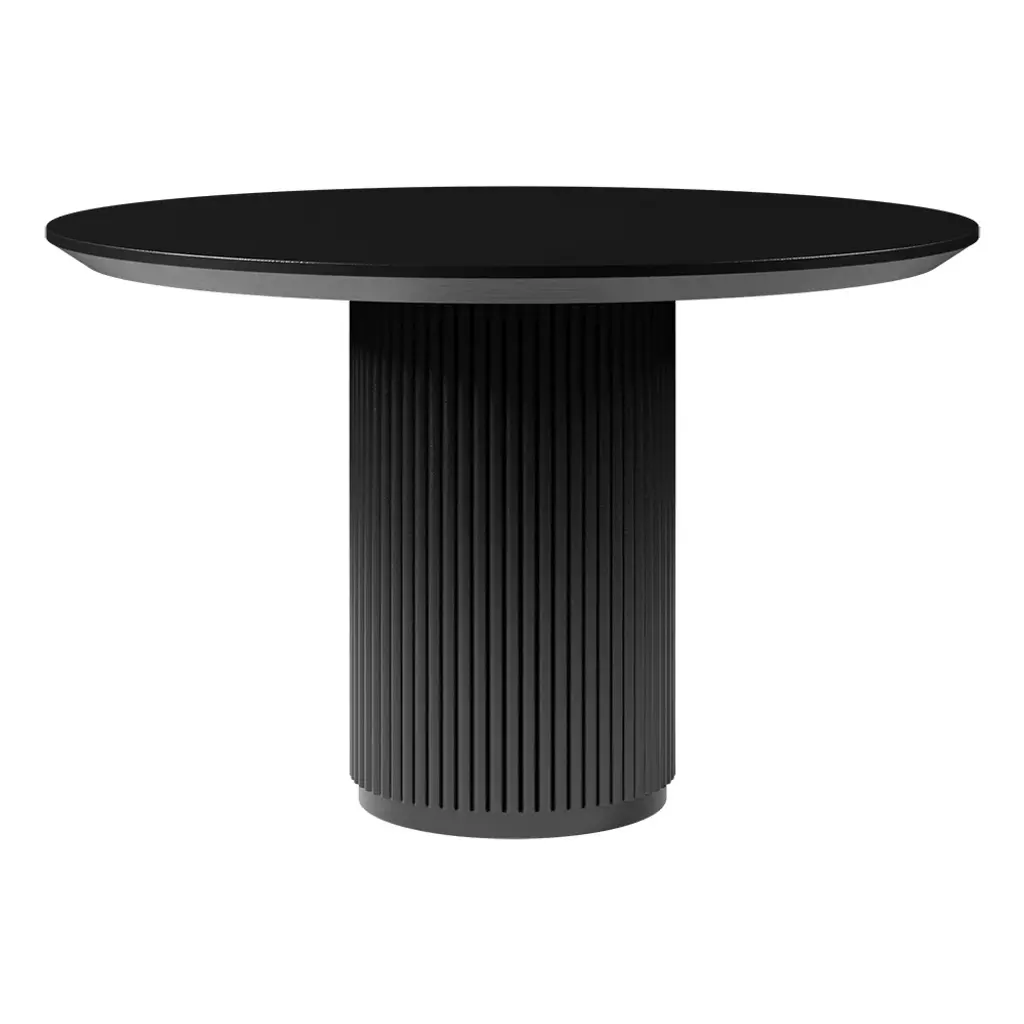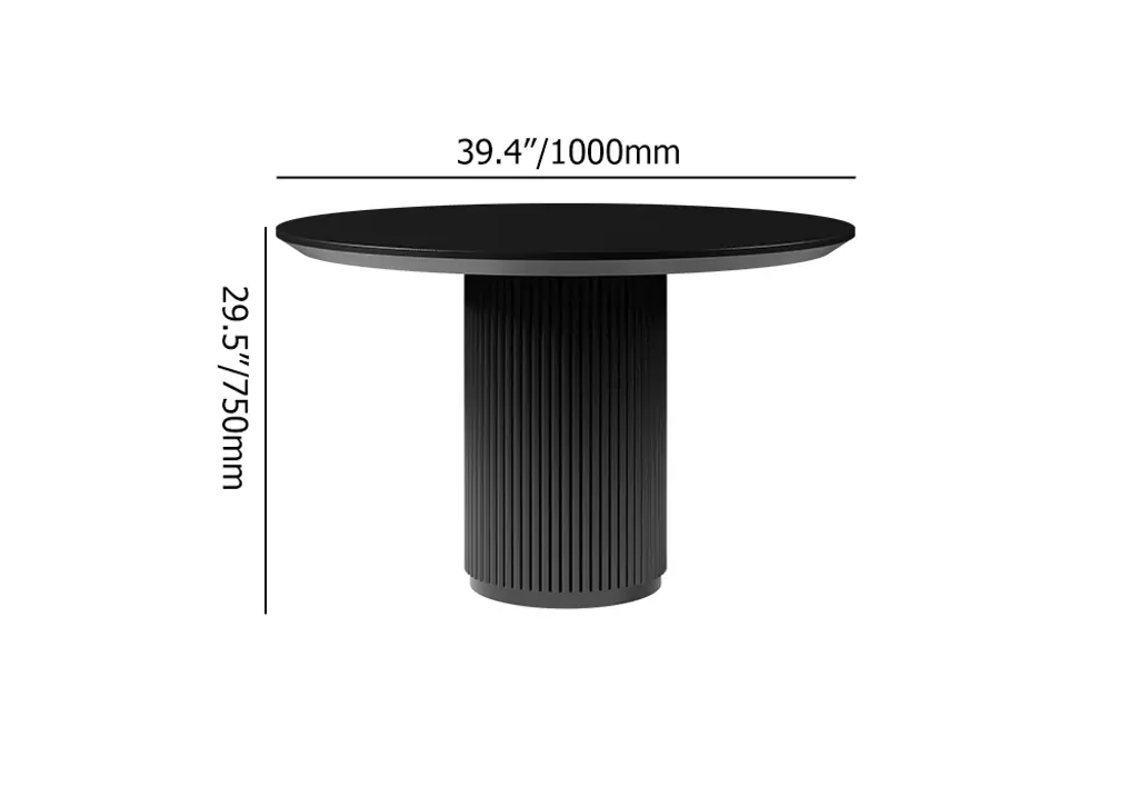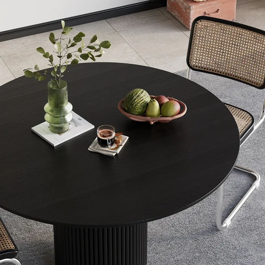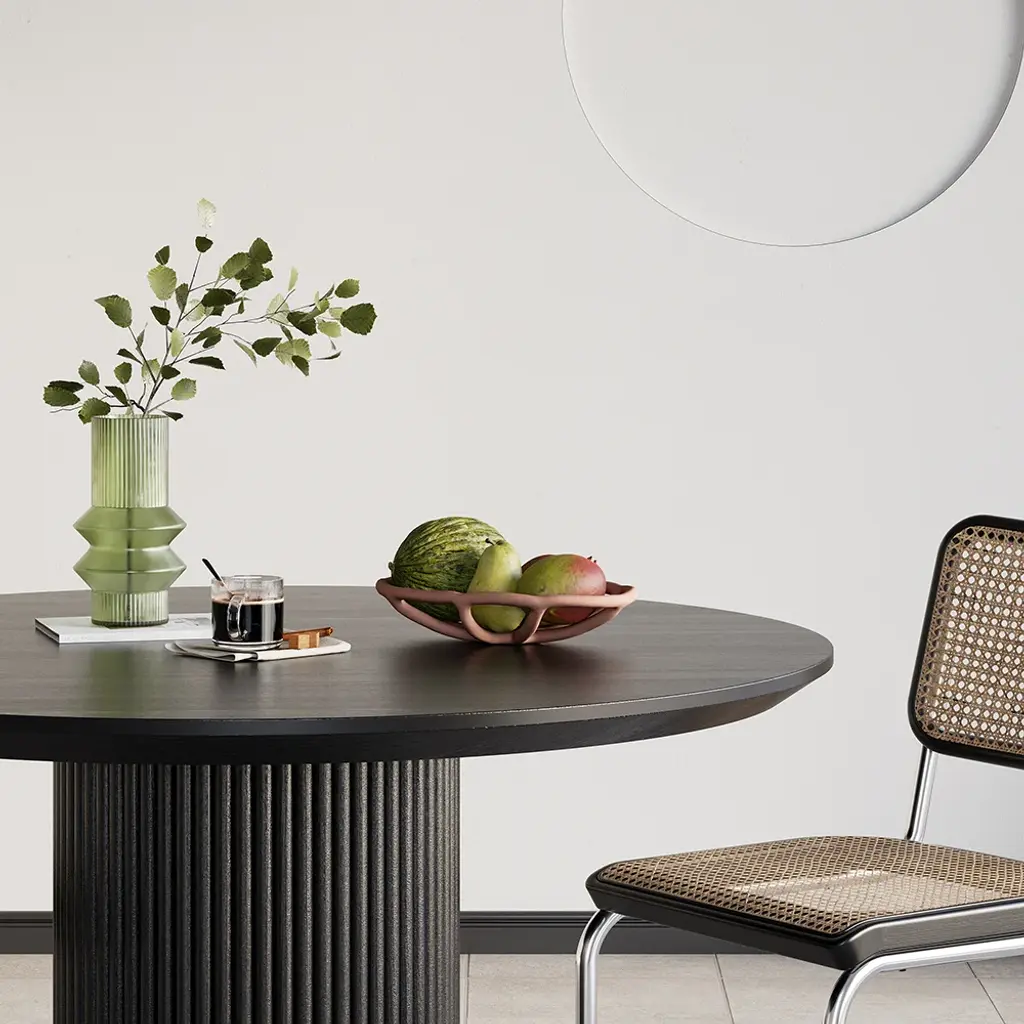 This 39.4" round dining table combines Japandi minimalism with refined elegance, perfect for small dining spaces. Crafted from solid pine with a sleek black finish, its ribbed base offers both visual sophistication and sturdy stability, creating a serene yet stylish dining atmosphere in compact homes.
