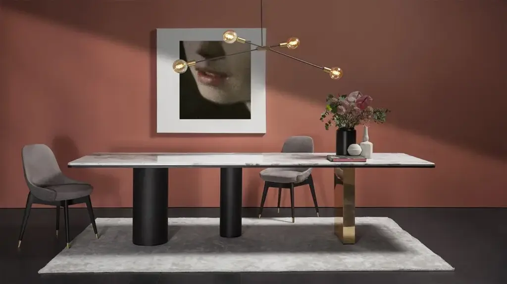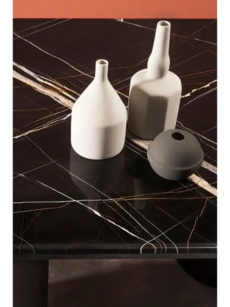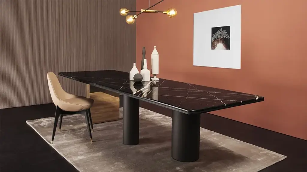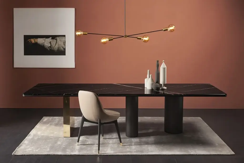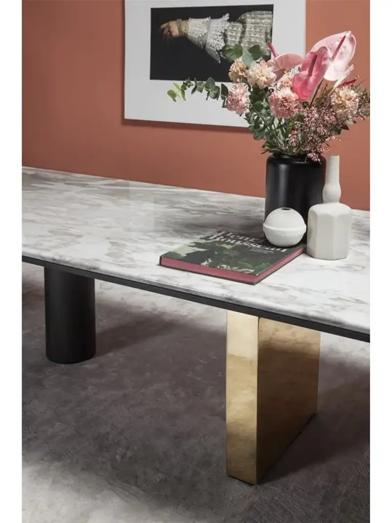 Royal table embodies the elegance of a classical architecture. The base, composed of columns and pillars, together with its top mark the beginning and the end of this line, defining a neat space with great personality and decorative sophistication. Technical featuresGlossy lacquered tableBase: curved multilayer veneered with glossy lacquered oak (see colours RAL on catalog) and composite wood covered with brass.Top: MDF glossy lacquered (see colours RAL on catalog)Underlay: in black walcromat MDF veneered with glossy lacquered oak (see colours RAL on catalog).Table with marble topBase: curved multilayer veneered with oak dyed umbra grey and composite wood covered with brass.Top: marble (see catalog)Underlay: in black walcromat MDF veneered with oak dyed umbra grey.