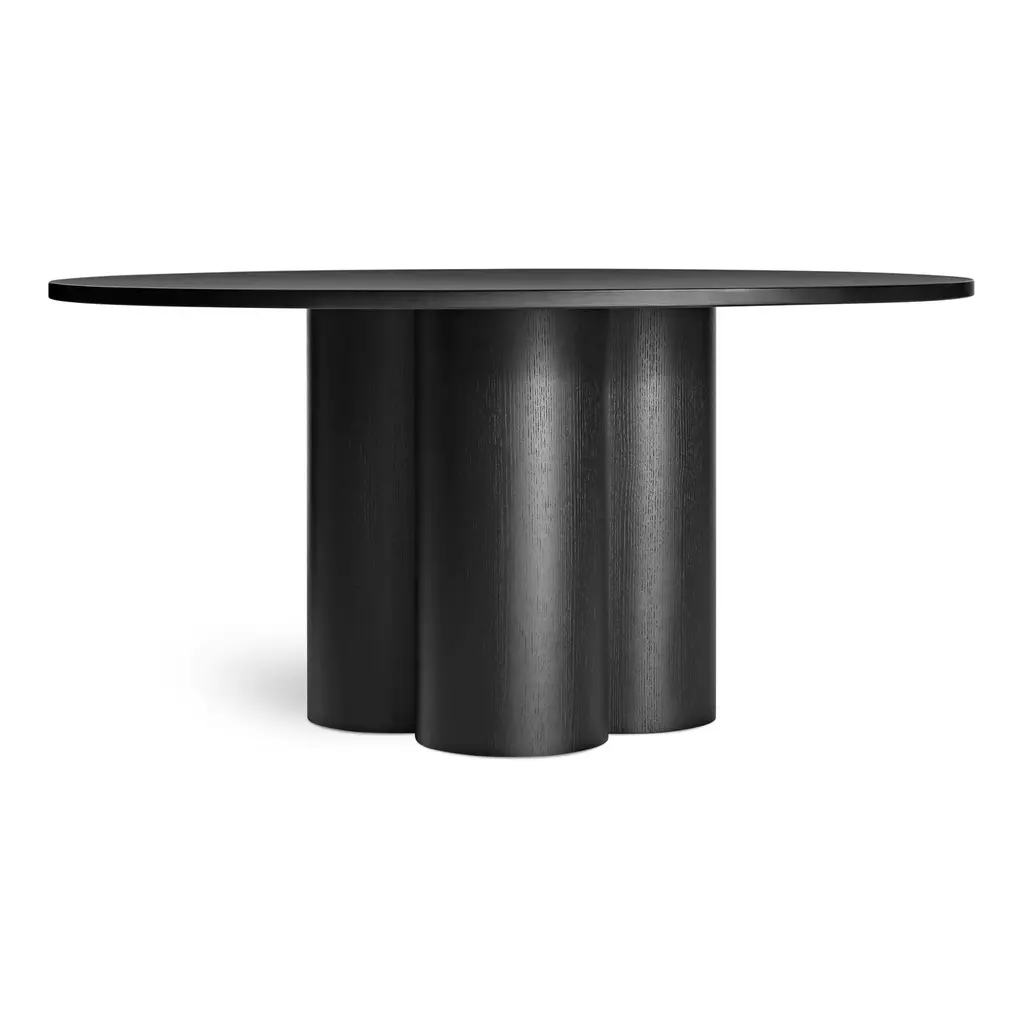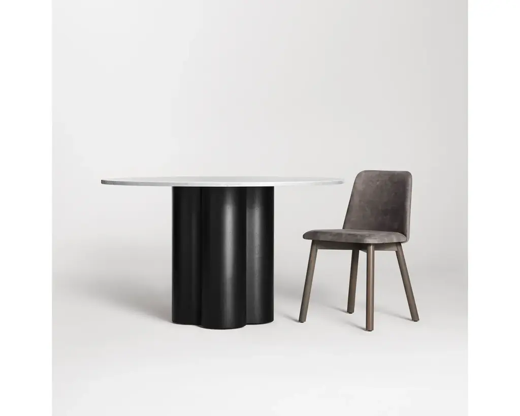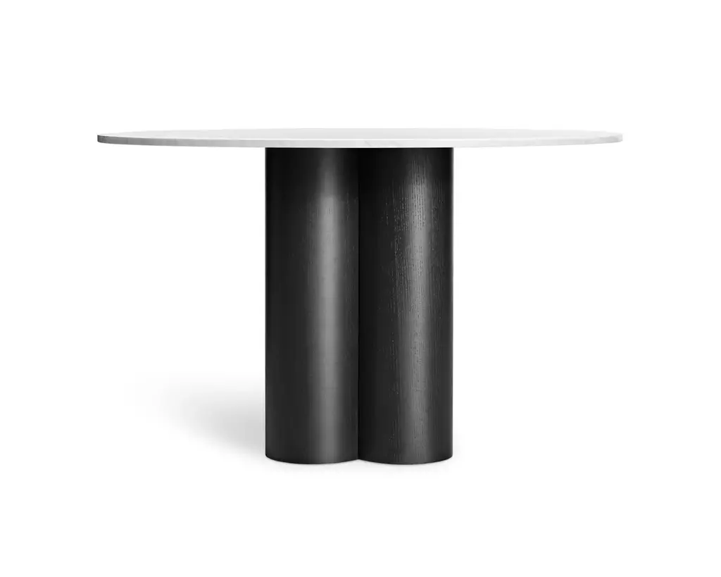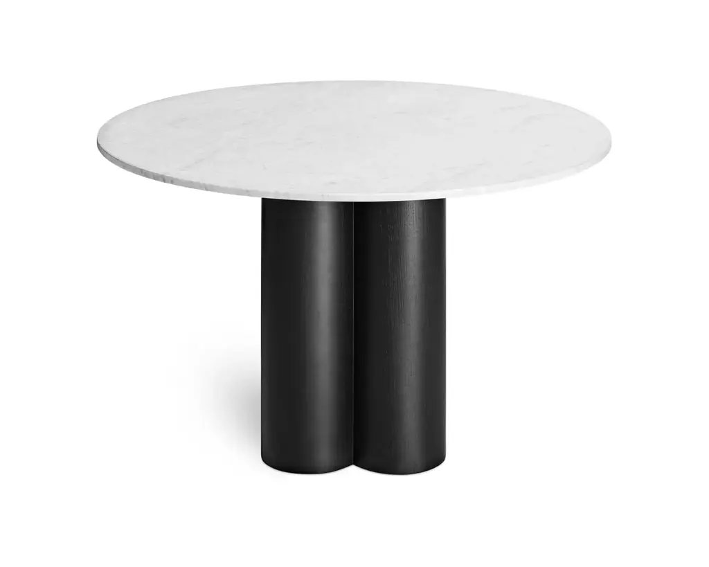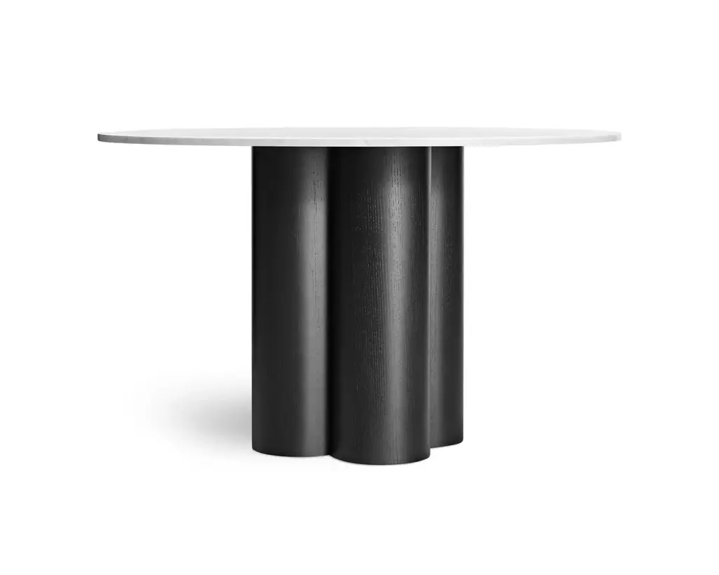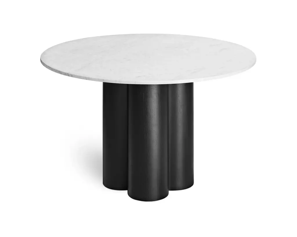 Four pillars merge to create a beguiling combination of forms and a chunky, yet elegant clover-shaped pedestal. Top it off with a hefty slab of wood or honed Carrara marble followed by a five-course feast. Minimal and delightful, anyway you slice it. Also