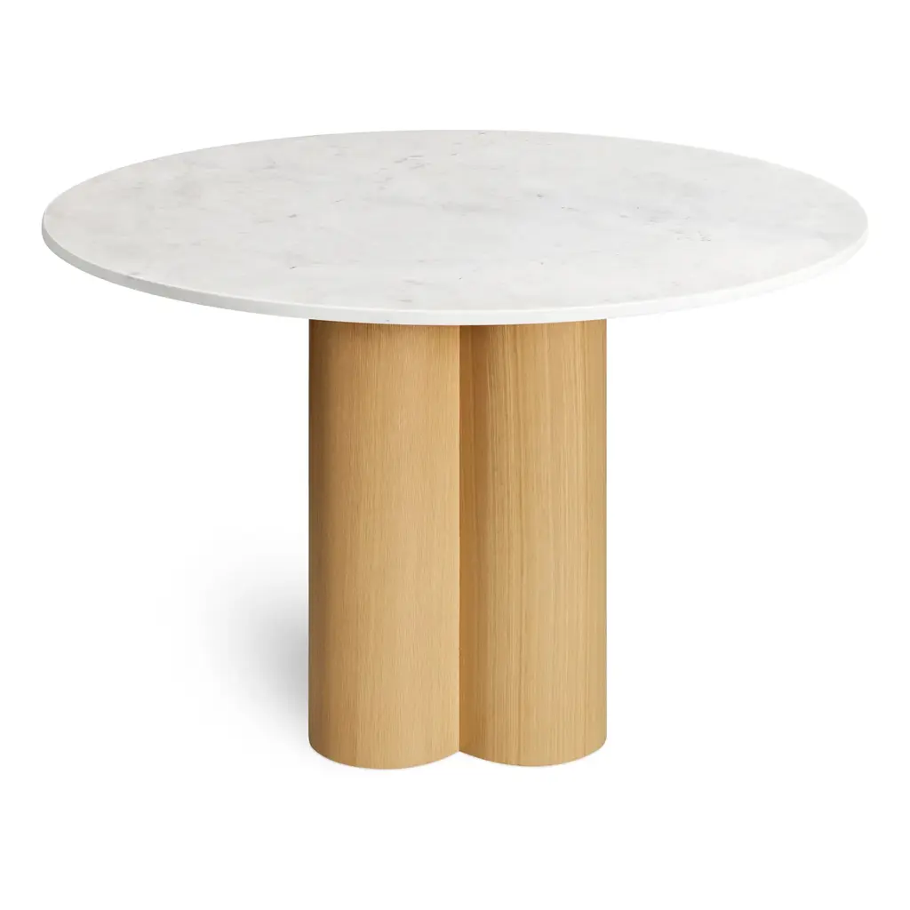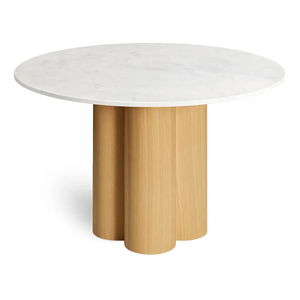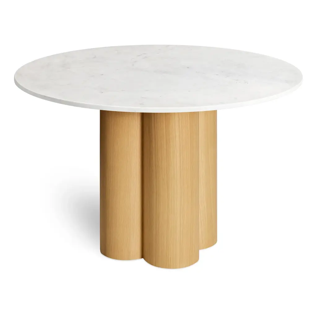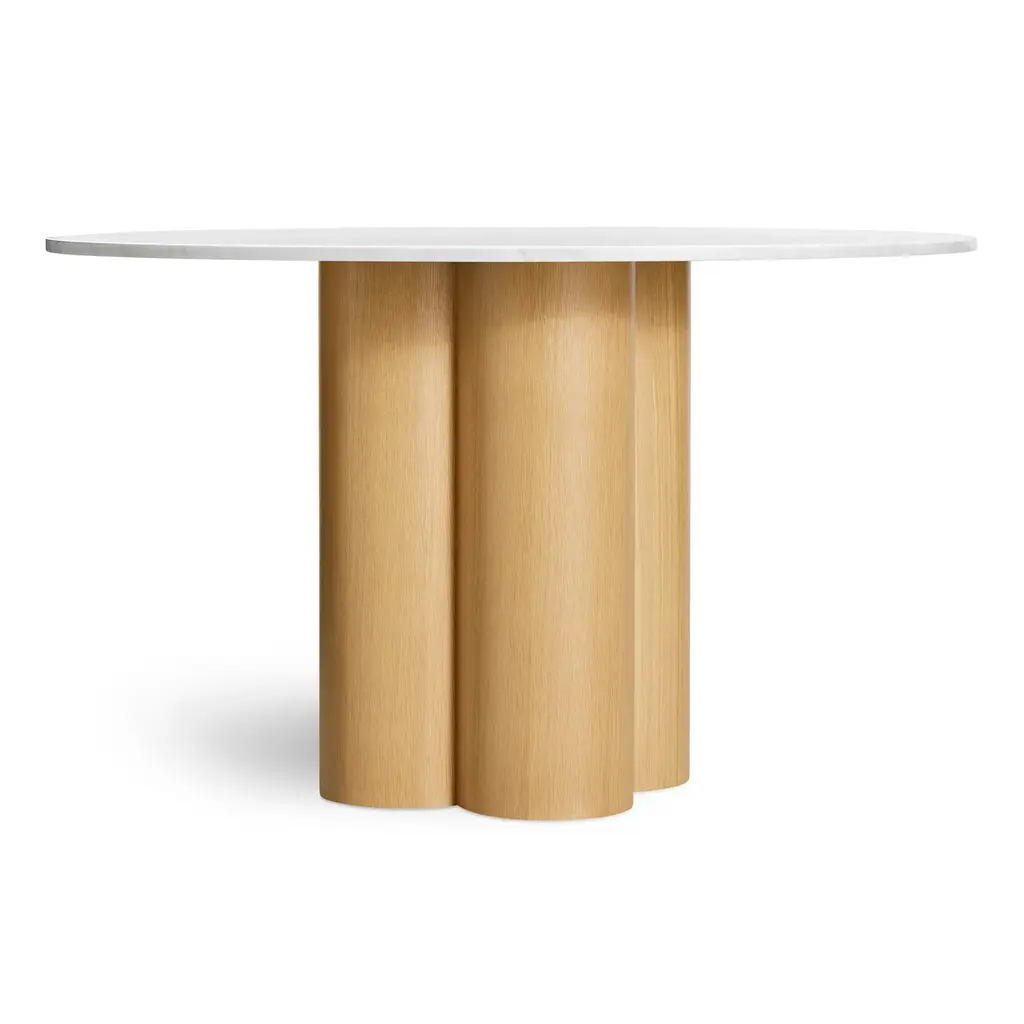 Four pillars merge to create a beguiling combination of forms and a chunky, yet elegant clover-shaped pedestal. Top it off with a hefty slab of wood or Banswara marble followed by a five-course feast. Minimal and delightful, anyway you slice it.