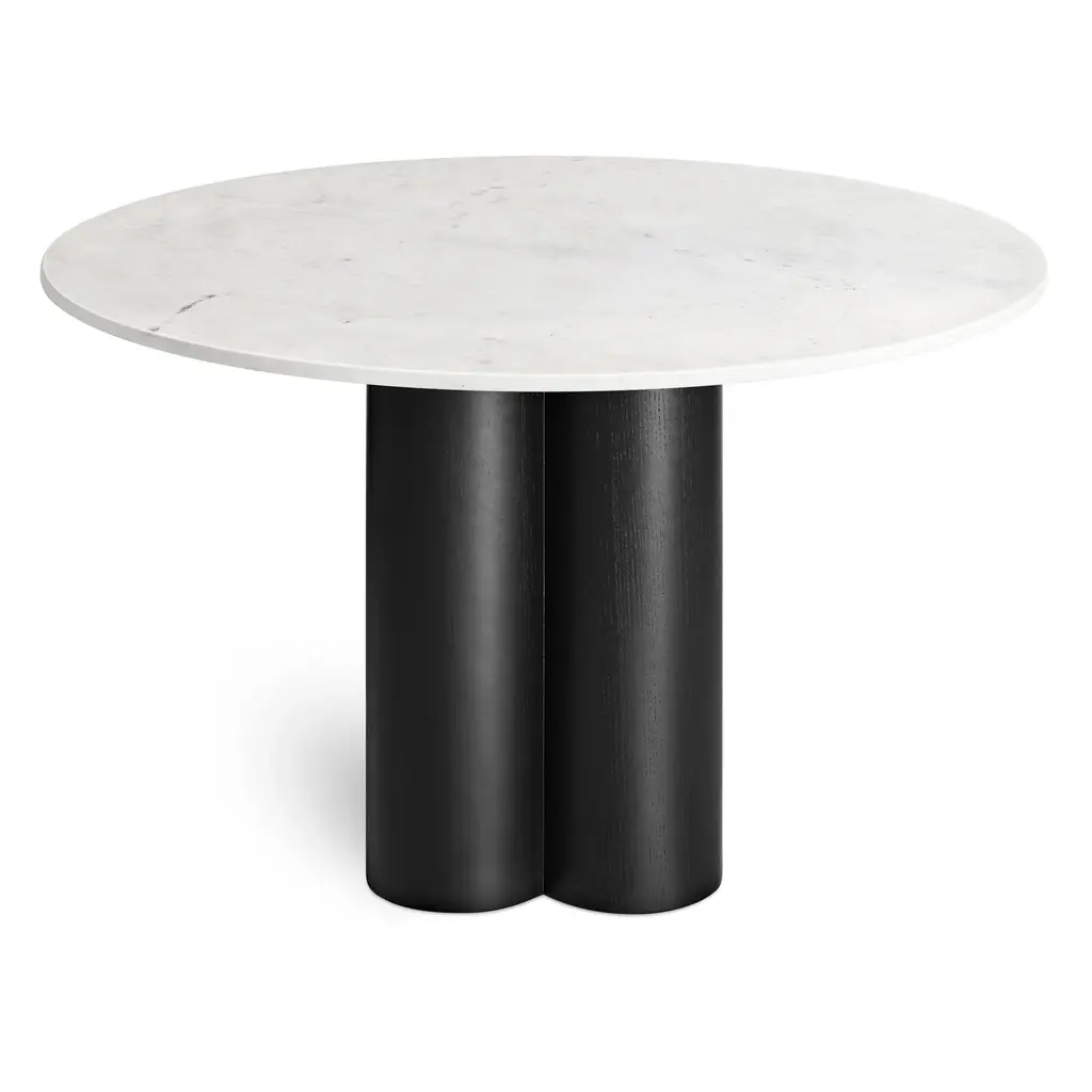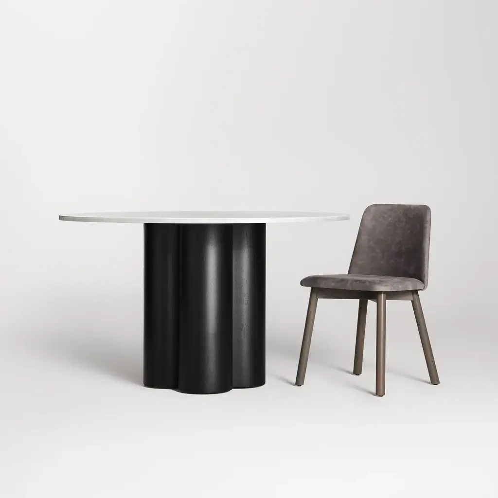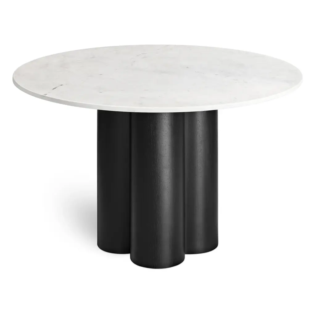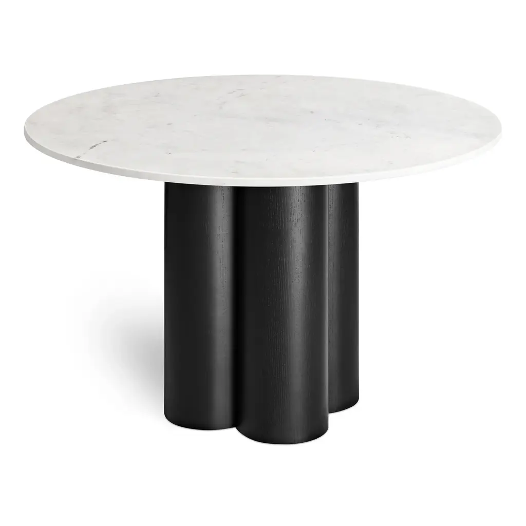 Four pillars merge to create a beguiling combination of forms and a chunky, yet elegant clover-shaped pedestal. Top it off with a hefty slab of wood or Banswara marble followed by a five-course feast. Minimal and delightful, anyway you slice it.