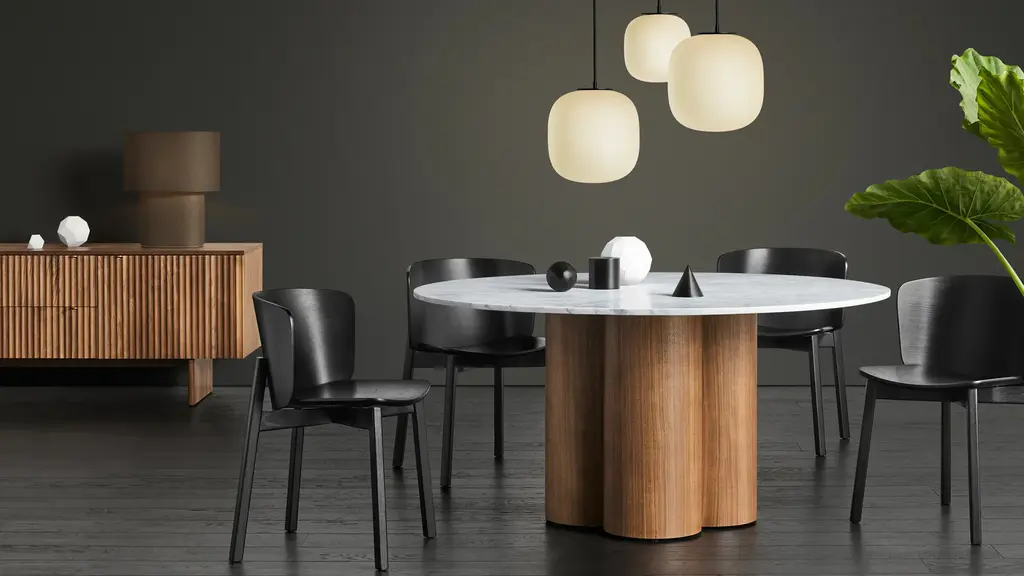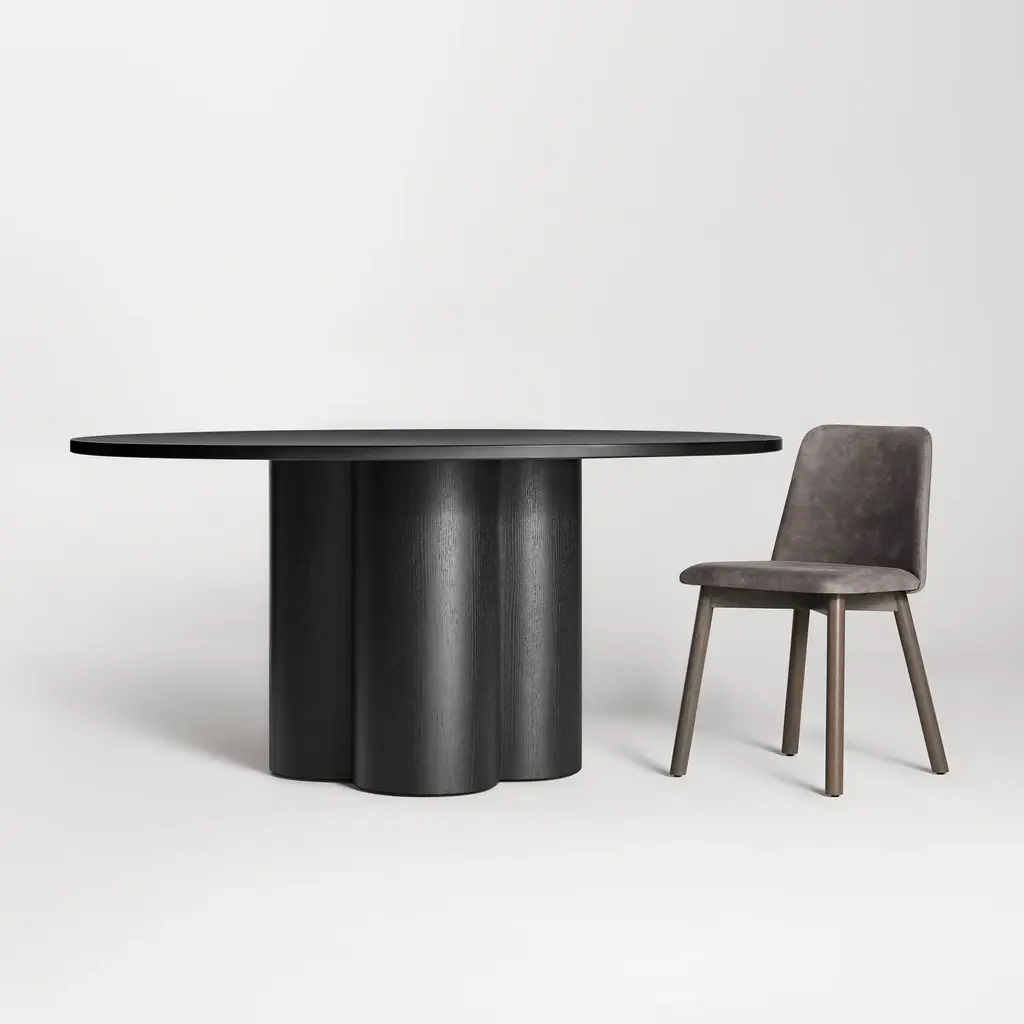 Four pillars merge to create a beguiling combination of forms and a chunky, yet elegant clover-shaped pedestal. Top it off with a hefty slab of wood or Banswara marble followed by a five-course feast. Minimal and delightful, anyway you slice it.