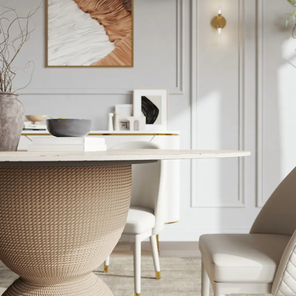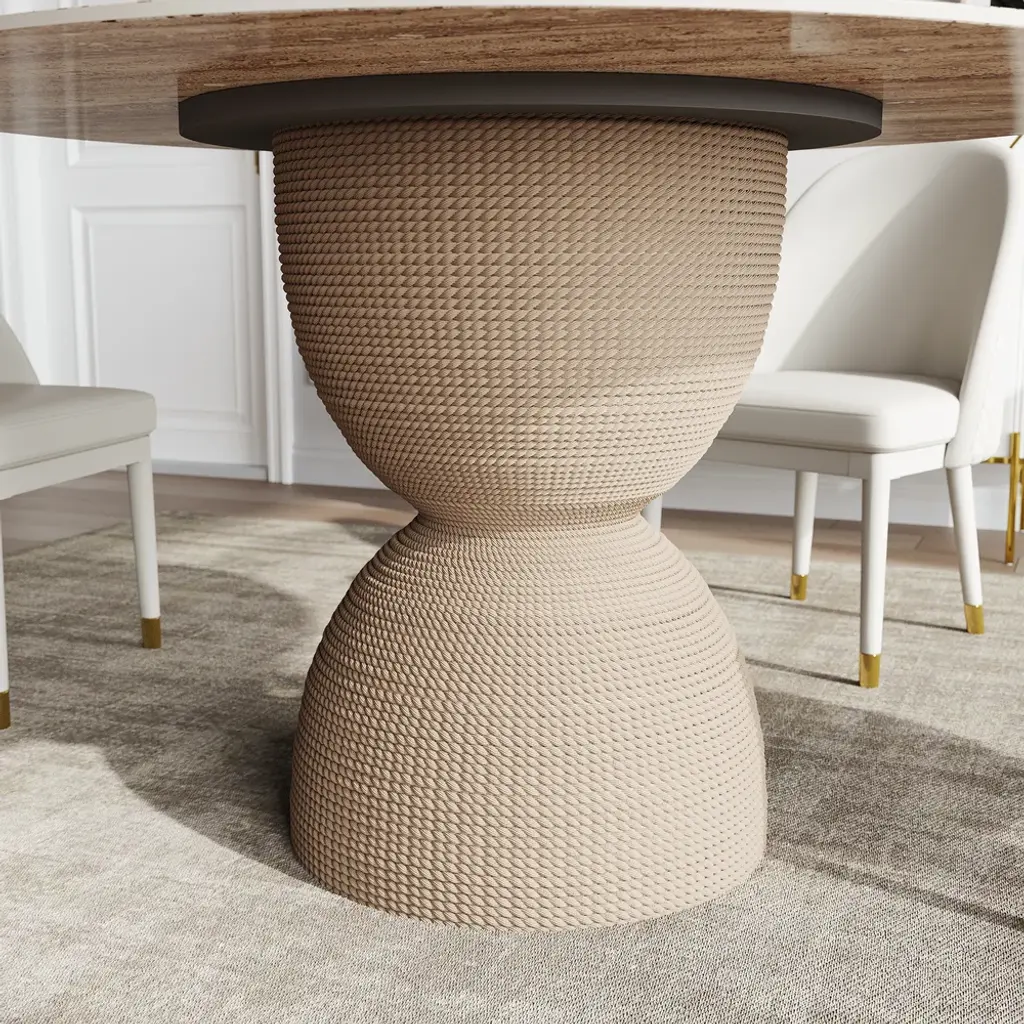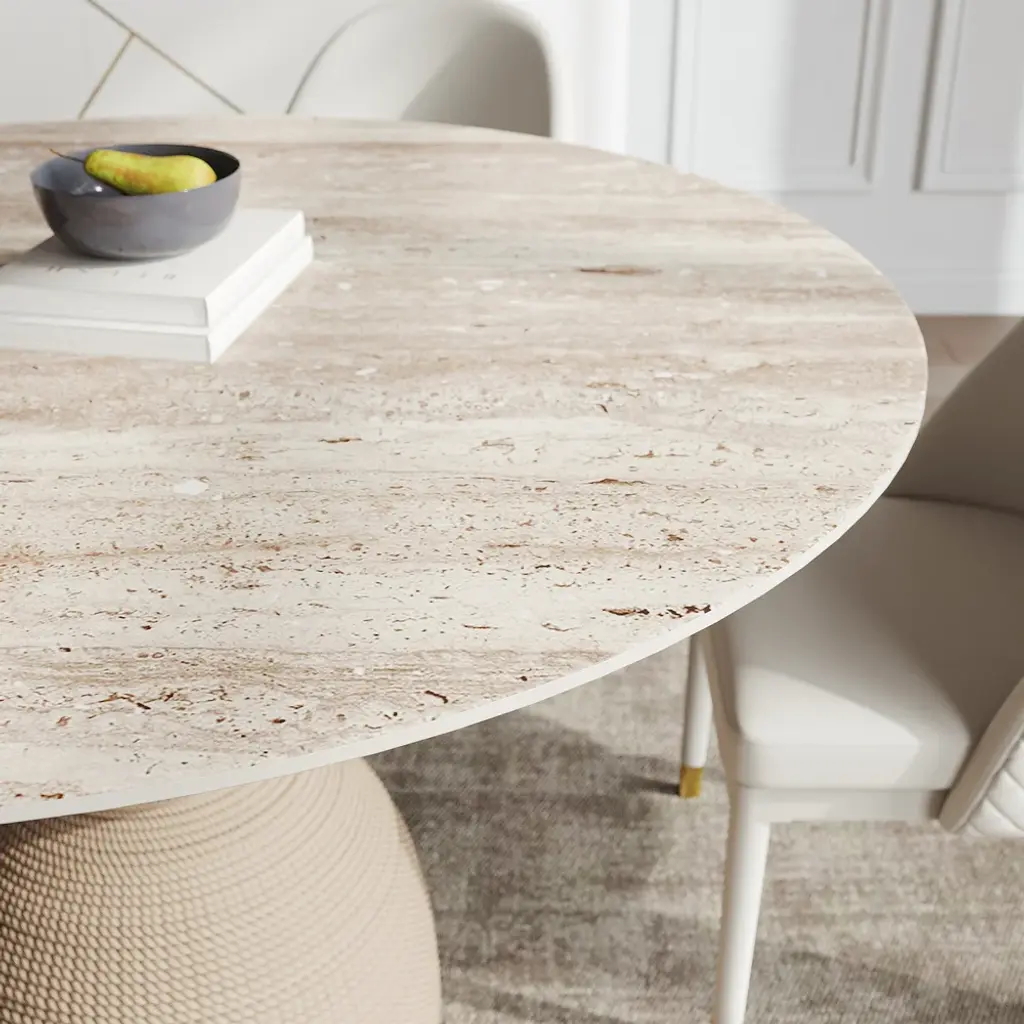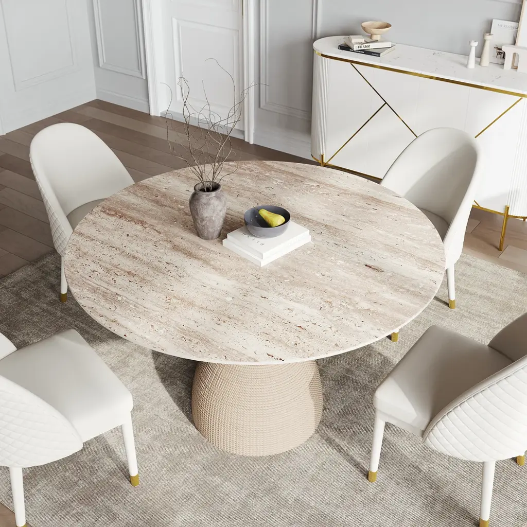 The 47.2" Modern Round Sintered Stone Top Dining Table in Beige is a perfect merge of elegance and strength, adding sophistication to any space by way of a stylish apricot-hued sintered stone surface that's resistant to scratches and stains, ideal for daily dining and entertainment.