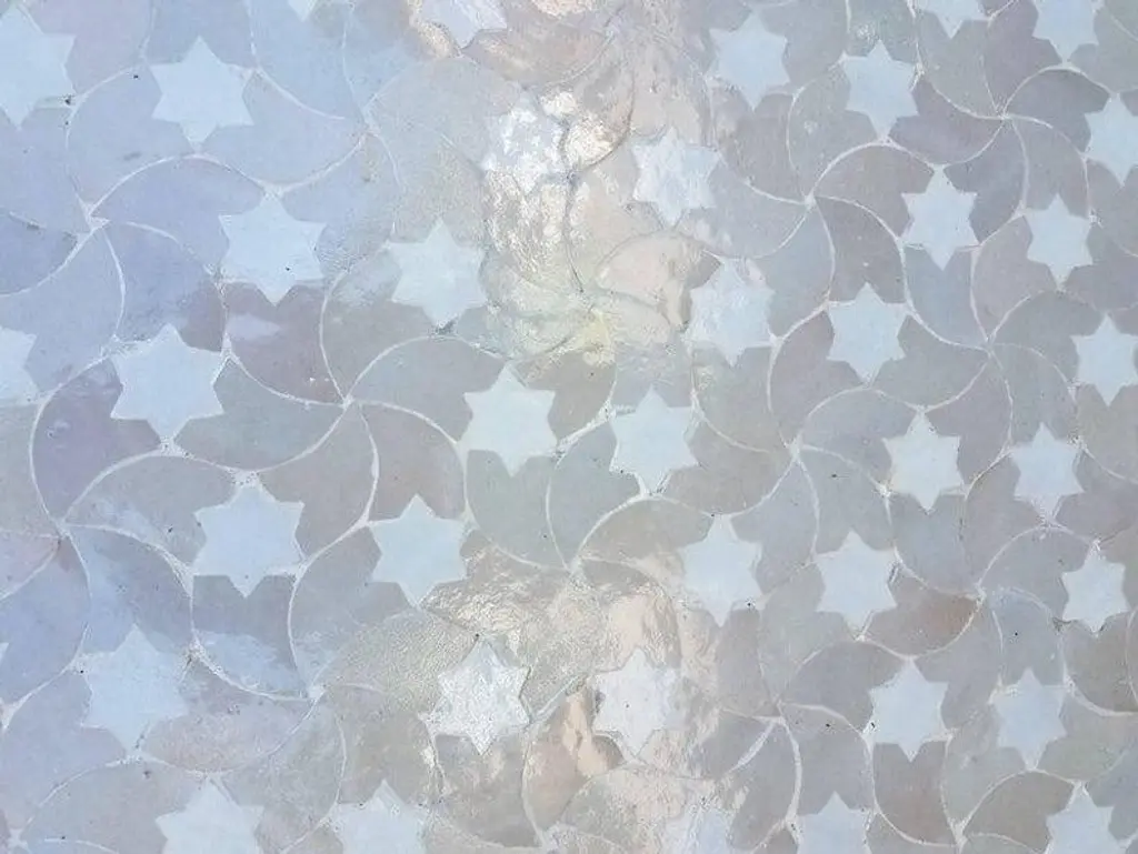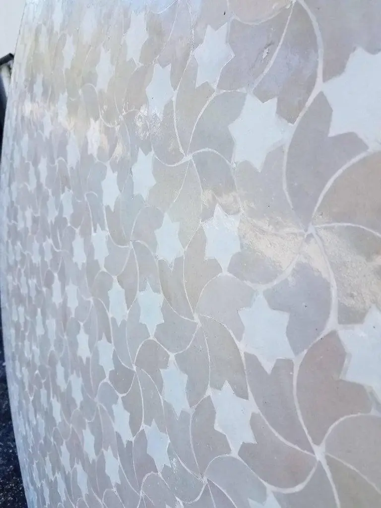 Custom made glazed Moroccan mosaic table measuring 48" in diameter. An indoor / outdoor dining table that sits up to six people. Rafraf pattern (also called star and leaf pattern), a design known to Morocco for centuries. Bright white and beige hand cut tiles in stars and leaves patterns. The subtle variations and small flaws in a handmade item are what give it a unique personality and undeniable charm.