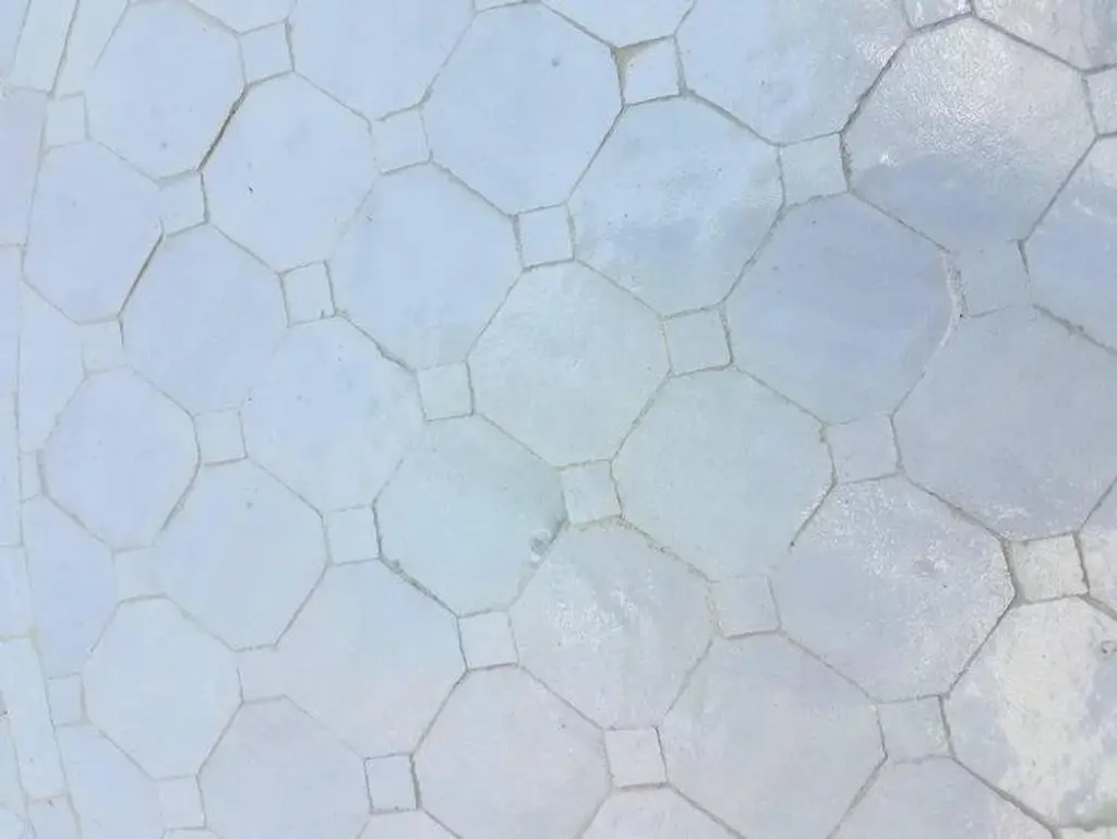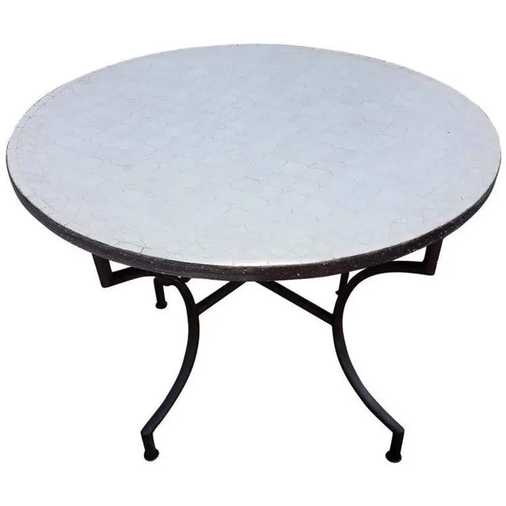 Custom made glazed Moroccan mosaic table measuring 48" in diameter. White is the color. An indoor or outdoor dining table that sits up to 6 people. CR4 pattern, a design known to Morocco for centuries. Mosaic hand cut tiles in squares and diamonds patterns. The subtle variations and small flaws in a handmade item are what give it a unique personality and undeniable charm. Mosaic tables and Mosaic fountains are our specialty. We have many to choose from. Different sizes, shapes, and colors are available in stock. Please contact us if you don't see what you are looking for. Following many clients' suggestions, most iron bases and table top rims are rustic and roughed up. If you want them to be nice and clean in a flat black finish, please let us know.