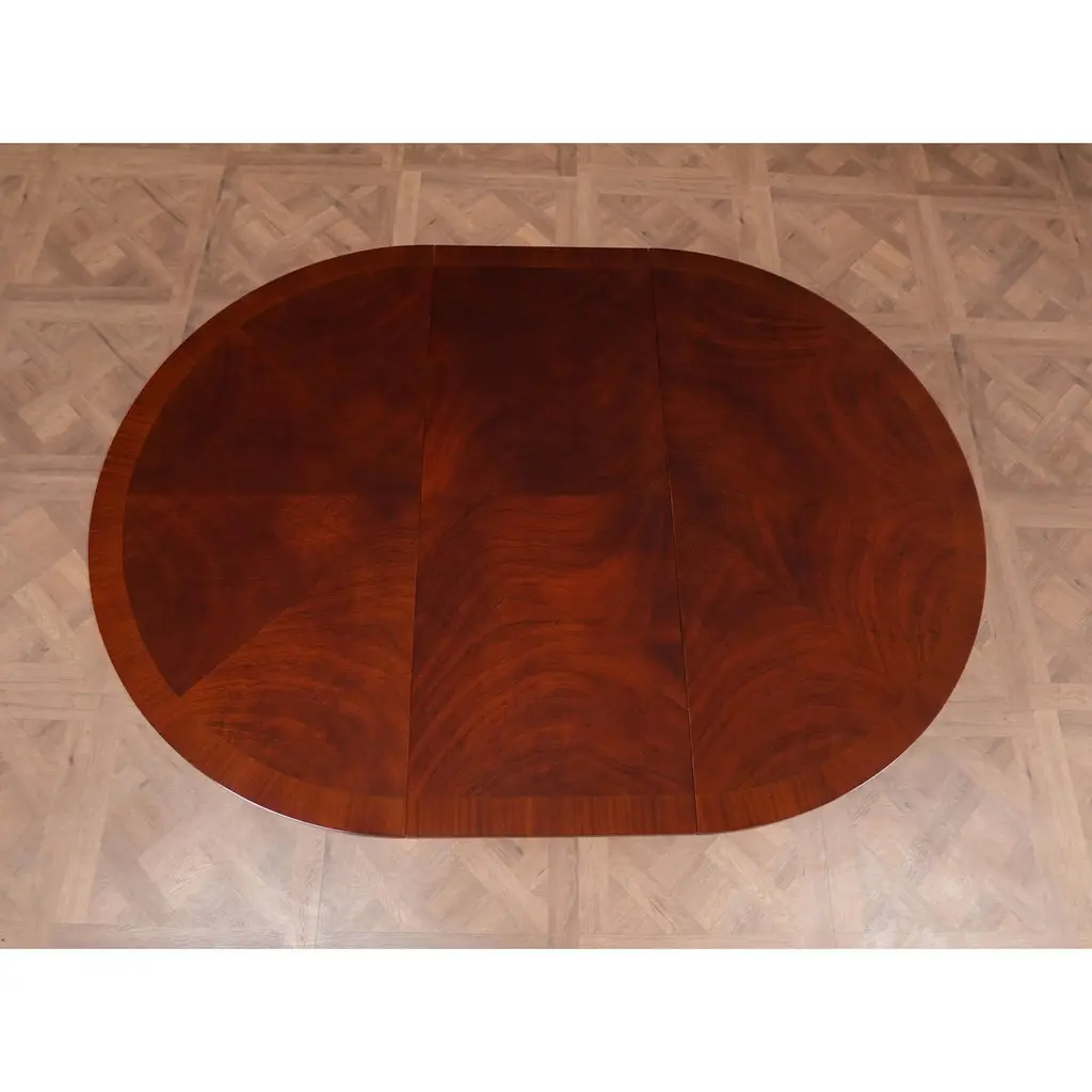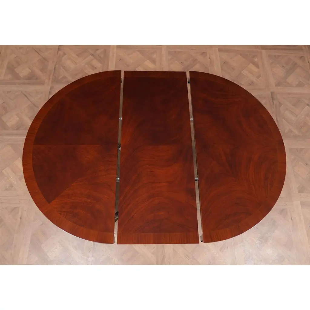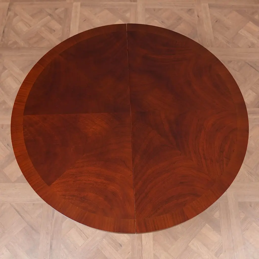 Always popular this 48″ Round Dining Table extends to an oval shaped dining table of 64″ when the leaf is inserted. The table top is fastened in place using bolts and rests on a reeded solid mahogany base. The base is carved from mahogany solids, the feet are tipped with high end brass caps in a Regency style foot. The top of the 48″ Round Dining Table boasts the finest grade veneers available arranged into an eye catching design and surrounded by a band of figured sapele veneer. The table seats four comfortably when closed and six when the leaf is in place. Ideal for intimate dining areas.Stock Photo for reference only. We take every measure to ensure that all of our dining tables are created to the highest standard using materials of similar quality but each table will appear slightly different due to the use of naturally occurring materials such as wood in the creation of our products.Measures 48″w x 48″L – 64″L x 31″h metric: 122 x 122-163 x 79