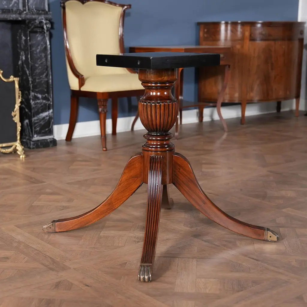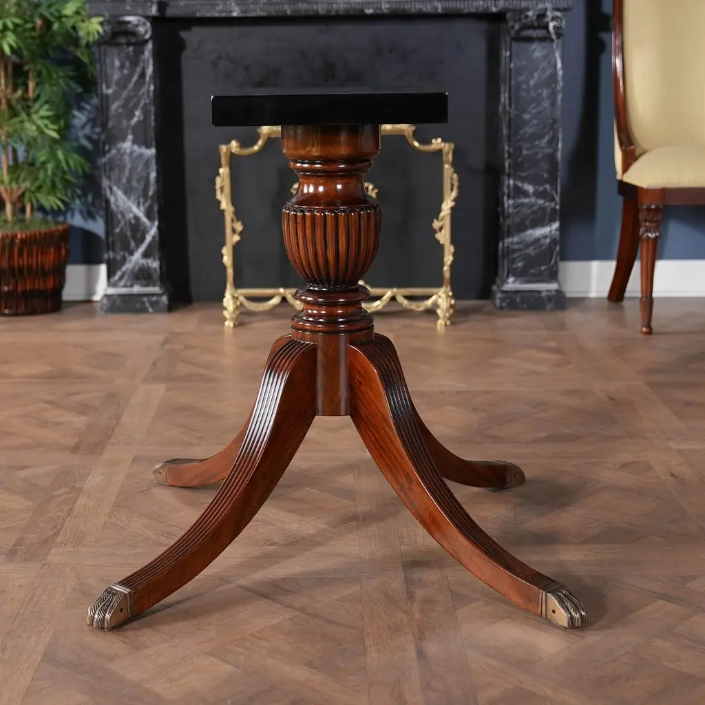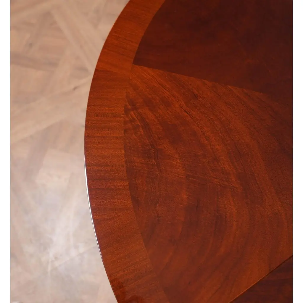 Always popular this 48″ Round Dining Table extends to an oval shaped dining table of 64″ when the leaf is inserted. The table top is fastened in place using bolts and rests on a reeded solid mahogany base. The base is carved from mahogany solids, the feet are tipped with high end brass caps in a Regency style foot. The top of the 48″ Round Dining Table boasts the finest grade veneers available arranged into an eye catching design and surrounded by a band of figured sapele veneer. The table seats four comfortably when closed and six when the leaf is in place. Ideal for intimate dining areas.Stock Photo for reference only. We take every measure to ensure that all of our dining tables are created to the highest standard using materials of similar quality but each table will appear slightly different due to the use of naturally occurring materials such as wood in the creation of our products.Measures 48″w x 48″L – 64″L x 31″h metric: 122 x 122-163 x 79