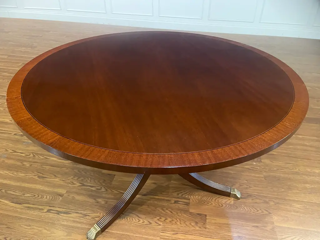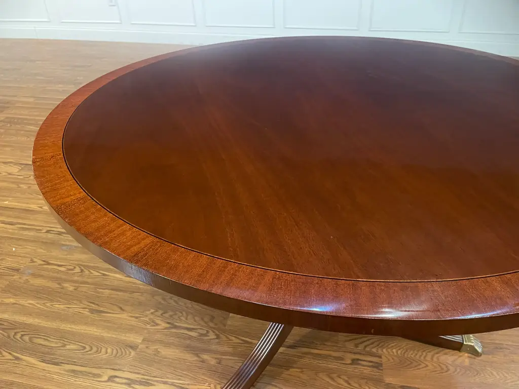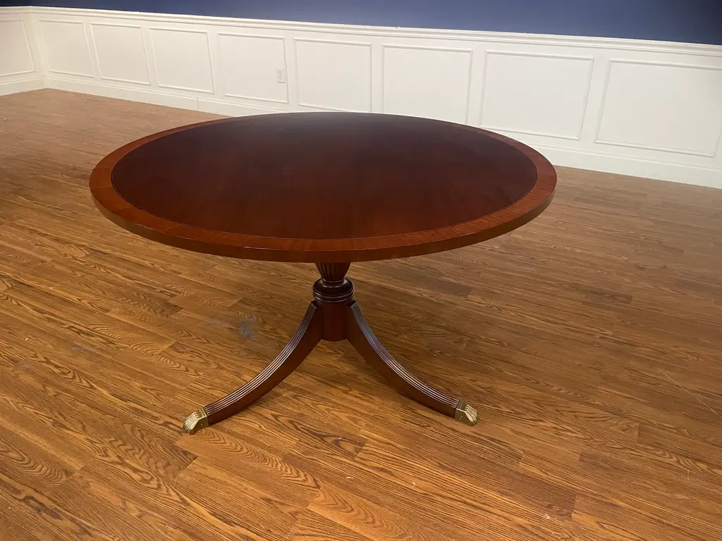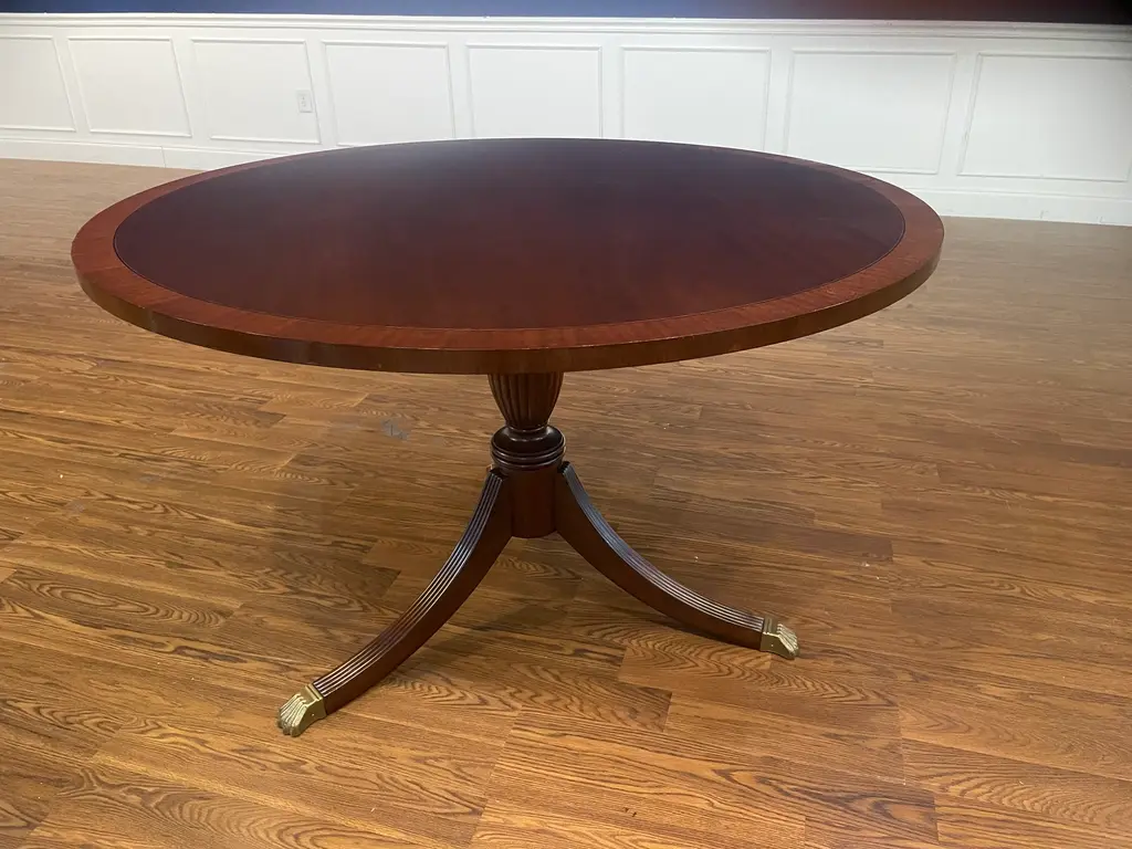 This is a 48” diameter traditional mahogany table which is made-to-order in the Leighton Hall shop in Suwanee, Georgia. It has a reverse-slip-match cathedral mahogany field with a contrasting straight grain mahogany border. It has a medium brown mahogany stain with Leighton Hall’s premium hand rubbed and polished semi-gloss sheen. The three fluted pedestal legs terminate with antique brass lion’s paw feet. This table is multi-functional and is ideal as a foyer table, game table, breakfast table or dining table in a small apartment. The suggested manufacturer’s retail price is $4,577. Estimated production time is six weeks. Dimensions: Diameter: 48”; Height: 30”