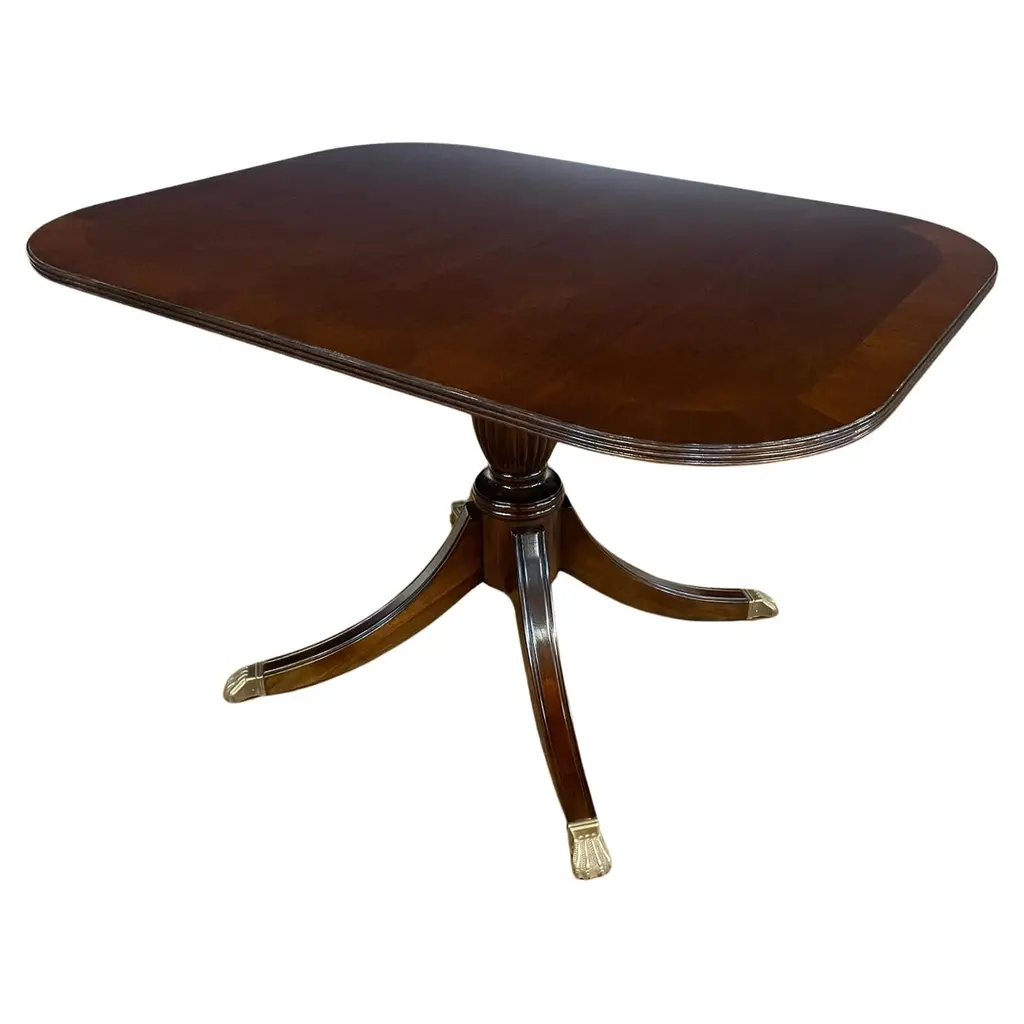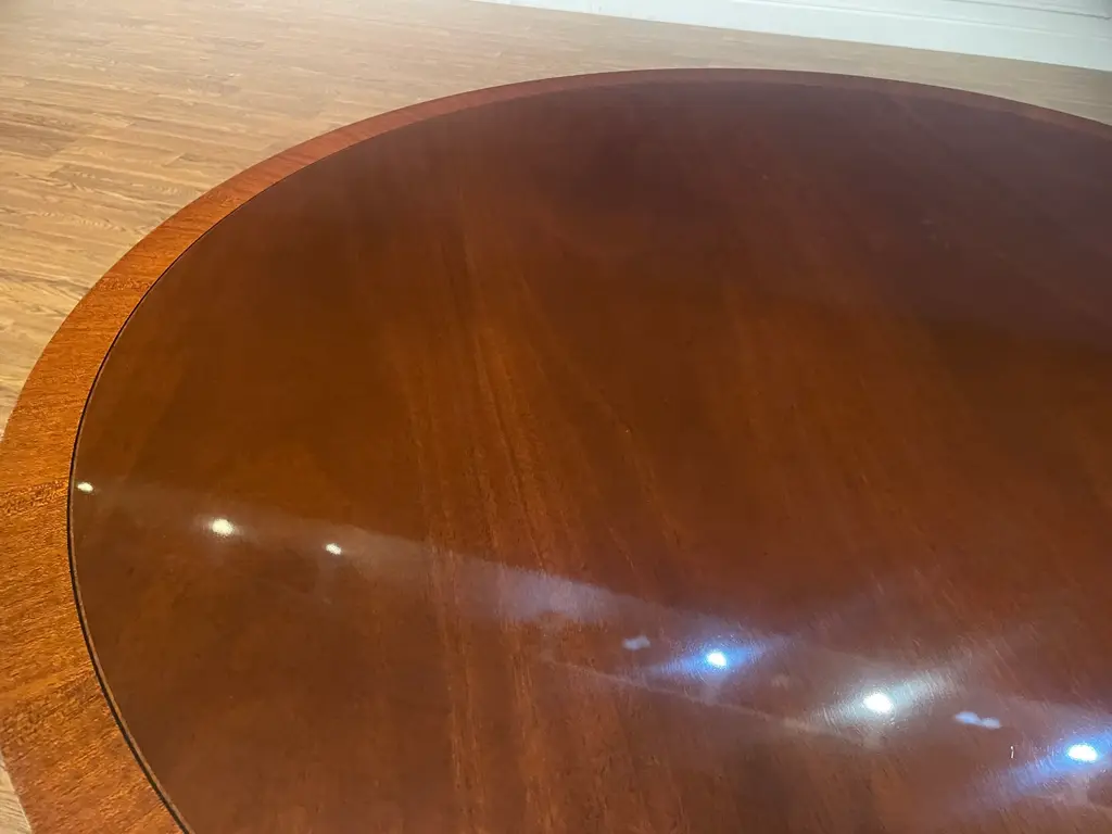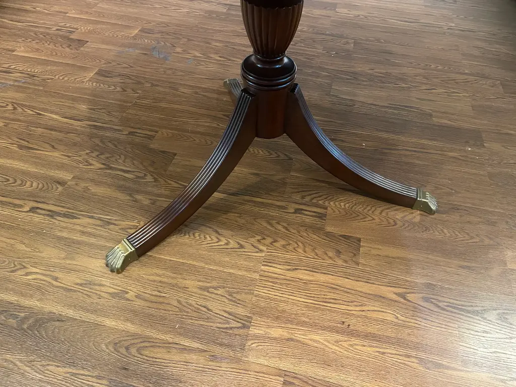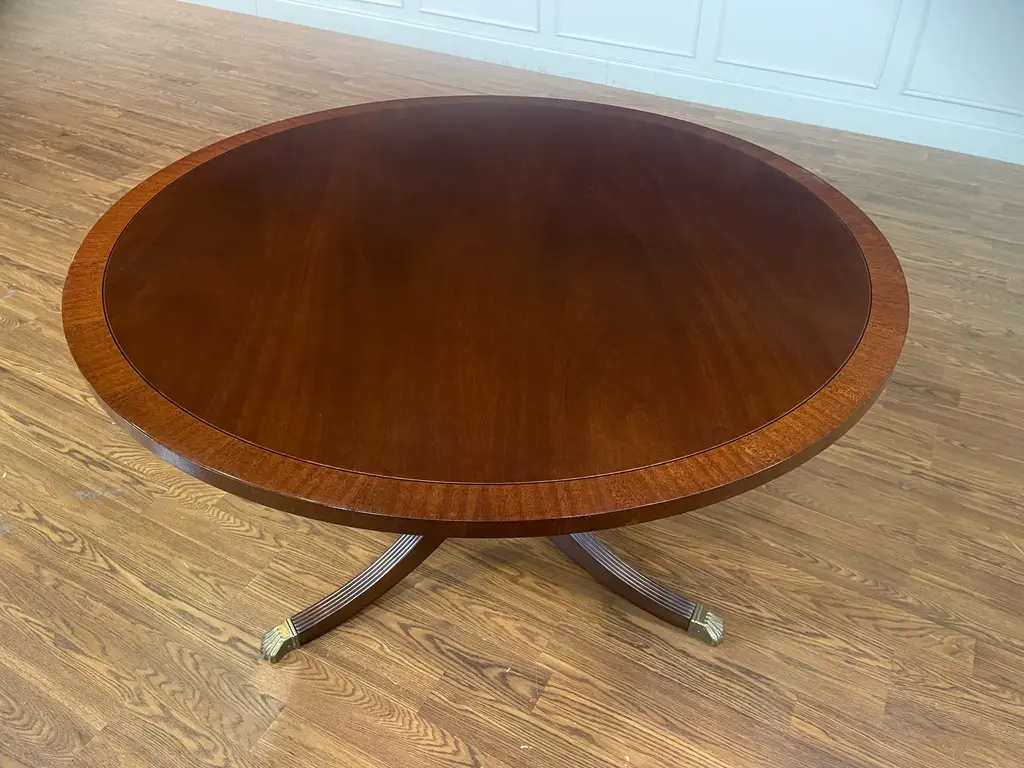 This is a 48” diameter traditional mahogany table which is made-to-order in the Leighton Hall shop in Suwanee, Georgia. It has a reverse-slip-match cathedral mahogany field with a contrasting straight grain mahogany border. It has a medium brown mahogany stain with Leighton Hall’s premium hand rubbed and polished semi-gloss sheen. The three fluted pedestal legs terminate with antique brass lion’s paw feet. This table is multi-functional and is ideal as a foyer table, game table, breakfast table or dining table in a small apartment. The suggested manufacturer’s retail price is $4,577. Estimated production time is six weeks. Dimensions: Diameter: 48”; Height: 30”