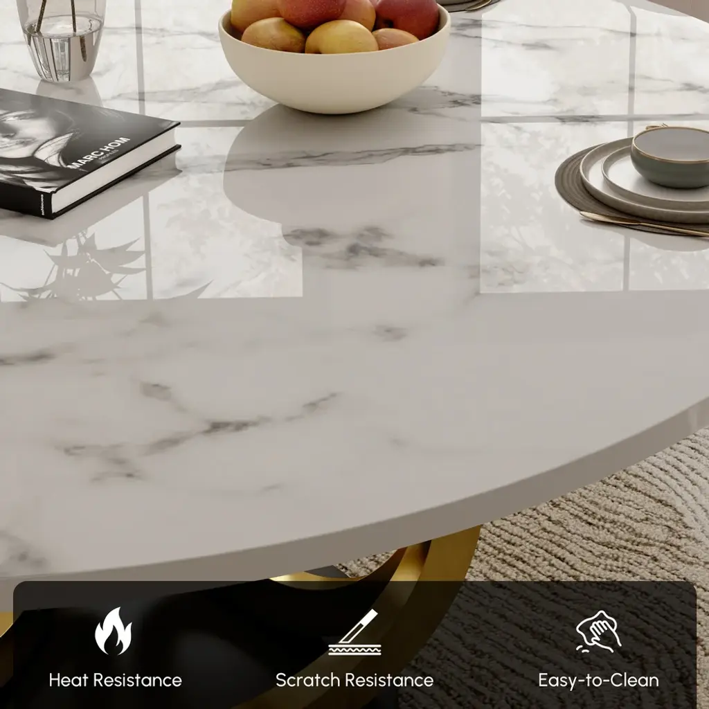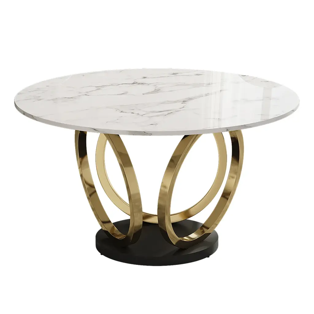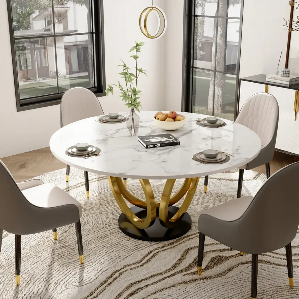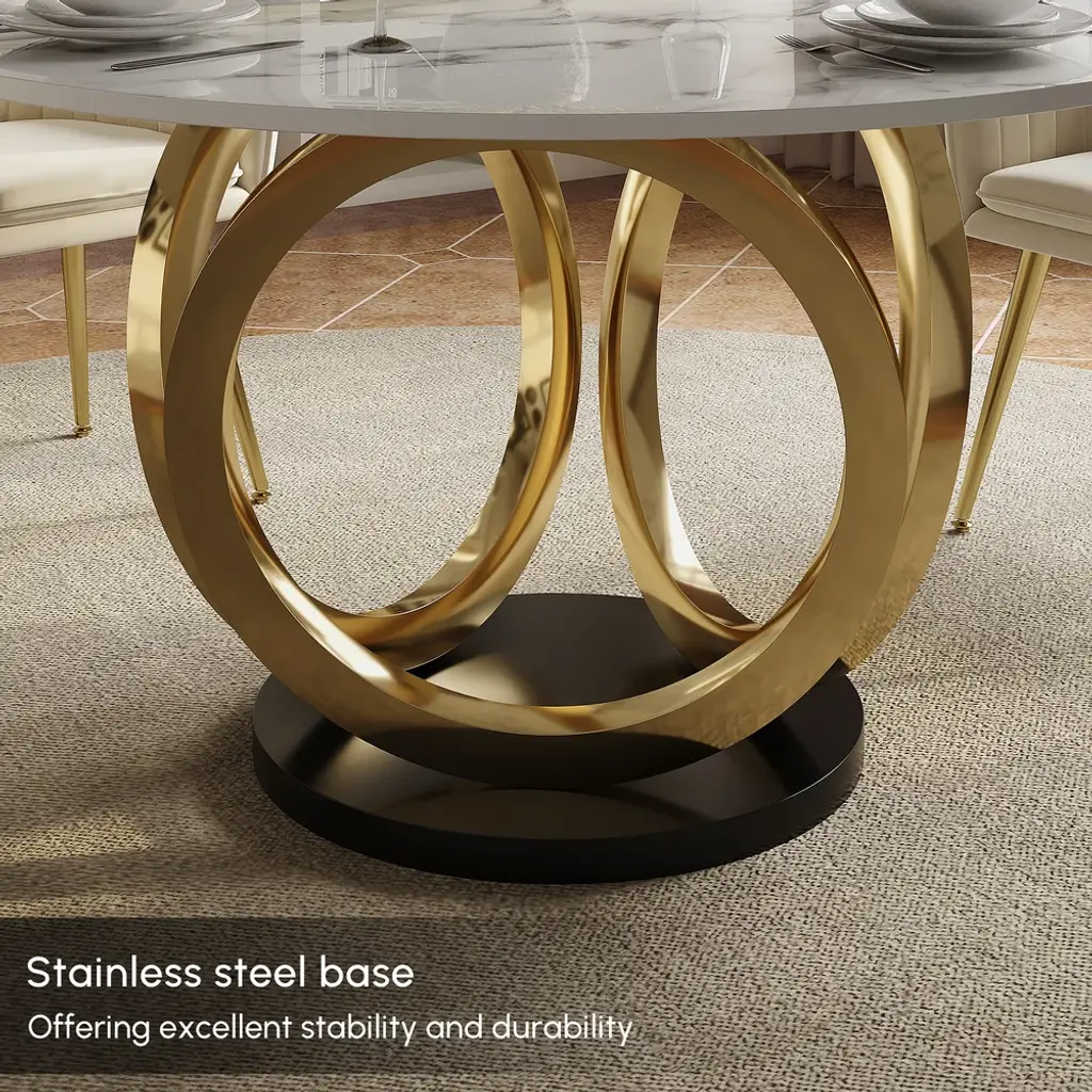 This elegant 53" round dining table blends modern minimalism with luxury. Featuring a durable Sintered Stone top that's scratch/heat-resistant and easy to clean, it's paired with a striking gold-black base that becomes the centerpiece of any contemporary space. Comfortably seats six, perfect for family meals or entertaining guests.
