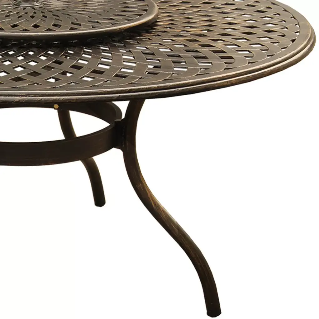 Constructed of cast aluminum in UV resistant, powder coated, hand applied bronze finish, this large round 59 inch dining table features a top that is designed specifically to prevent damage caused from pooling by allowing water to pass through freely and a lazy susan. Made specifically for large size families or entertaining guests, this mesh lattice modern contemporary round table with lazy susan is ideal for any patio, porch, deck, balcony and backyard. Suitable for indoor or outdoor and commercial or residential use. Round Outdoor Dining Table Dimensions: 59" L x 59" W x 30" H, 71 lbs. Lazy Susan Dimension: 28" Diameter