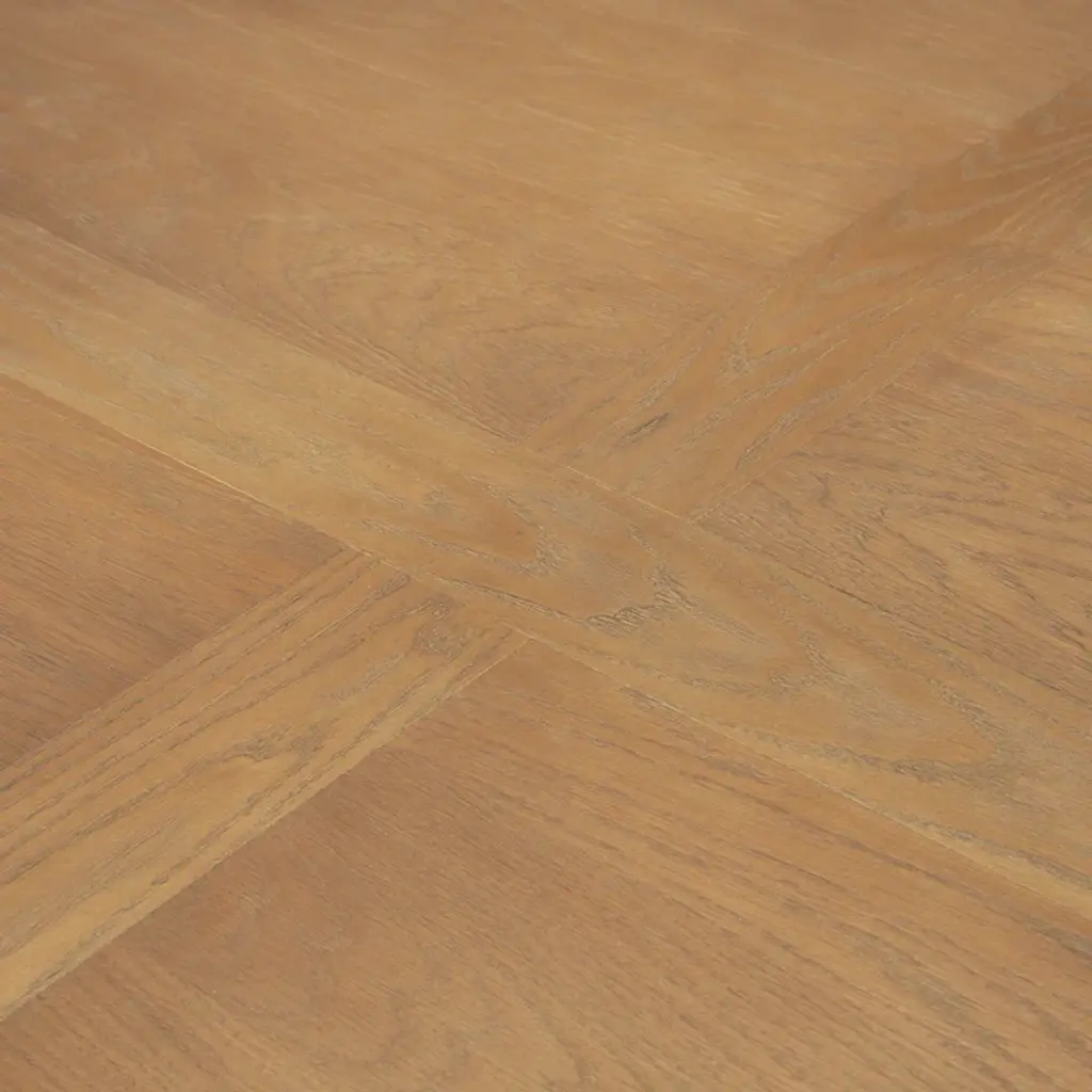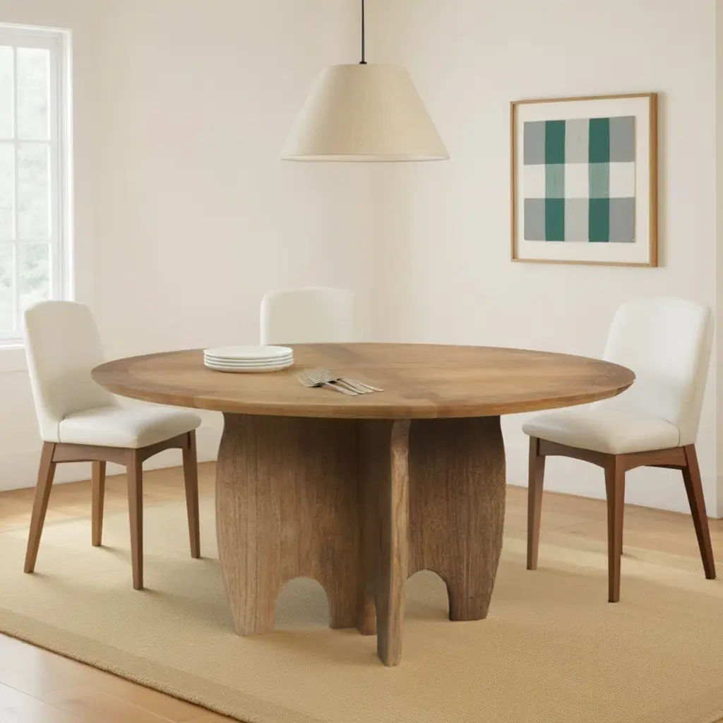 Teton Dining Table features a round oak wood tabletop with a unique solid rubber wood base, all finished in a medium brown stain.