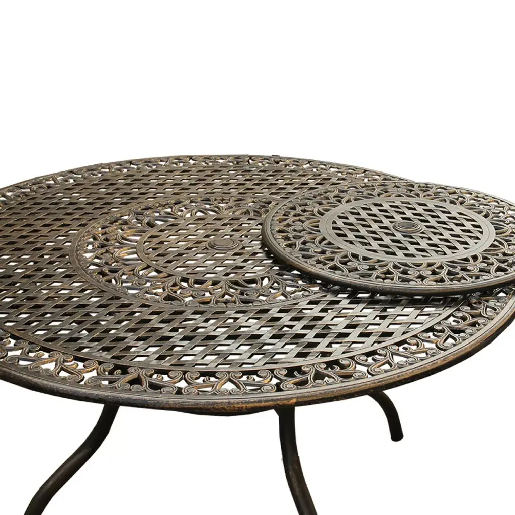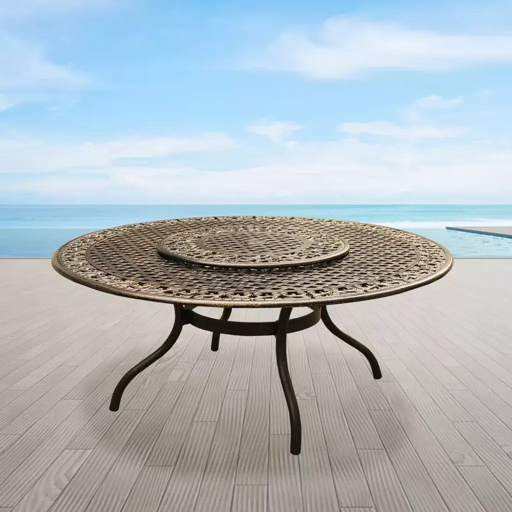 Constructed of cast aluminum in UV resistant, powder coated, hand applied bronze finish, this large round 59 inch dining table features a top that is designed specifically to prevent damage caused from pooling by allowing water to pass through freely and a lazy susan. Made specifically for large size families or entertaining guests, this mesh lattice ornate traditional round table with lazy susan is ideal for any patio, porch, deck, balcony and backyard. Suitable for indoor or outdoor and commercial or residential use. Table Dimensions: 59" L x 59" W x 30" H, 73 lbs. Lazy Susan Dimension: 29" Diameter