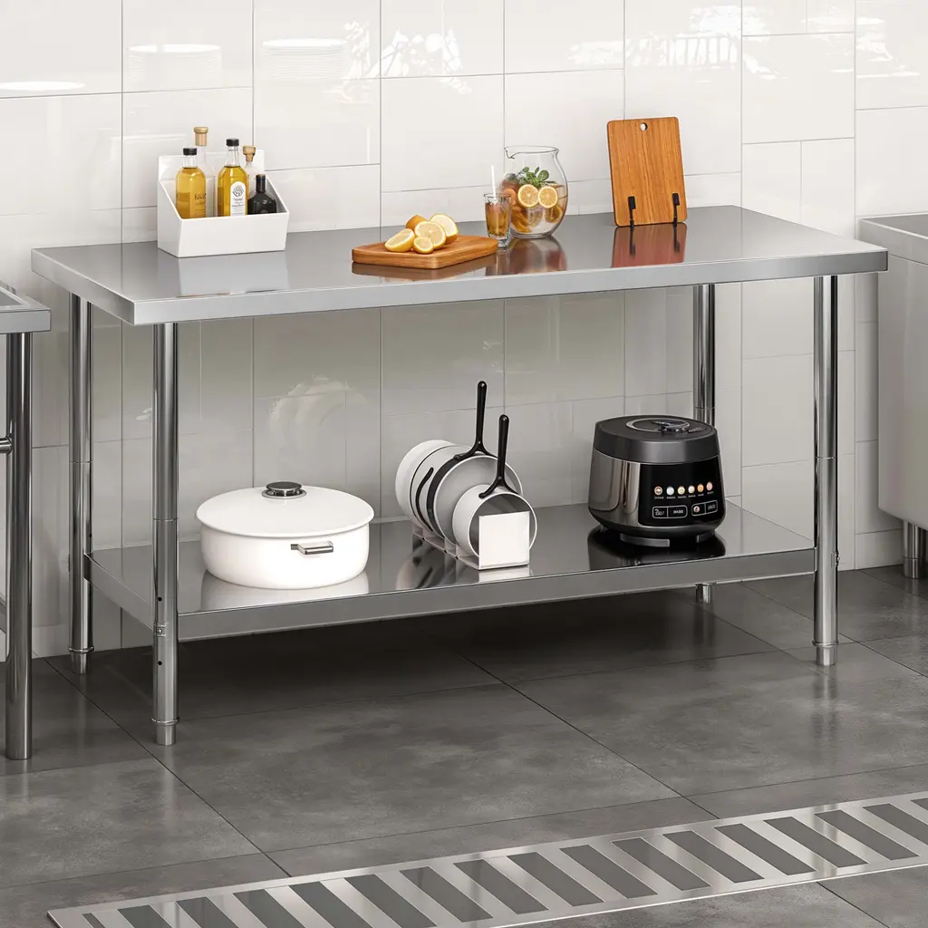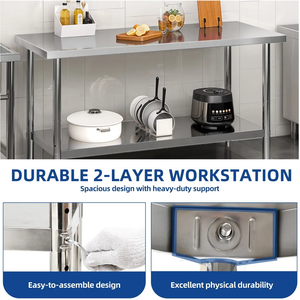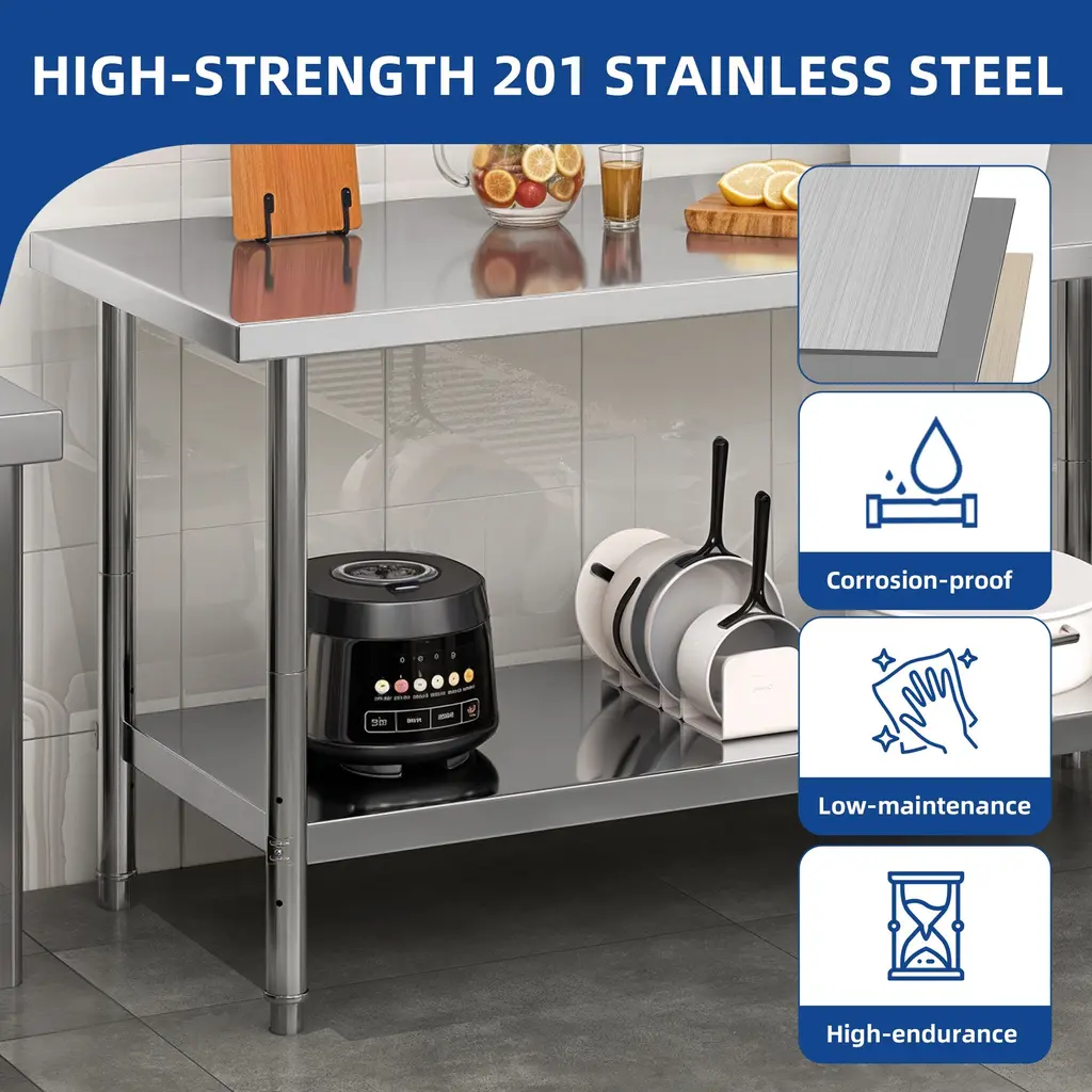 Ready to tackle your toughest tasks, this NSF-certified stainless steel table is the ultimate powerhouse for your kitchen, garage, or workshop. Crafted with rust-proof 201 stainless steel, it offers durability and easy clean-up after every project. The adjustable undershelf and feet let you customize storage while ensuring a steady setup, even on uneven floors. With a heavy-duty frame supporting up to 480 lbs. on top and 360 lbs. on the bottom, this table handles everything from kitchen gear to tools. Assembly's a breeze, so you'll be up and running in no time.Specifications:Color: SilverMaterial: 201 Stainless SteelOverall Size: 24"D x60"W x 34"HRoom Type: Kitchen, Dining Room, Backyard, Garage, WorkshopAssembly Required:YesPackage Included:1 x Stainless Steel Table1 x Instructions1 x Accessory Kit