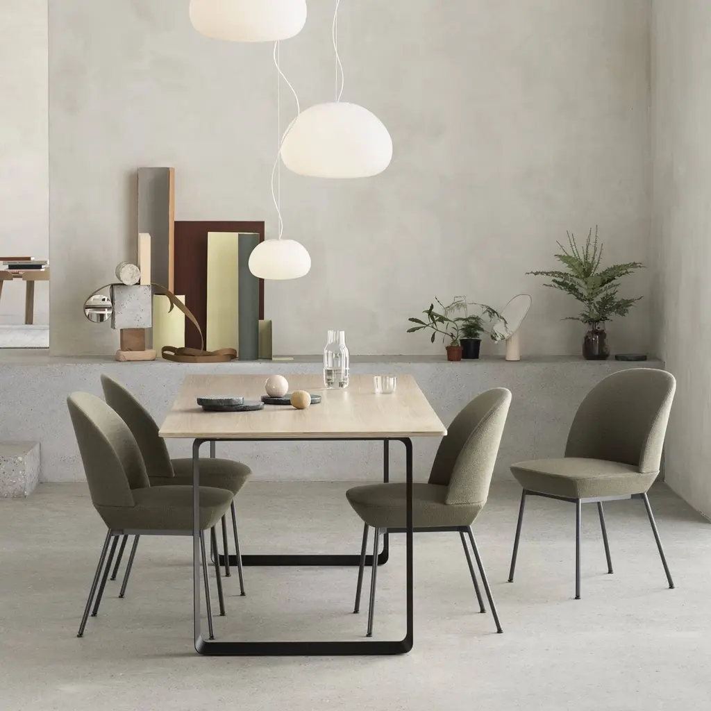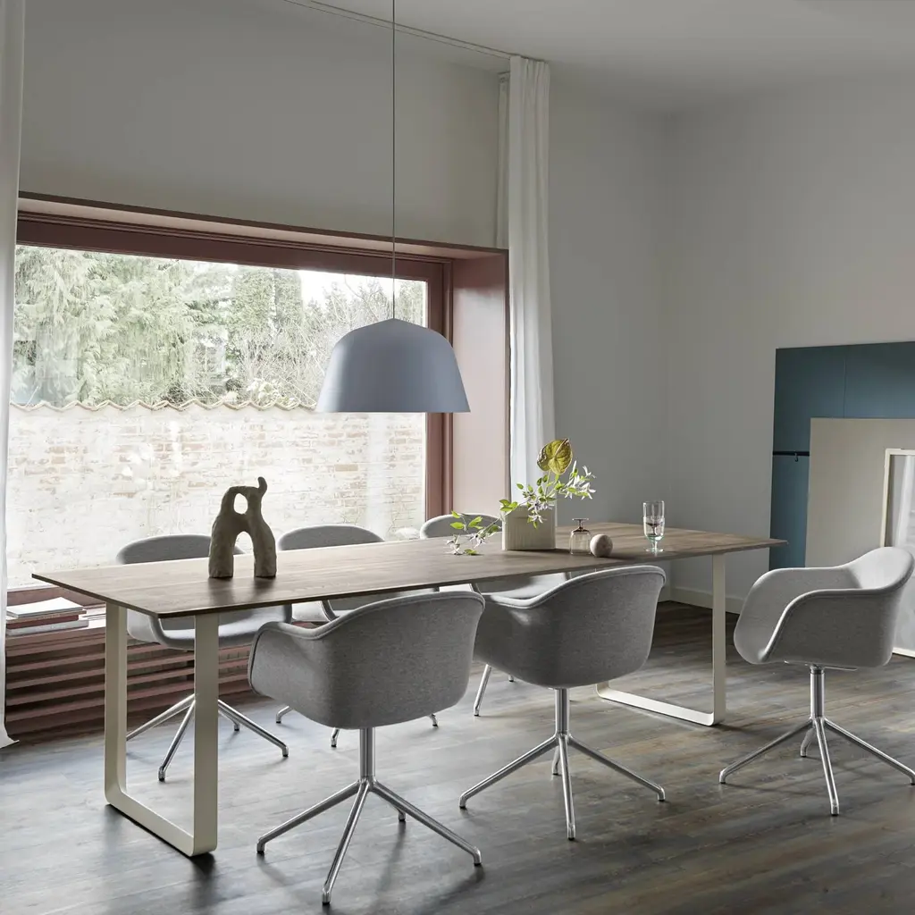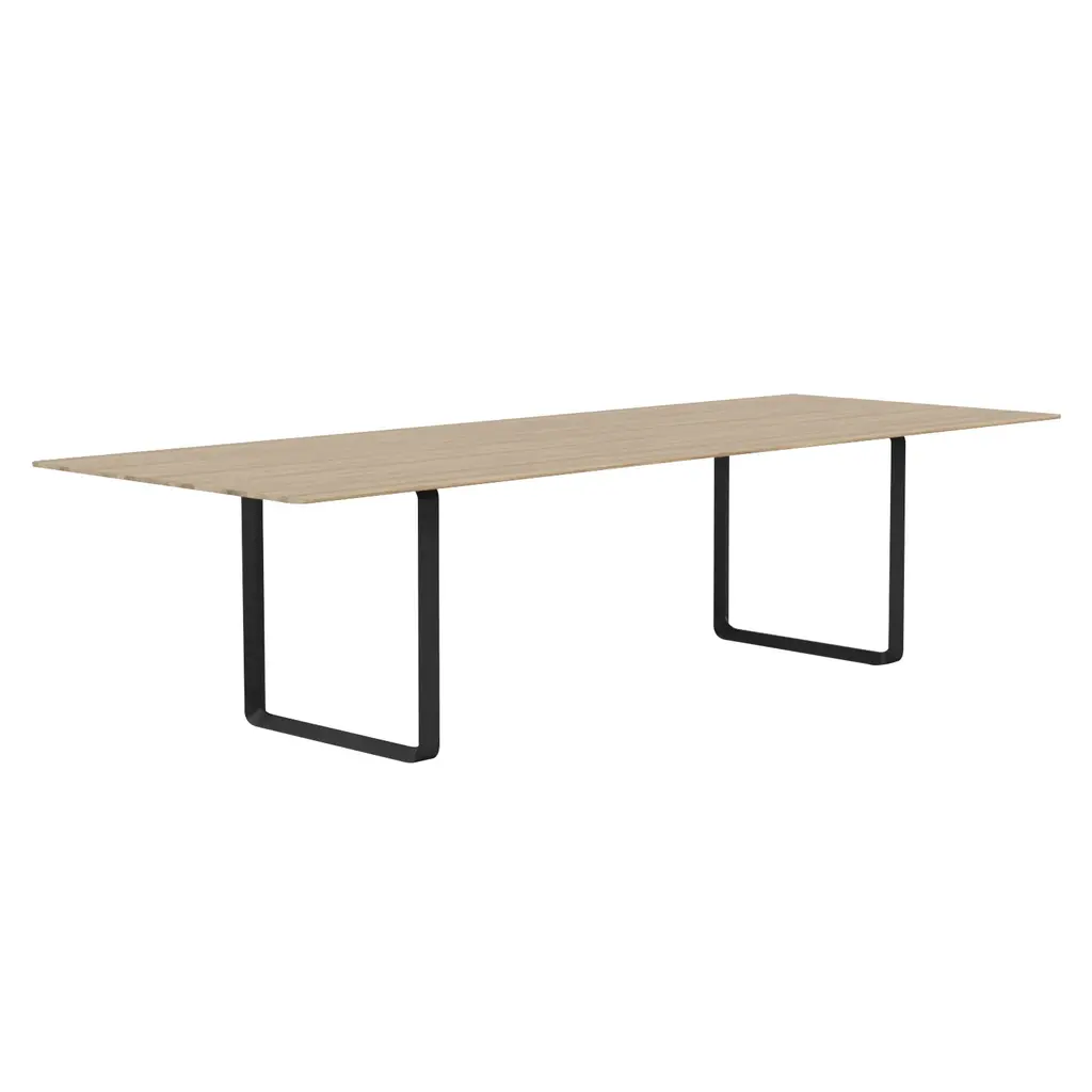 With a magnificent expanse of tabletop in oak, this version of 70/70 is bound to be a forever piece. TAF Studio designers create a striking profile, juxtaposing an angular metal base in cast aluminum to complement the slanted edges of the top. Available in a range of sizes and 3 different metal finishes, Muuto's understated but impressive rectangular table is an ideal match for any dining area, home office, workplace or hospitality setting.