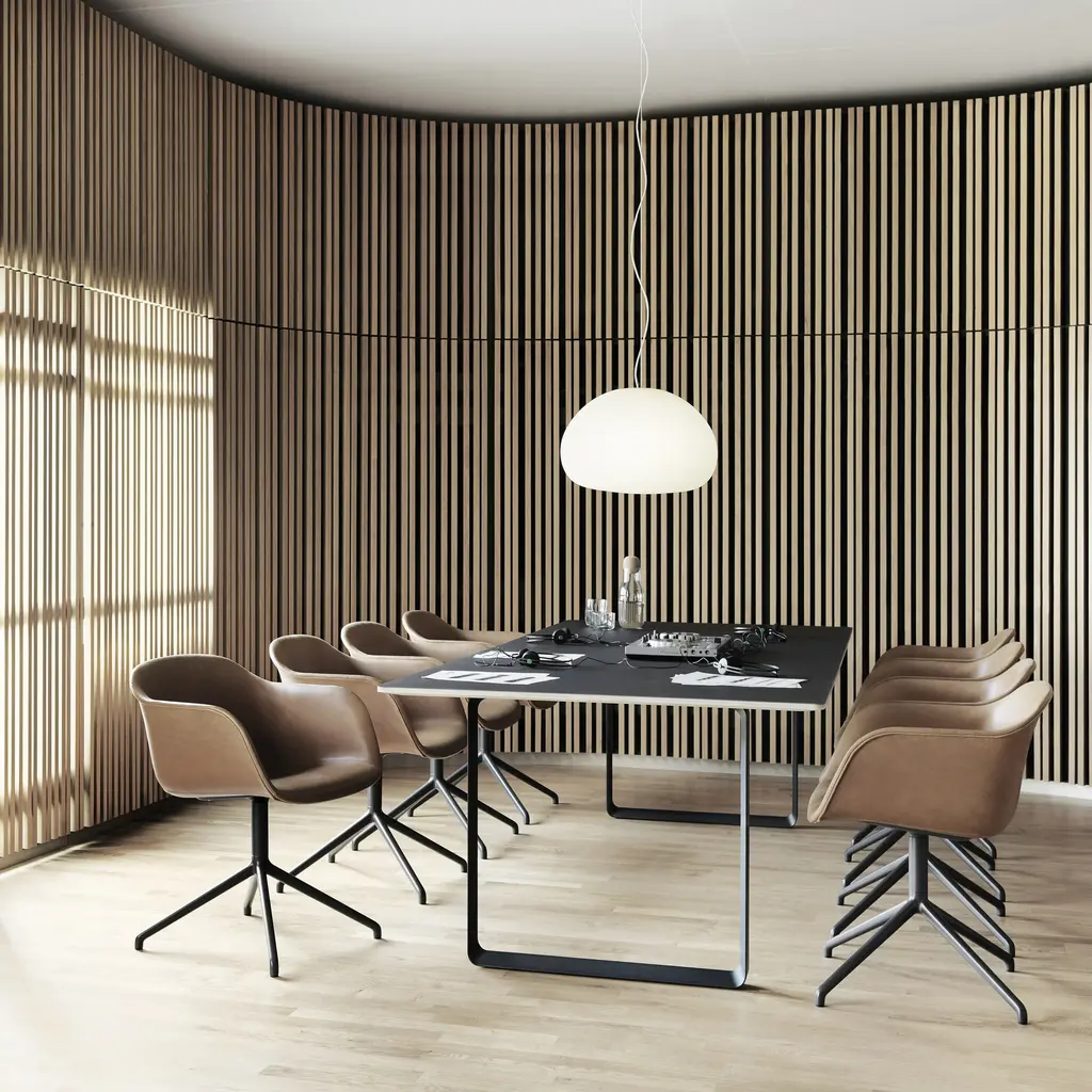 Here's a study in plane geometry that's anything but plain. TAF Architects says the goal for designs such as the 70/70 Table for Danish house Muuto is to show how "everyday objects by their very commonness can be made uncommon." Consider the pleasing juxtaposition of the sleek cast aluminum frame with the unpretentious plywood tabletop, finished with either a clear laminate or linoleum surface and angled inside the frame and at the table base. Observe the airy silhouette that belies its sturdy form. Note that this table, available in both a smaller or larger size, can serve multiple functions from dining table to home office. Conclude that TAF, the Stockholm-based design and architecture studio, seems to have all the angles covered.