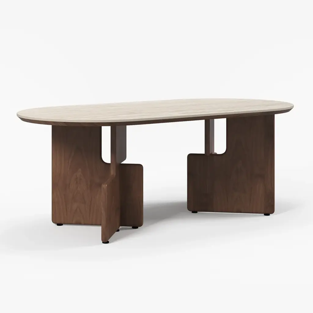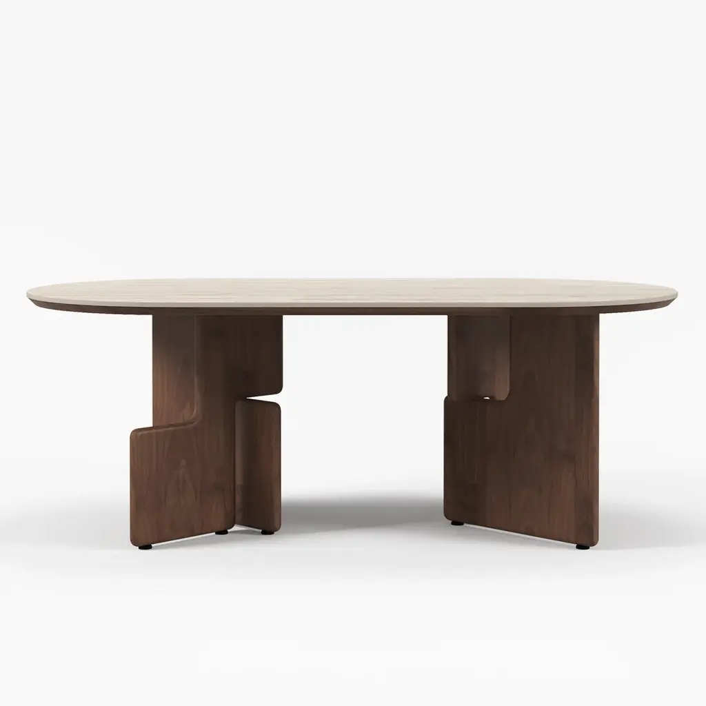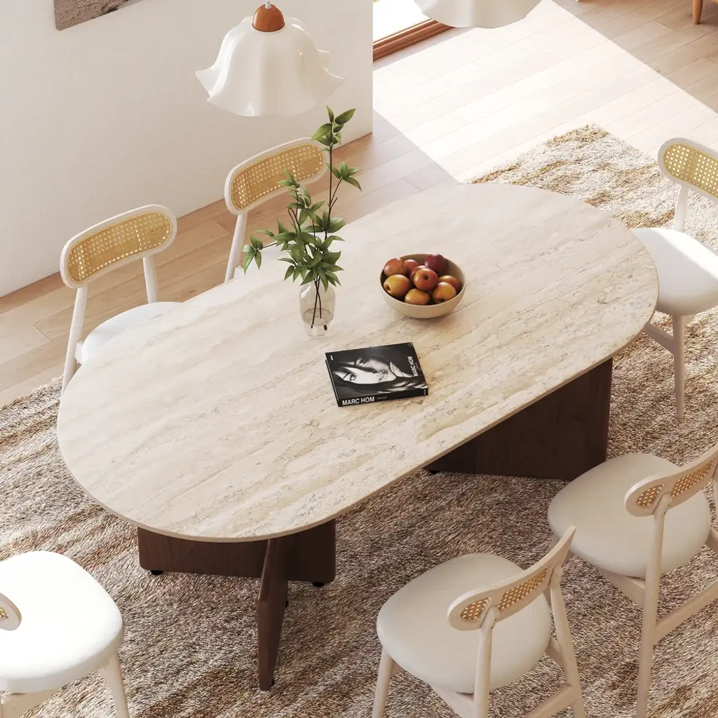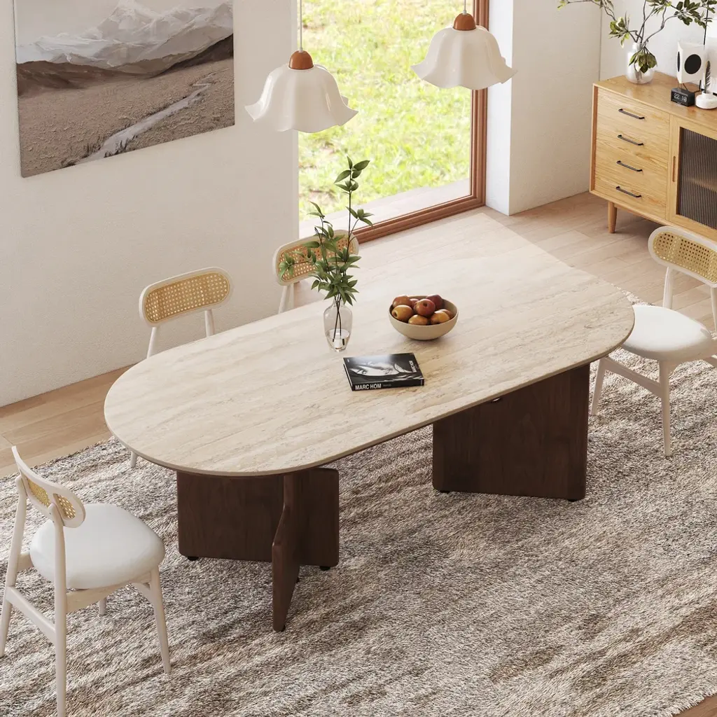 Make a bold statement in your dining space with this chic dining table. Featuring faux travertine top that captures the elegance of natural stone. Anchored by pair of sculptural, solid wood legs in a rich walnut finish, designed with a playful yet modern silhouette that adds artistic charm and visual balance.