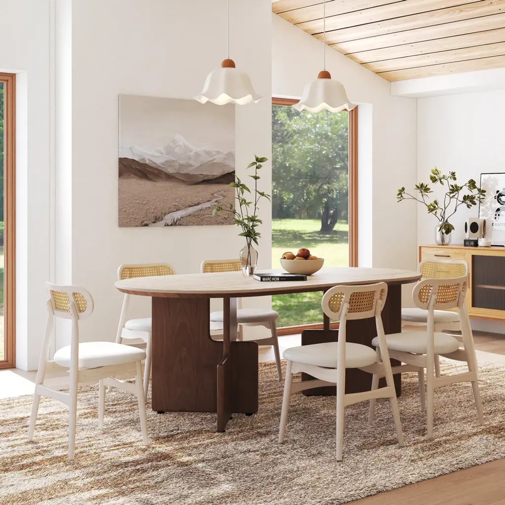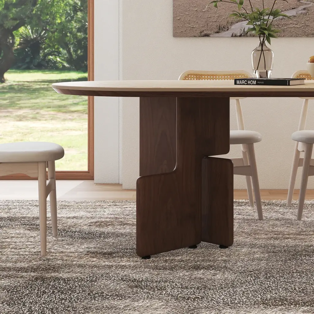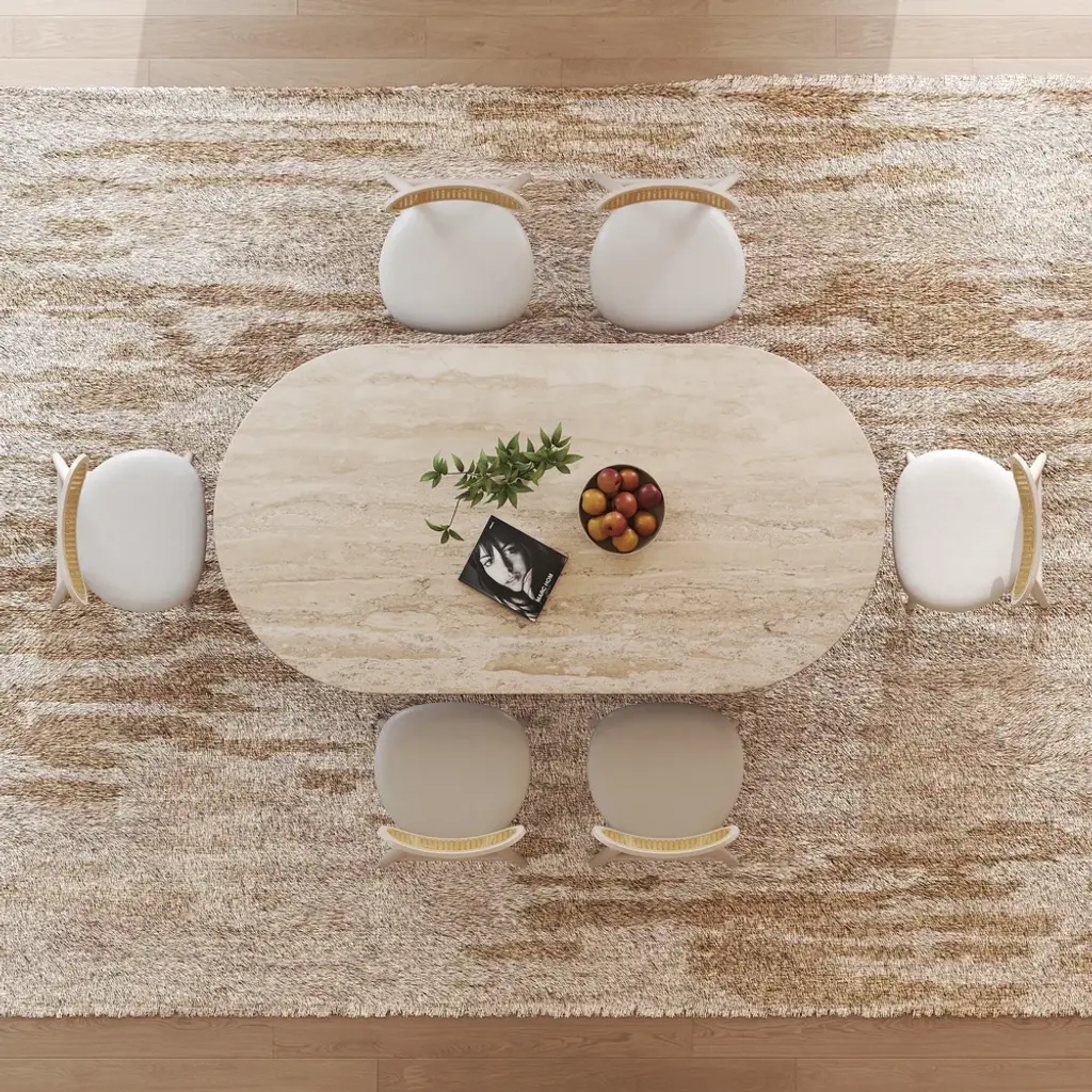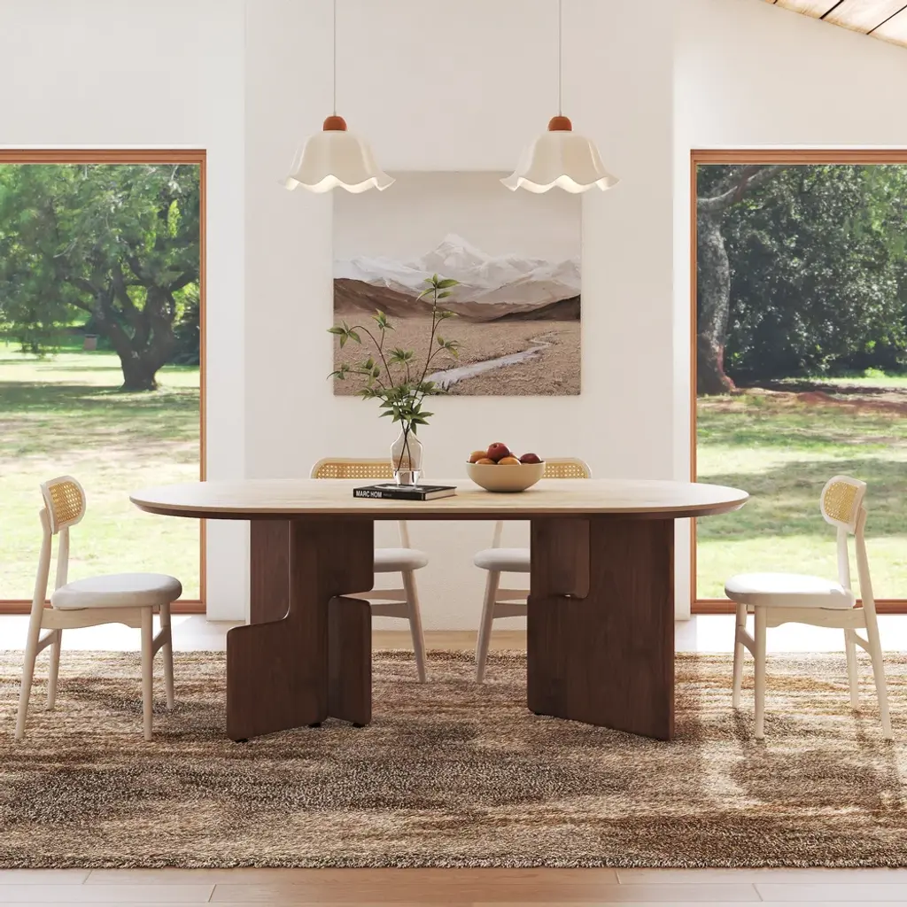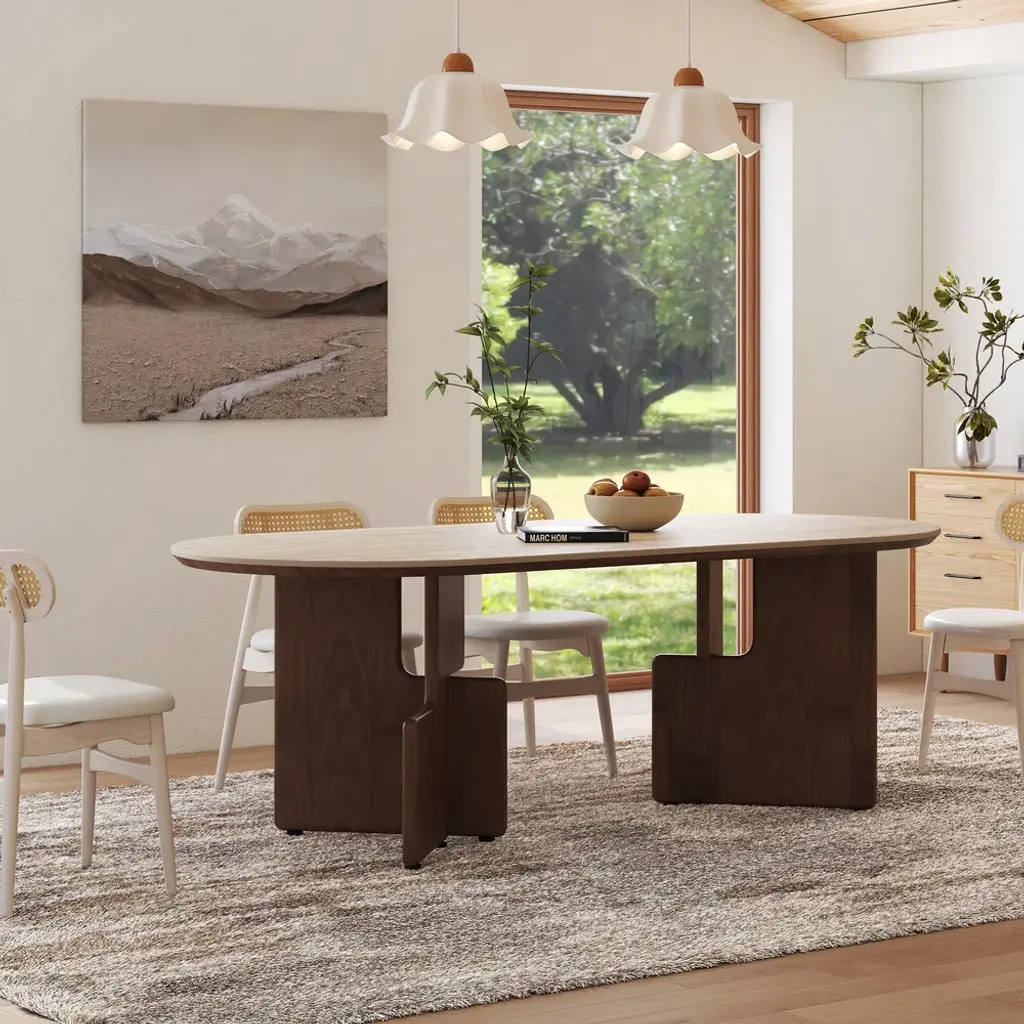 Make a bold statement in your dining space with this chic dining table. Featuring faux travertine top that captures the elegance of natural stone. Anchored by pair of sculptural, solid wood legs in a rich walnut finish, designed with a playful yet modern silhouette that adds artistic charm and visual balance.