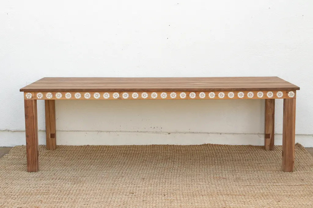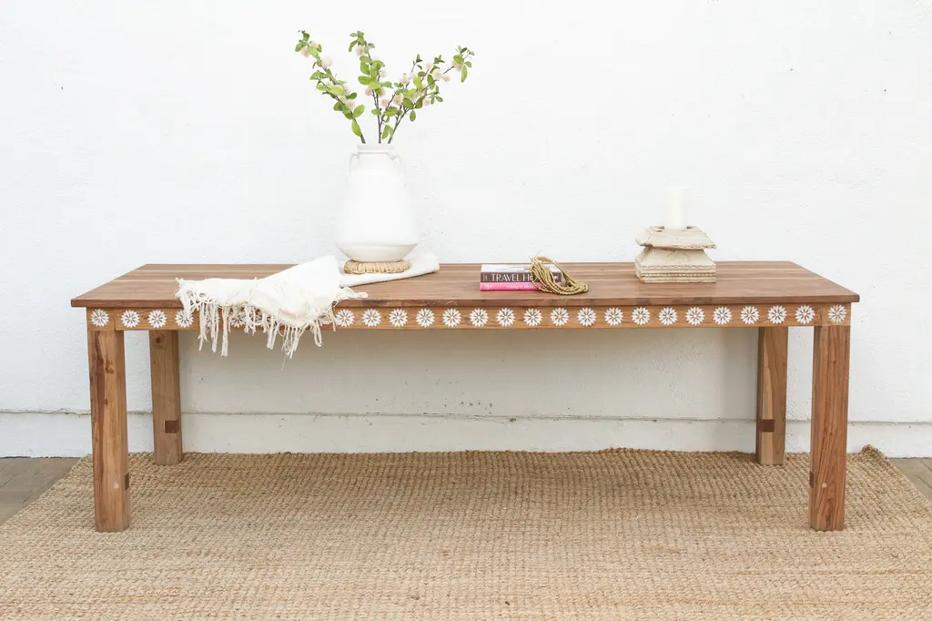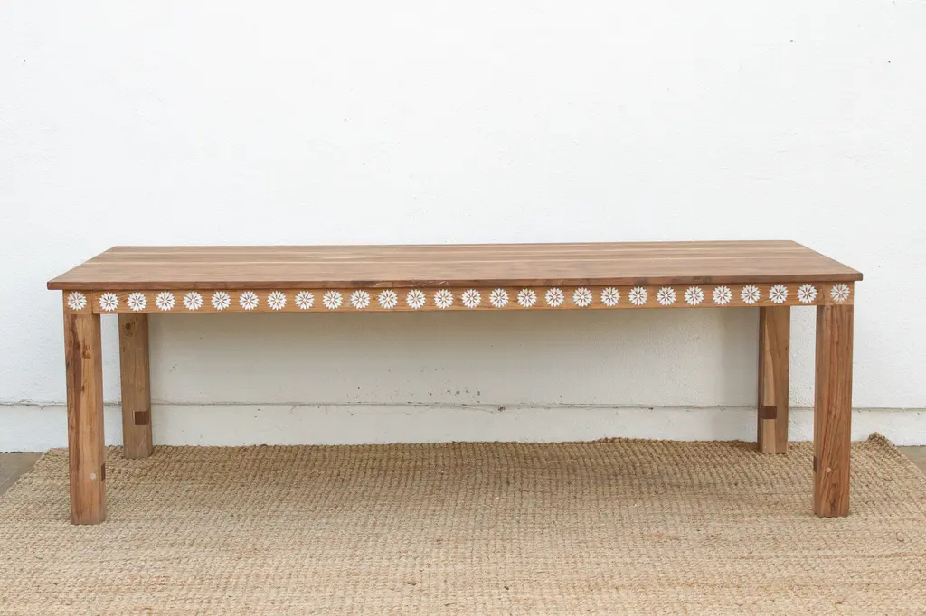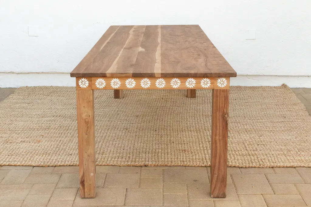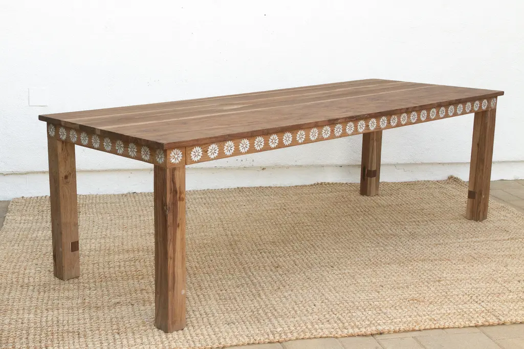 Gather around a dining table that blends natural beauty with artisanal craftsmanship. This 8-foot piece is made from reclaimed teak, known for its rich grain and strength. A delicate mother of pearl blossom inlay adds elegance and visual texture. Measuring 96"L x 36"W x 30"H, it seats many comfortably. Sustainable and stylish, this table suits bohemian, coastal, or rustic interiors—perfect for memorable meals and timeless charm.