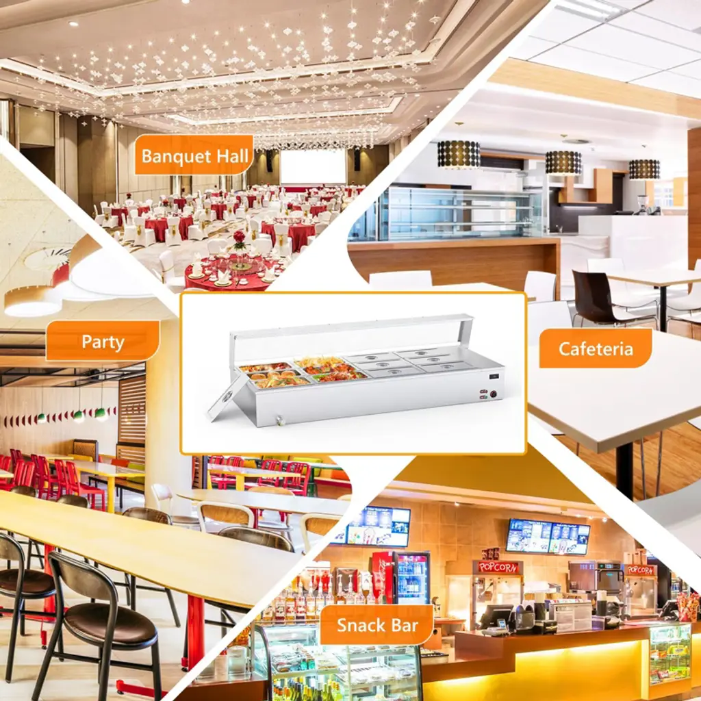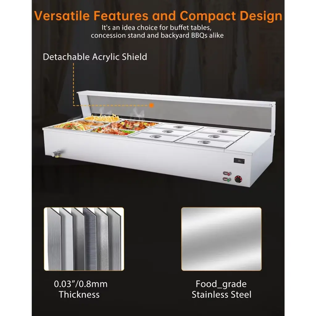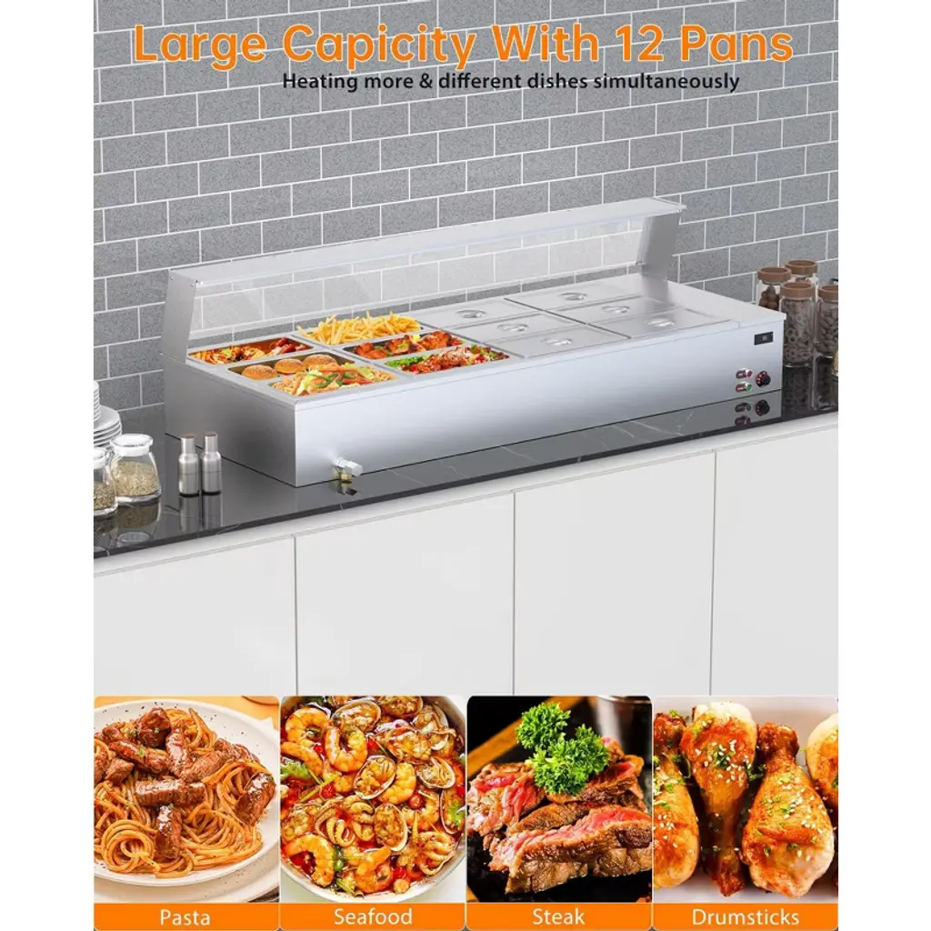 96qt 1500w Electric Commercial Food Warmer, 12x8qt Steam Table Stainless Steel Countertop W/glass Shield Temperature Control & Lid 110v