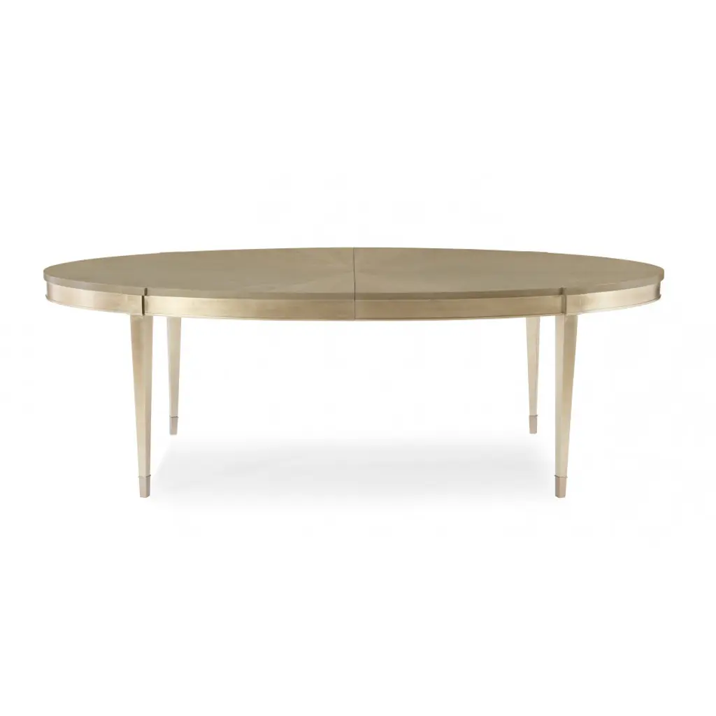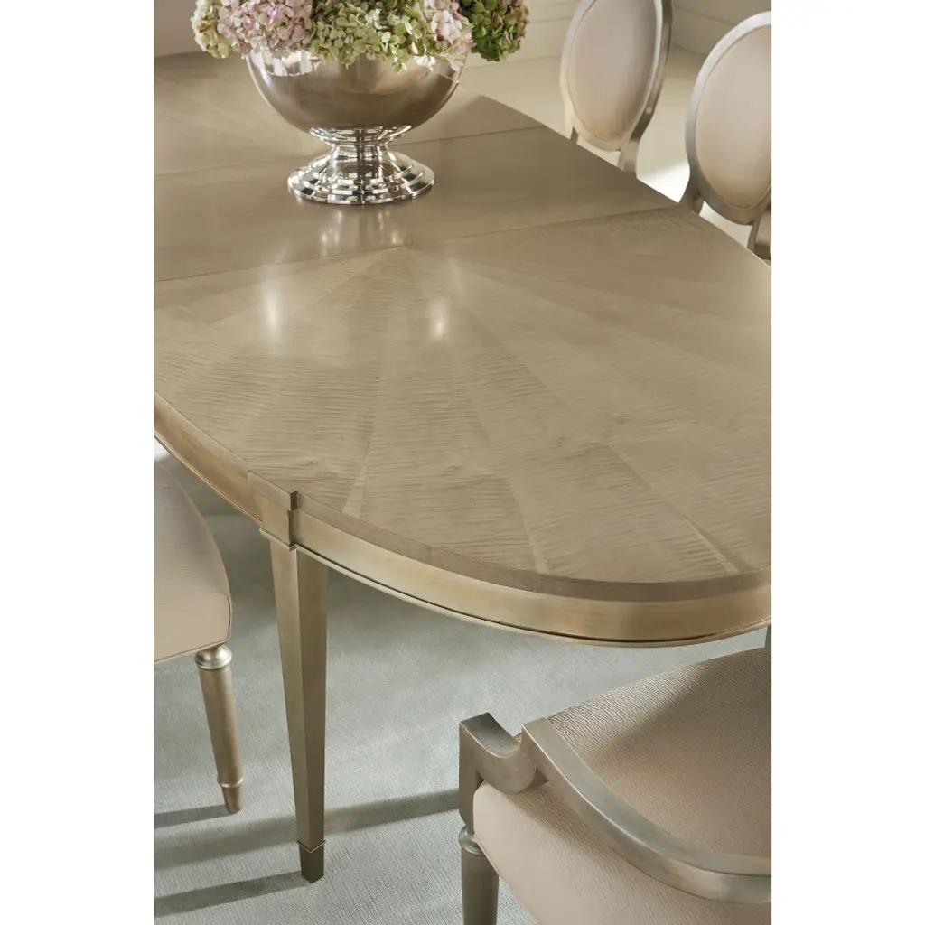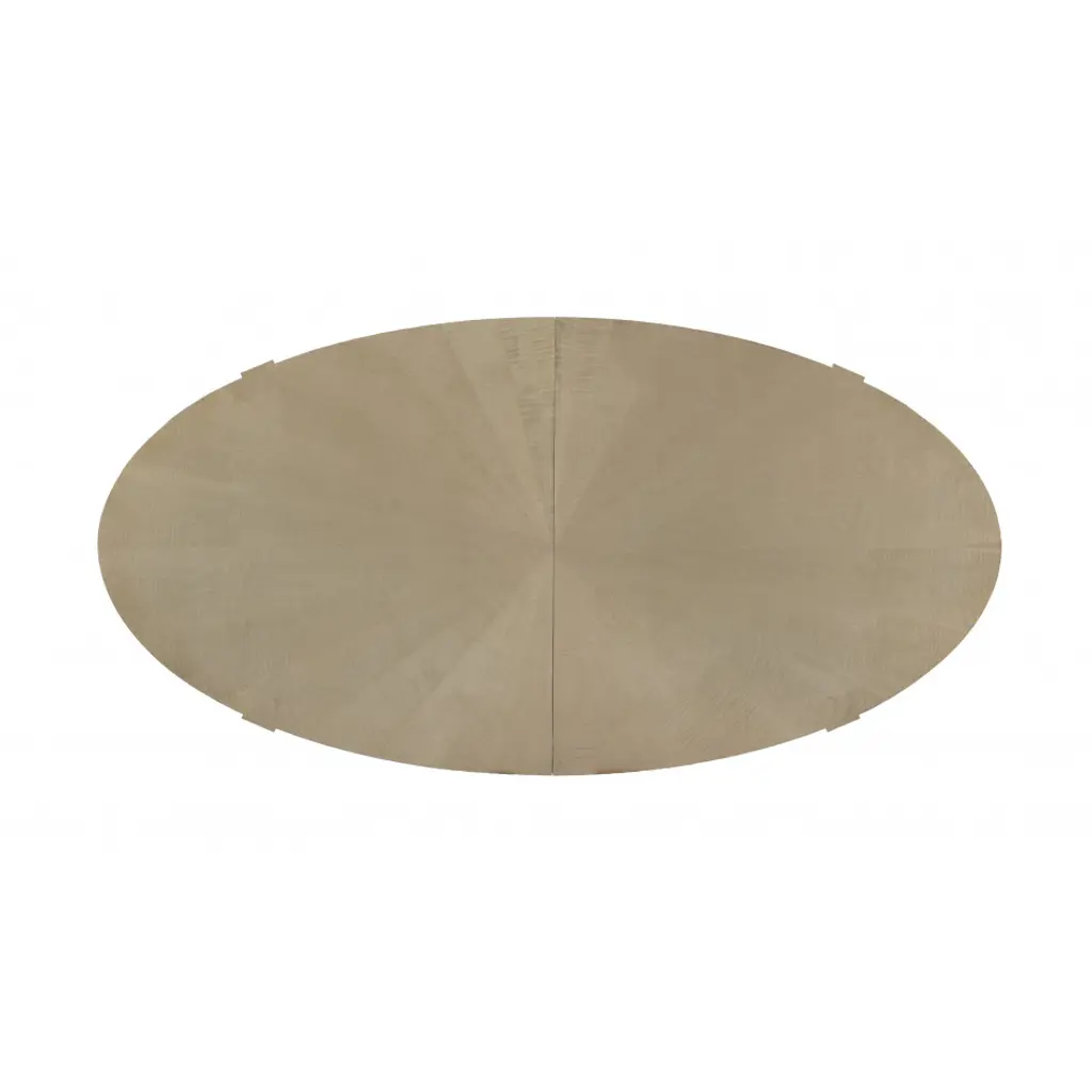 You’ll be inspired to gather friends and family more often with this lovely oval dining table. Its exquisite top features radial-matched Fumed Figured Tiger Maple veneers and is finished in Smoke with Taupe Silver Leaf accents. Ensuring room for everyone, the table extends to 138 inches with its two 24 inch leaves. Metal ferrules adorn its legs for a dramatic finishing touch.
