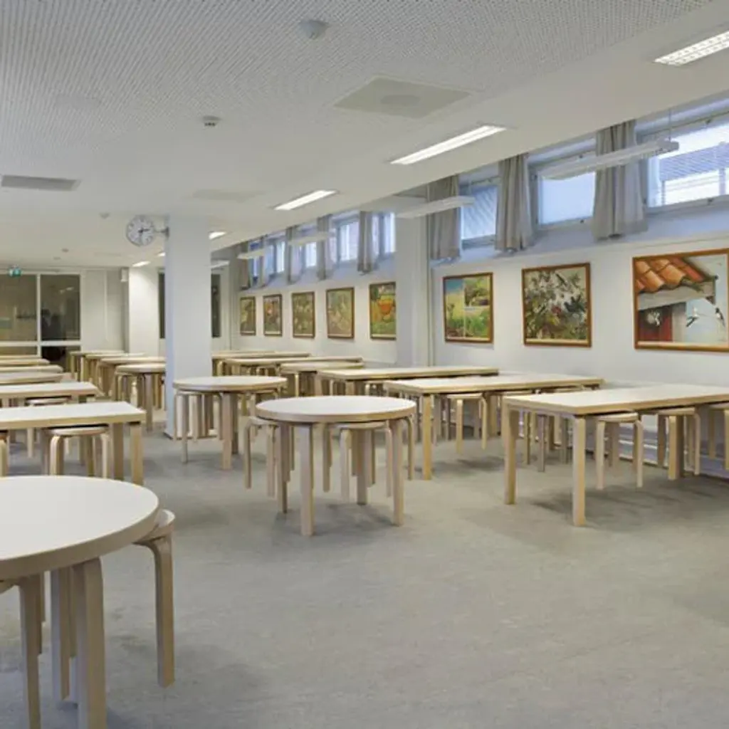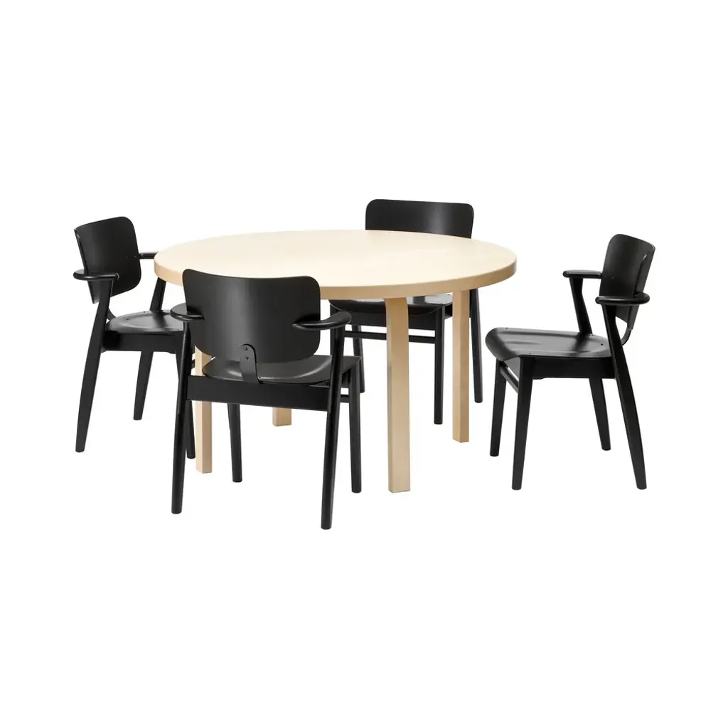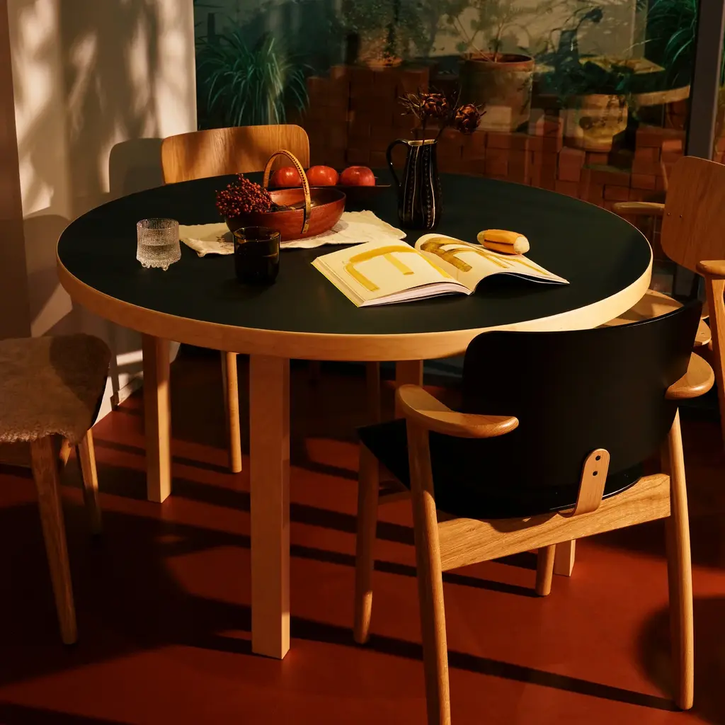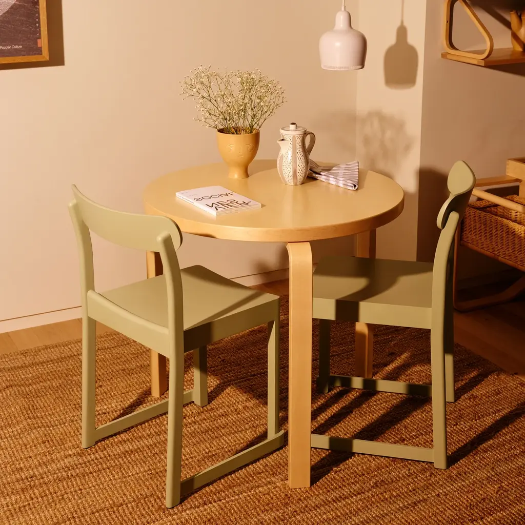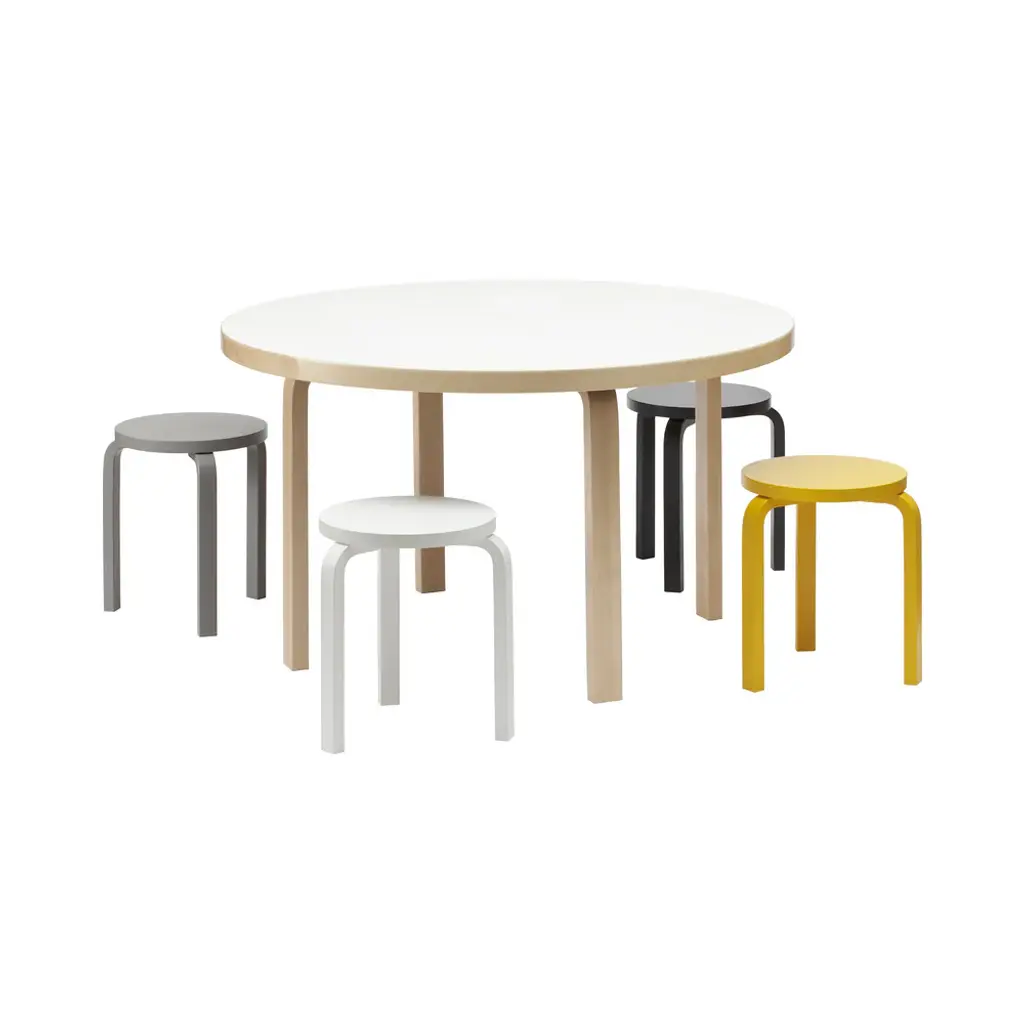 Elevate your dining experience with the Aalto Round Dining Table from Artek. Crafted with a perfectly round top and 4 bent birch legs, this table exudes modern geometry. An enlarged replica the Stool E60, designed by Alvar Aalto in 1935, it adds a touch of sophistication to any space. Choose from a variety of colors/materials for the top, all surrounded by solid birch. Highlights Tabletops
