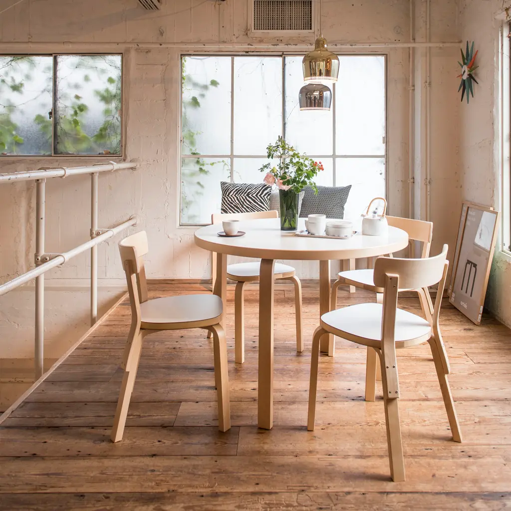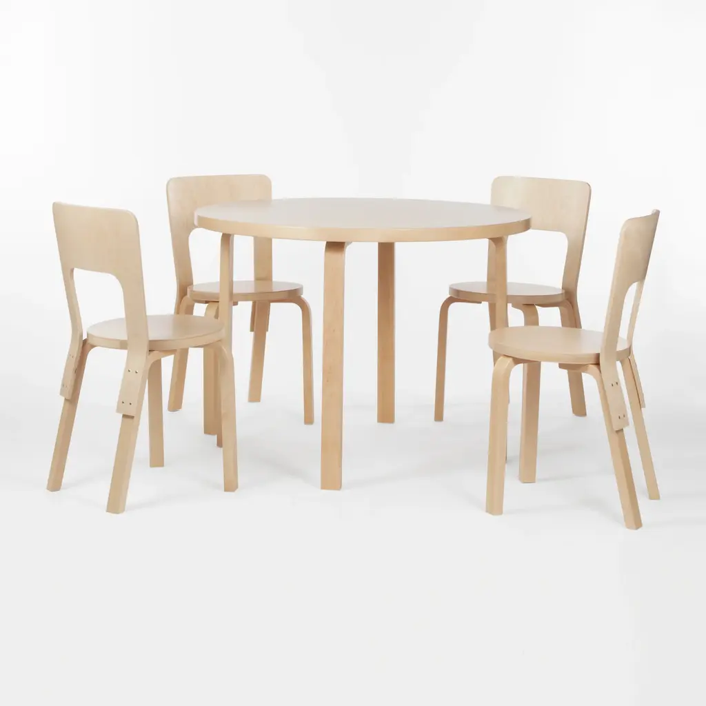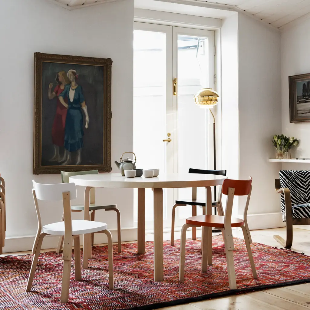 Elevate your dining experience with the Aalto Round Dining Table from Artek. Crafted with a perfectly round top and 4 bent birch legs, this table exudes modern geometry. An enlarged replica the Stool E60, designed by Alvar Aalto in 1935, it adds a touch of sophistication to any space. Choose from a variety of colors/materials for the top, all surrounded by solid birch. Highlights Tabletops