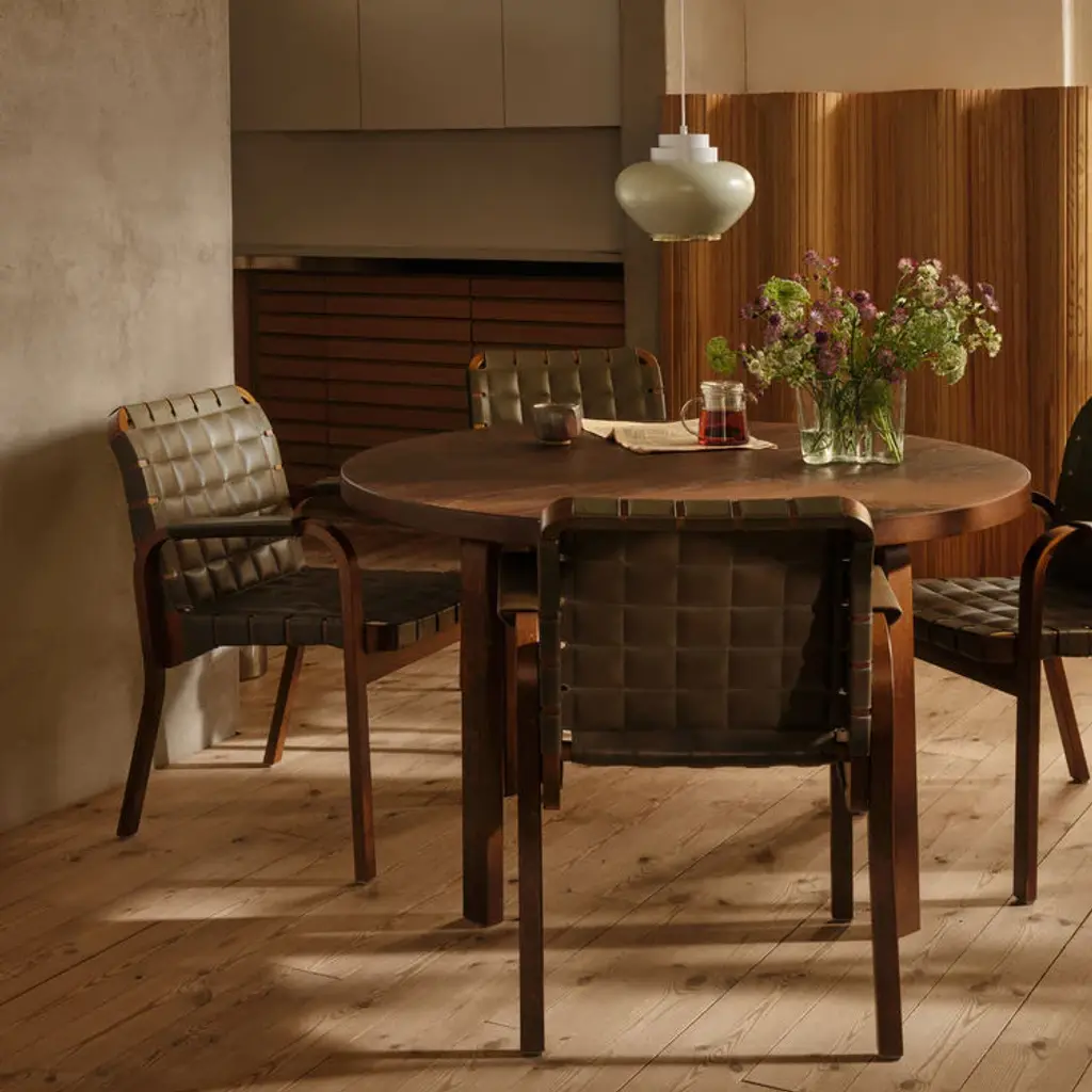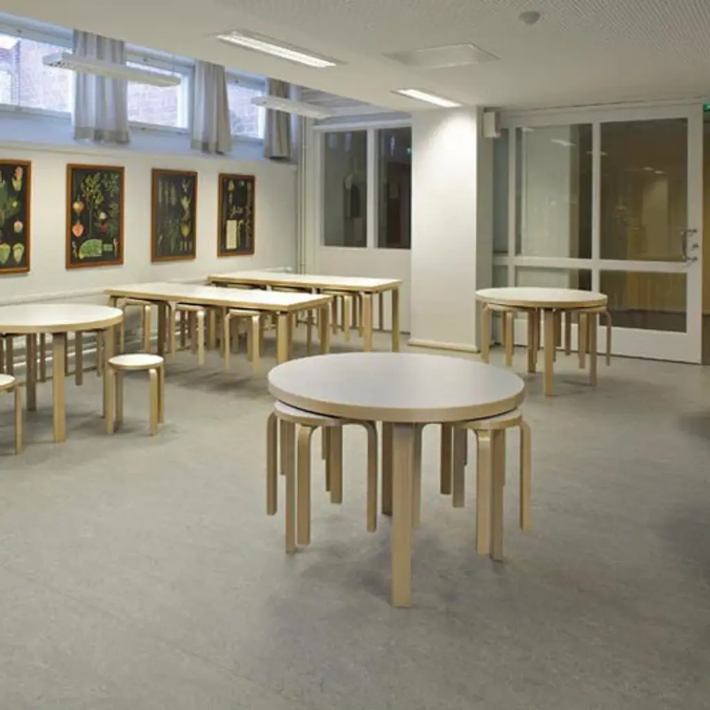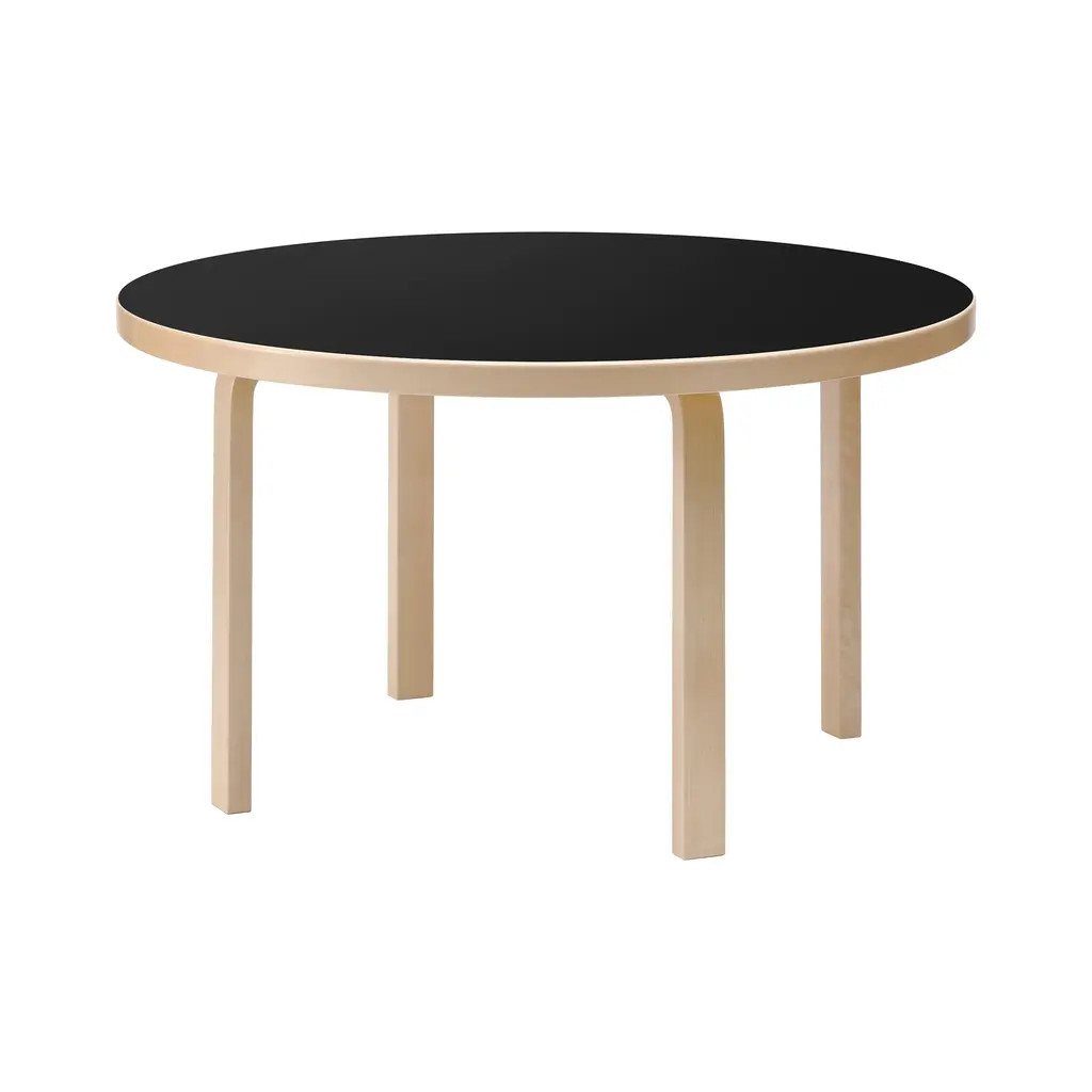 Elevate your dining experience with the Aalto Round Dining Table from Artek. Crafted with a perfectly round top and 4 bent birch legs, this table exudes modern geometry. An enlarged replica the Stool E60, designed by Alvar Aalto in 1935, it adds a touch of sophistication to any space. Choose from a variety of colors/materials for the top, all surrounded by solid birch. Highlights Tabletops