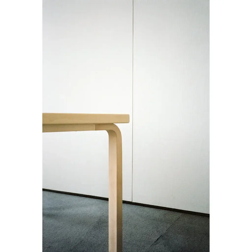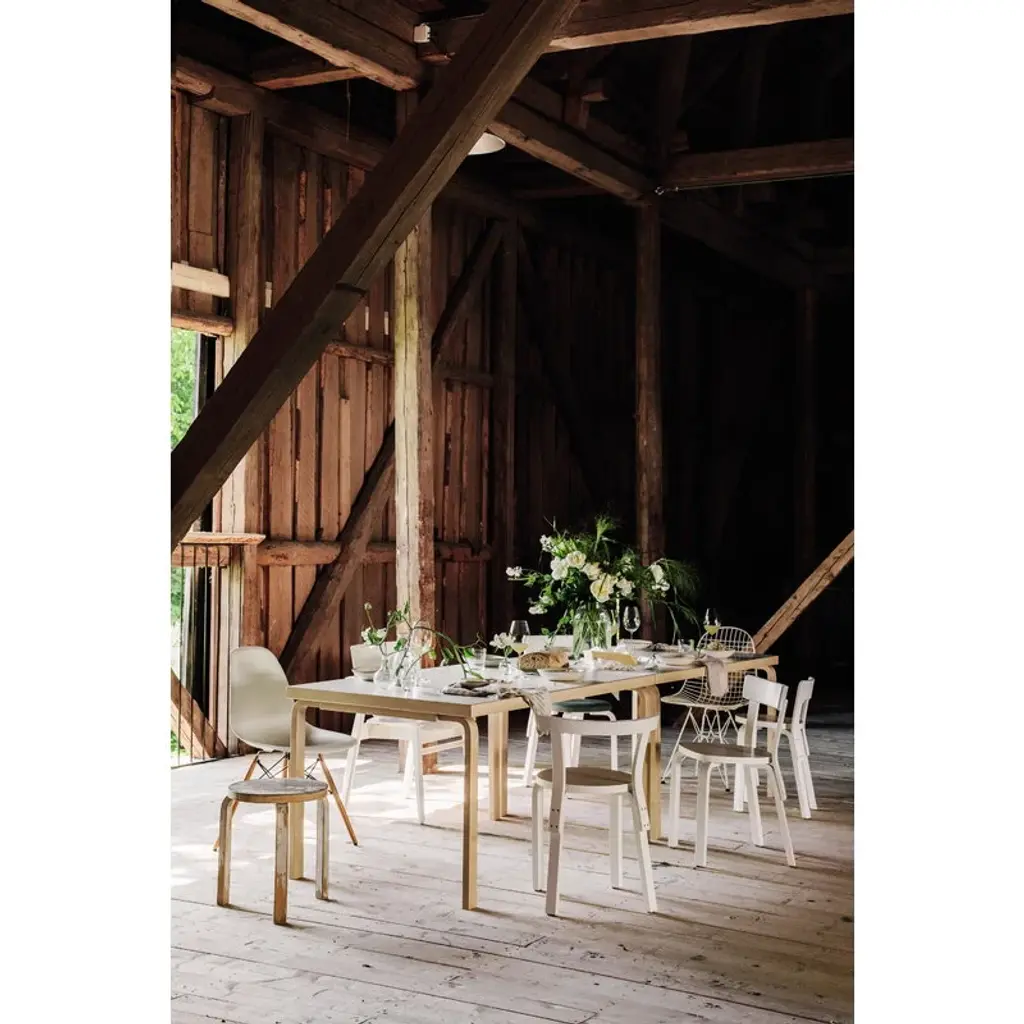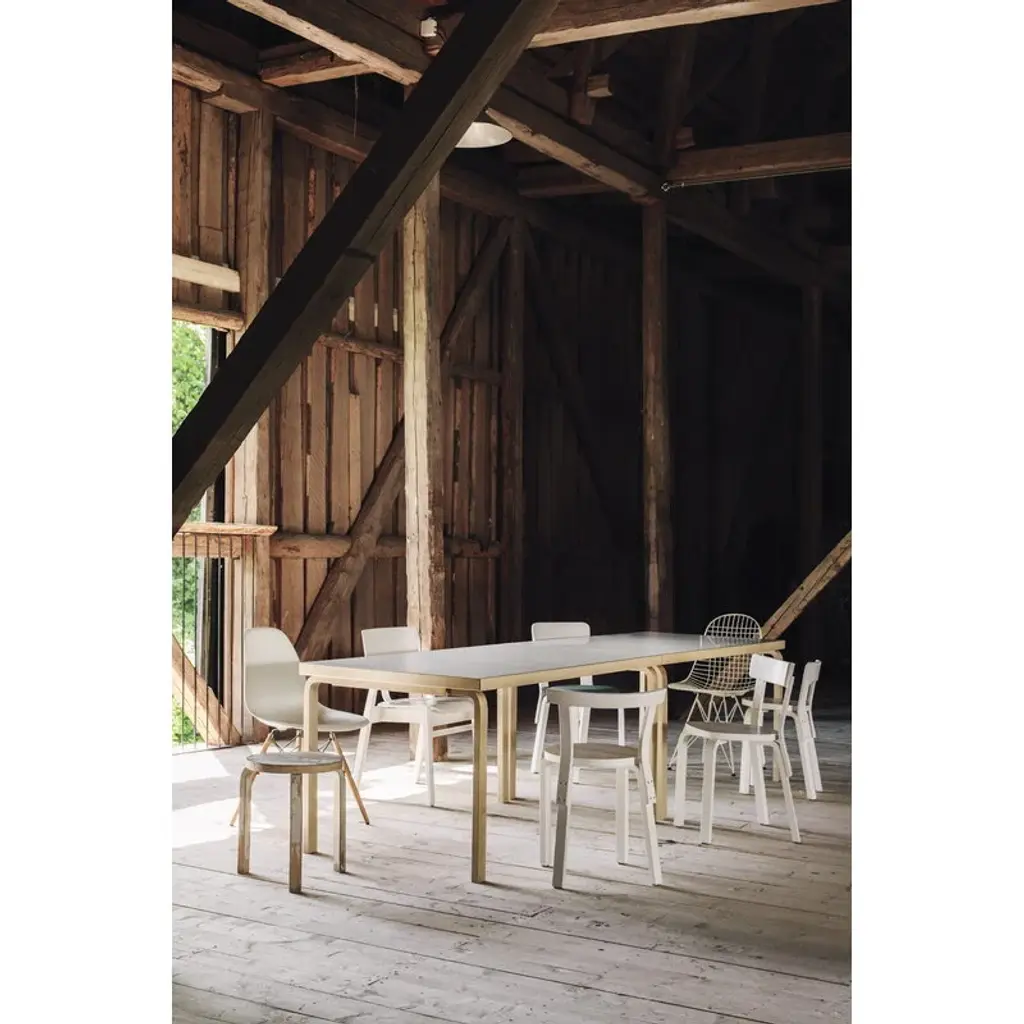 Artek’s table 82A is Alvar Aalto's timeless design from 1935. The main material of the rectangular dining table is solid birch, and the tabletop is coated with black linoleum. Artek tables are based on different combinations of Alvar Aalto’s L-legs and tabletops. Aalto introduced the bent L-leg for the first time in 1933, and it became a standard component in his furniture designs. Judging his importance as a designer and architect, Aalto considered the development of the L-leg as his greatest achievement – he even called the L-leg "the little sister of the architectonic column". The development of the L-leg was revolutionary because it solved the problem of attaching legs directly to the tabletop in a completely new way – the leg could be fastened with screws directly to the tabletop, and the result was a simple but very solid structure.
