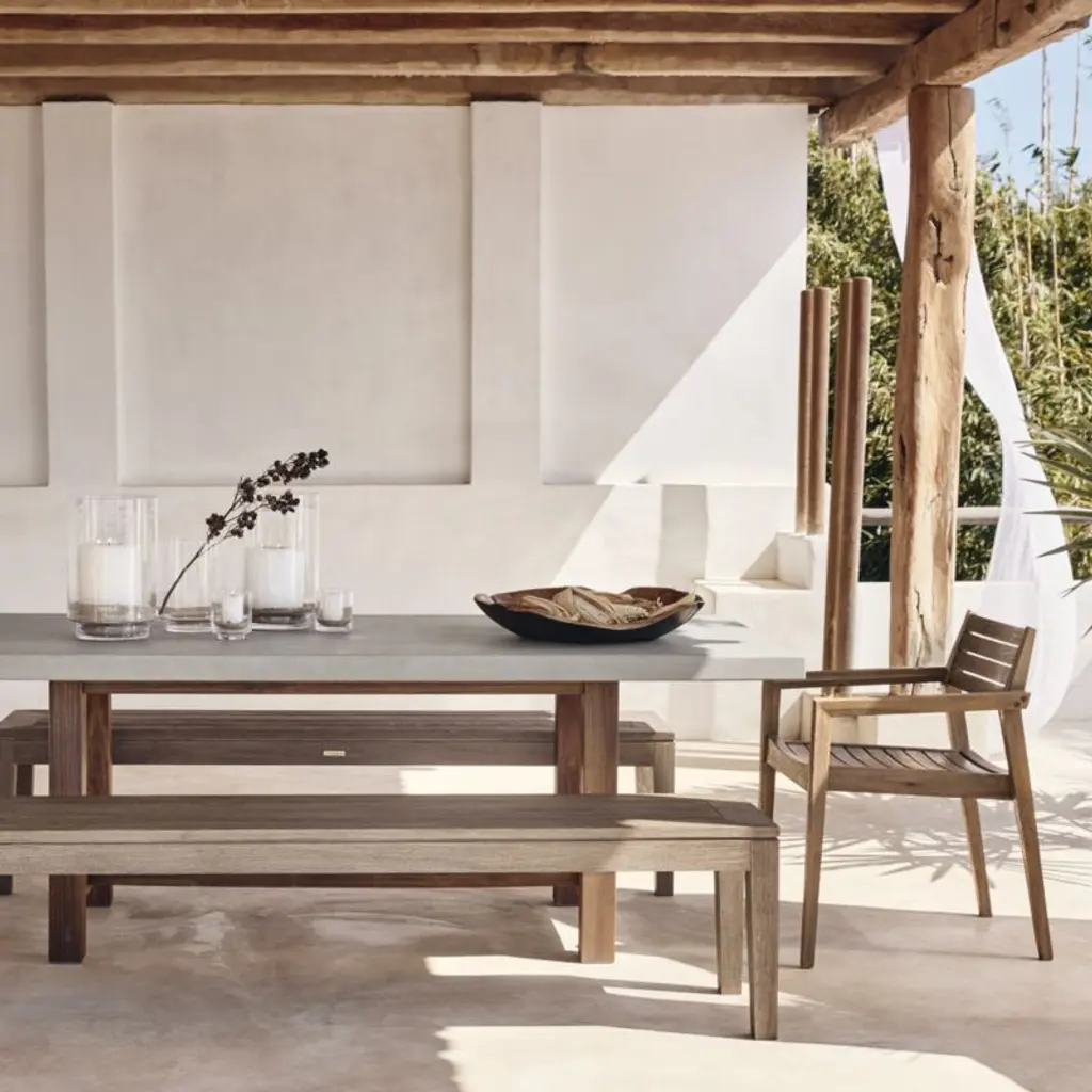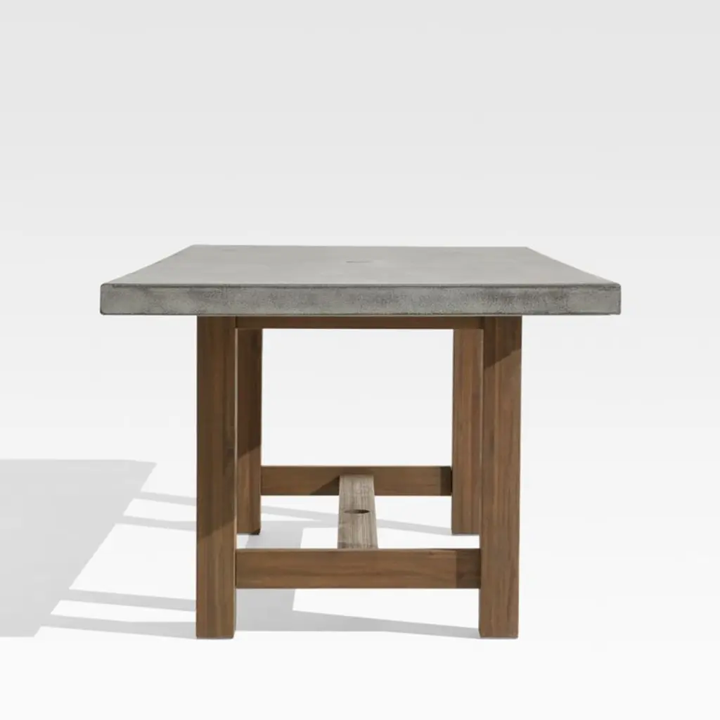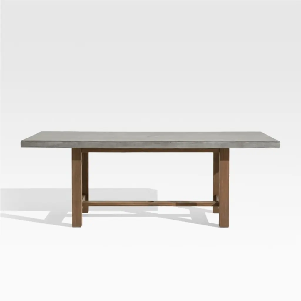 Indoor style travels outdoors with our clean, casual Abaco dining table. Made of acacia wood tinted grey to resemble teak, the trestle base is masterfully crafted with mortise-and-tenon joinery for superb durability. On top, cool concrete sealed for optimal weather resistance exhibits coloring and markings unique to each piece. Each table has undergone robust testing with exposure to a wide range of temperatures and weather conditions. The Abaco Dining Table is a Crate and Barrel exclusive.To keep this item looking its best, we recommend protecting it from inclement weather with the WeatherMAX Rectangular Outdoor Dining Table and Chairs Cover by KoverRoosBy choosing FSC ®-certified furniture, you are supporting responsible management of the world's forests.