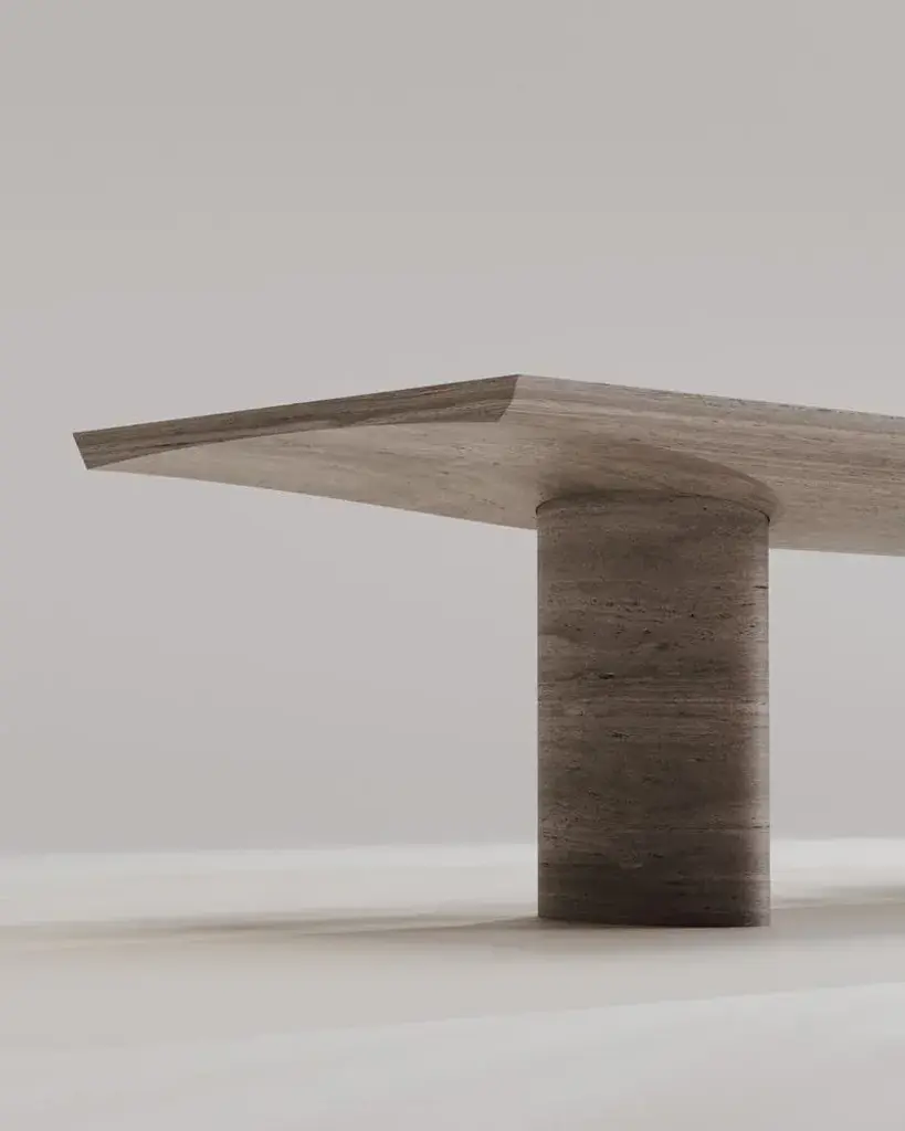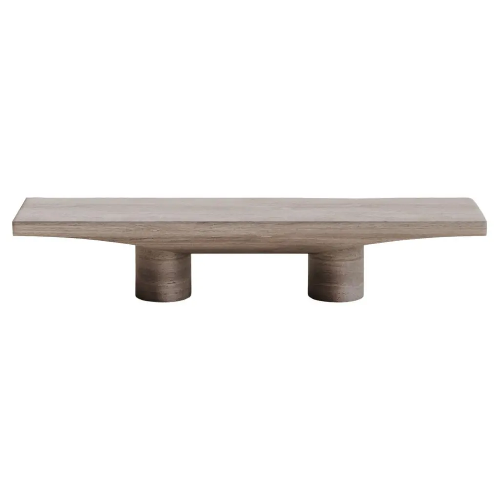 "Introducing the "Abraccio" Collection or translated "embrace" Collection unites the enduring beauty of solid carved marble with a language of form that pays homage to primitive structures. Two primal shaped columns support a commanding horizontal solid slab. It becomes a conversation between classical and contemporary, nature and craftsmanship, geometric precision and organic shapes. Yet, it's the ellipsoid embrace that truly defines the collection's character. These graceful curves, meticulously carved into the stone, encircle the columns like an enigmatic story waiting to be deciphered. This ellipsoidal motif not only adds a layer of visual allure but also imparts a sense of unity and balance, bridging the gap between the geometric precision of the columns and the softer lines of the surrounding space. sizes. "