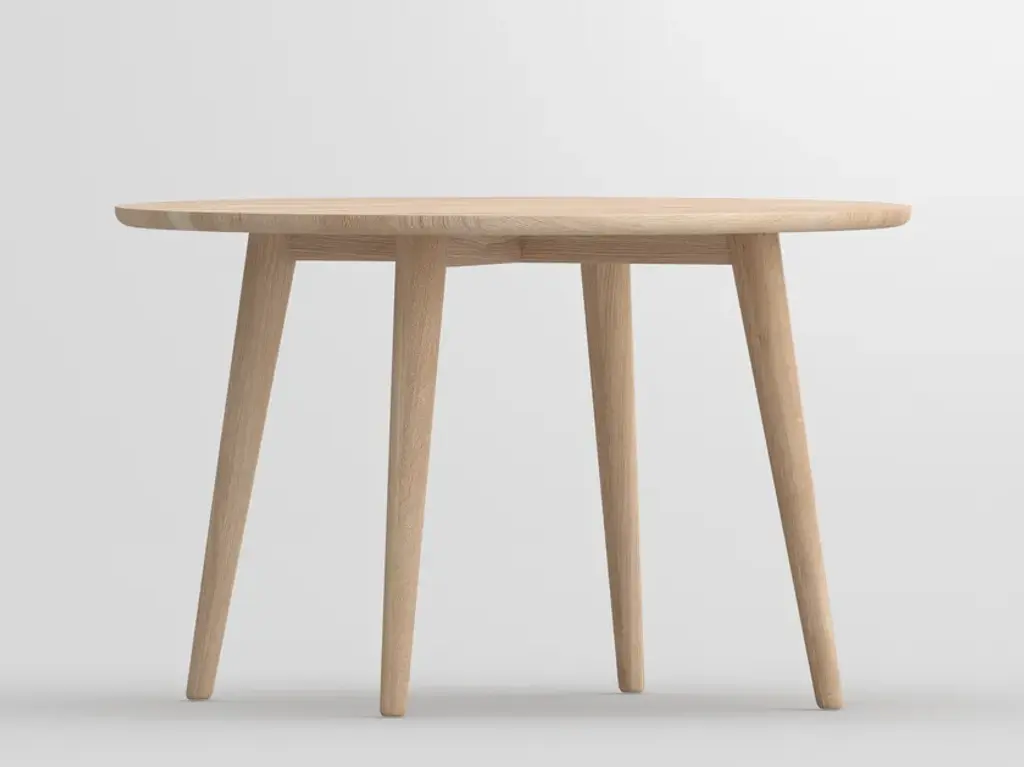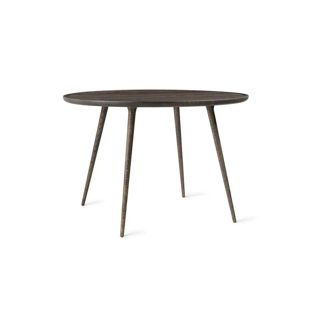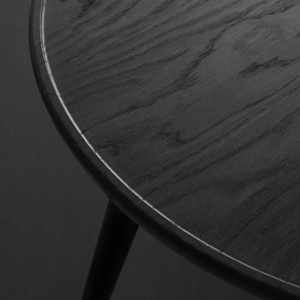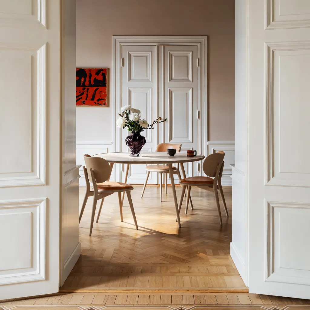 Space Copenhagen pares the dining table down to its essentials—plane, edge, leg—then gives each element just enough detail to feel sculptural. The Accent table’s solid-oak top thins toward the rim so light skims its surface like a sheet of ice, while soft-tapered legs meet in a low brace that echoes traditional Danish joinery without the fuss. Cut from FSC-certified European oak and finished in either matte-lacquer or black-stain, the wood keeps its natural grain on show and tones down the shine for everyday use. Pull up four chairs to the 55-inch round for easy passing and eye contact, or choose the smaller 35-inch version when square footage (or office paperwork) is tight. Breakfast, sketch session, late-night emails—whatever lands on the Accent table gets a calm, quietly crafted stage.