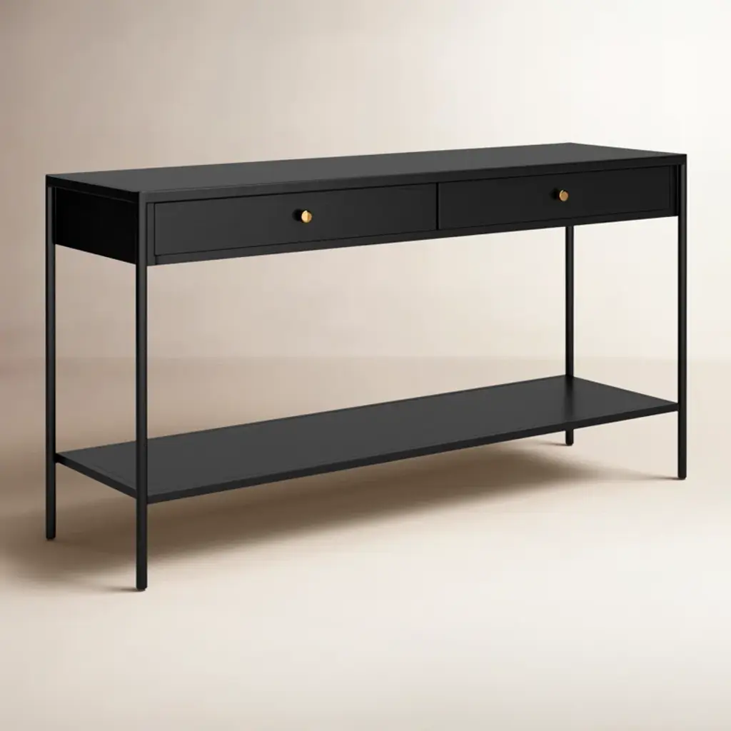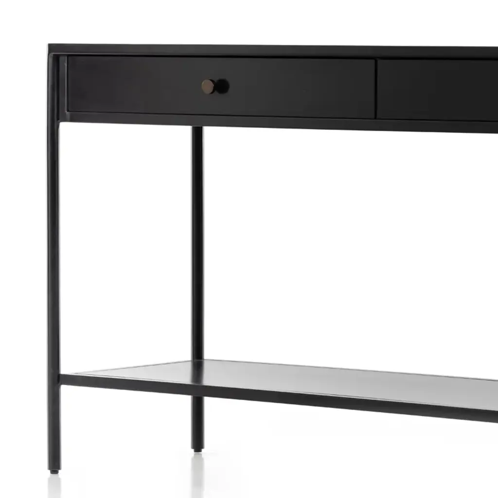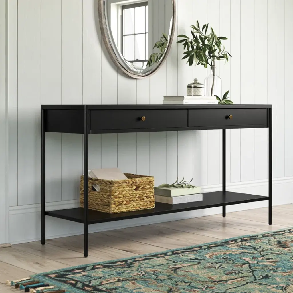 Bring a softened industrial look to the media room, dining space, or entryway with a simple black-finished iron console table featuring bronzed iron hardware for modernity. Dual drawers and lower shelving add bonus storage space.