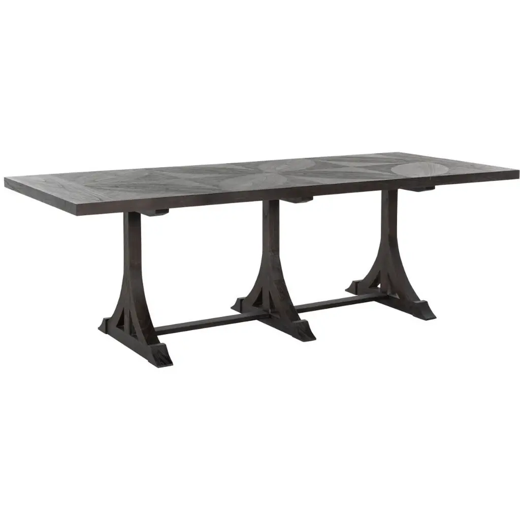The Adams Dining Table exemplifies the Gabby difference, marrying vintage inspiration with meticulous attention to detail. It presents a harmonious combination of an inlaid oak veneer top featuring an elegant flower pattern, with a base that recalls classic European design, all finished in a sophisticated dark antique grey wash. This table is a testament to Gabby's commitment to design excellenceevery curve and pattern is a product of careful curation, ensuring each piece stands out as a symbol of both beauty and functionality. Seating eight comfortably, it's not just a centerpiece for dining but a conversation starter, reflecting the rich legacy of detail-oriented craftsmanship that defines Gabby's collection.