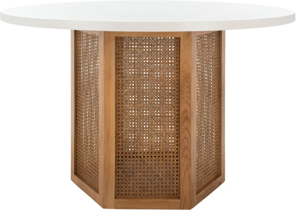 This table will bring tropical elegance to your dining room. The six-sided base features woven cane panels and supports a round wooden top. Seats five people with ease.
