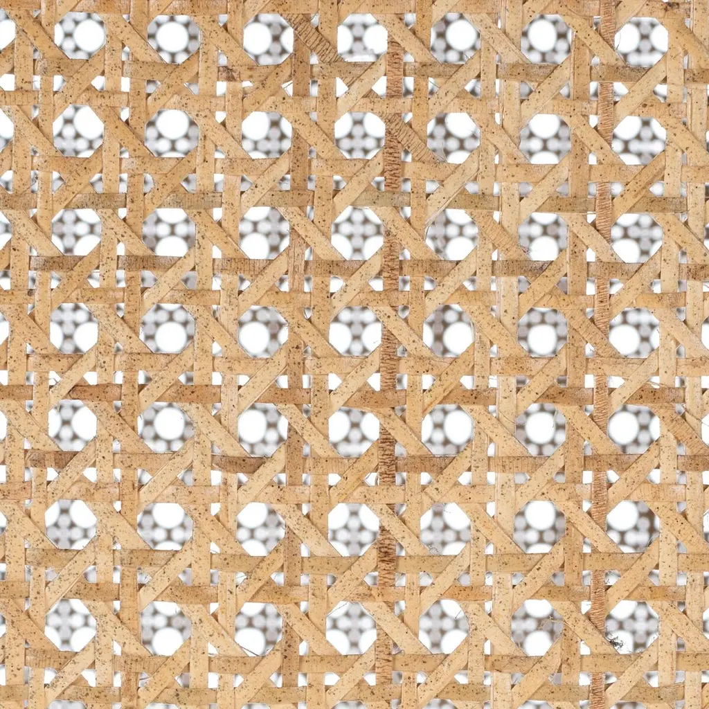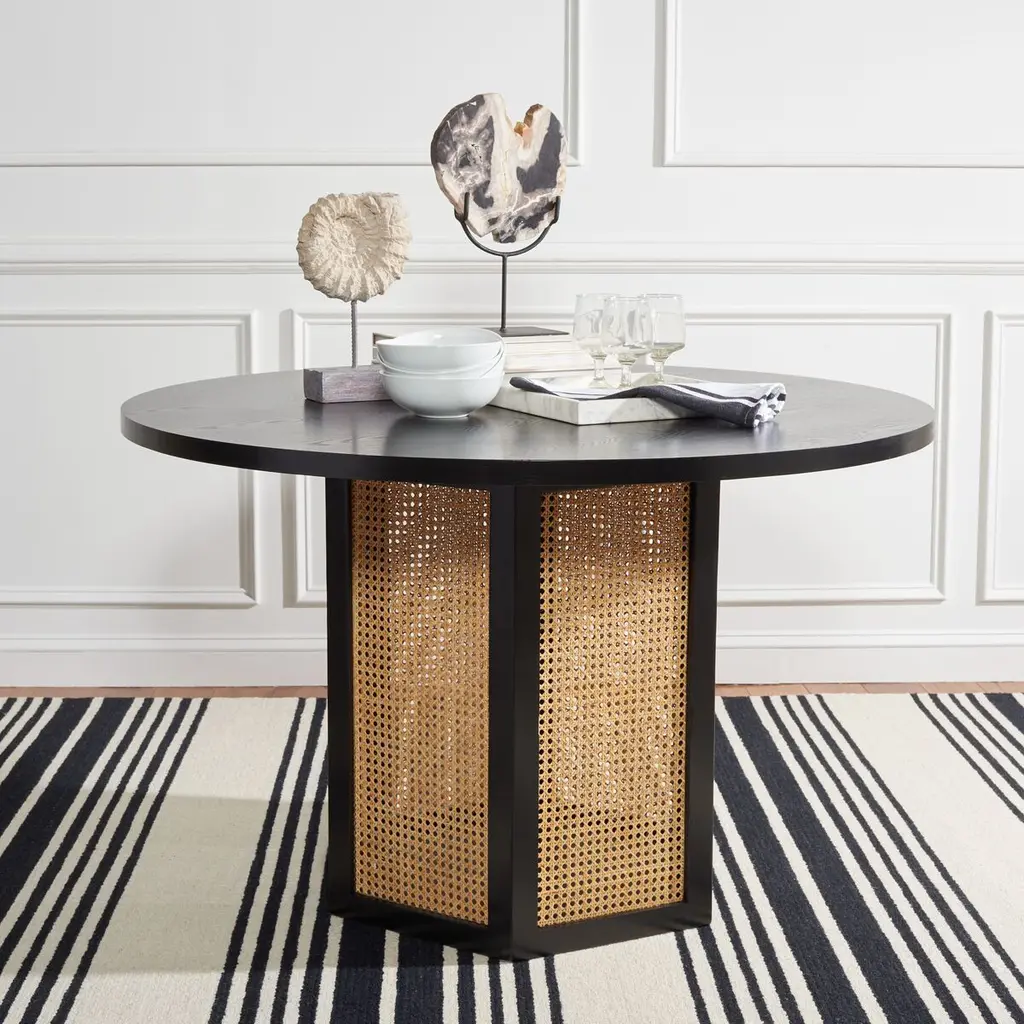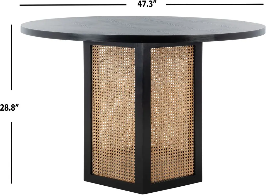 This table will bring tropical elegance to your dining room. The six-sided base features woven cane panels and supports a round wooden top. Seats five people with ease.