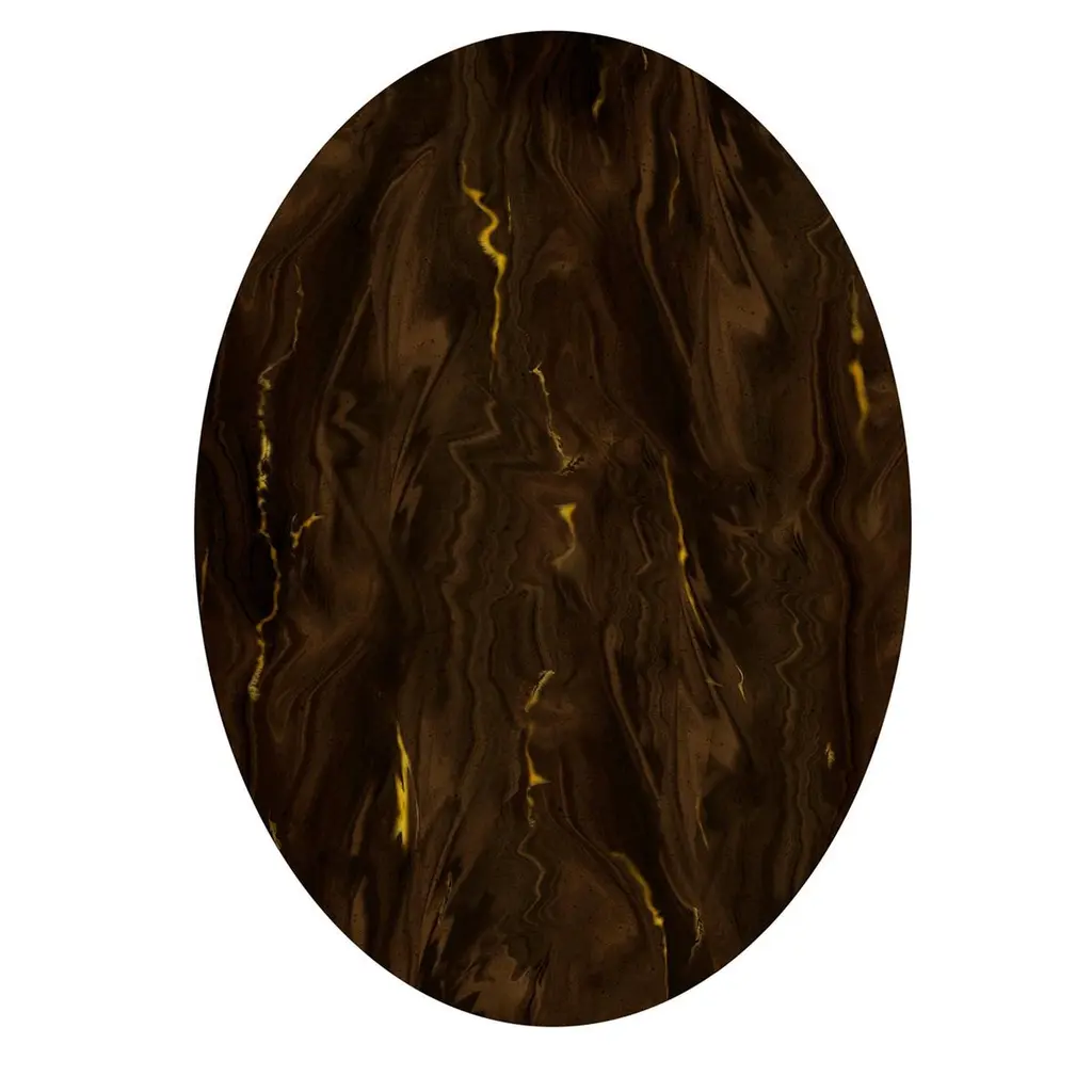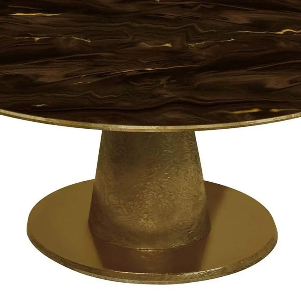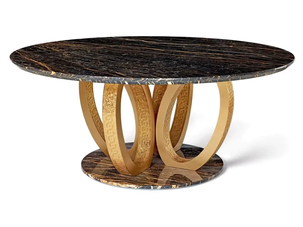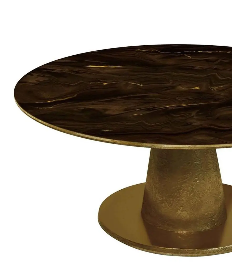 The exquisite combination of textures and finishes makes this table a true masterpiece that will stand out in Classic and modern dining rooms alike. The wooden structure consists of an oval top, supported by a central truncated cone raised on a round base. Marked by aesthetic balance and striking visual allure, the top features a black scagliola decoration recalling gold-veined marble, whose glossy finish results from the addition of moonstone in the matrix. Both the base and top rim have a shimmering brass finish. The top can be customized in other sizes, ask the concierge for availability.