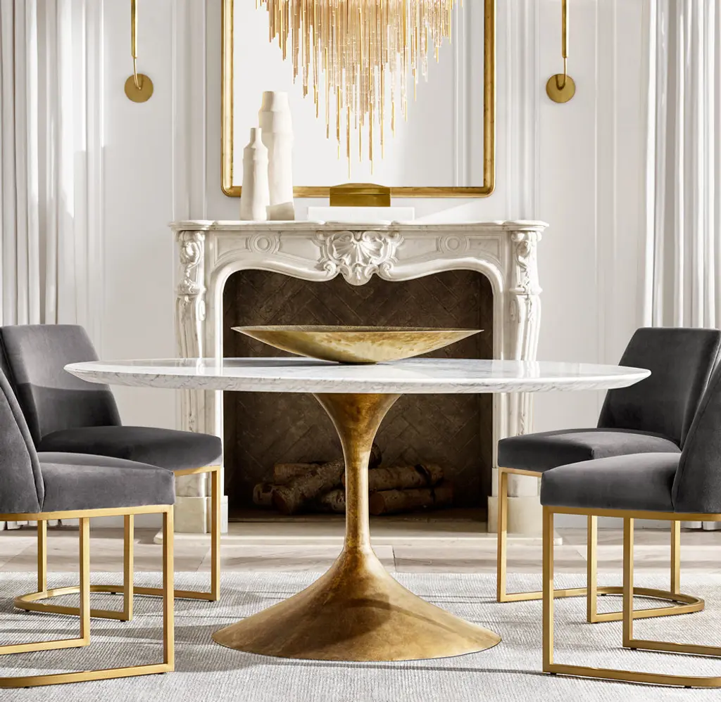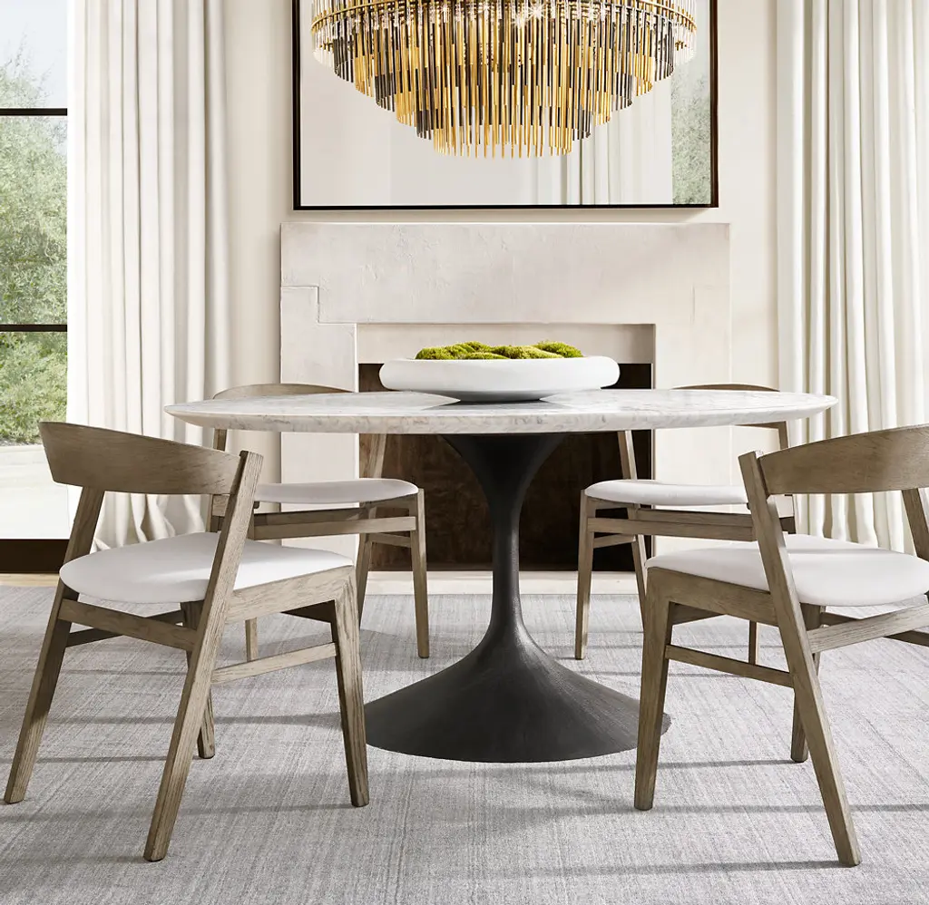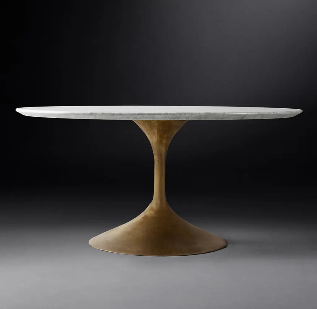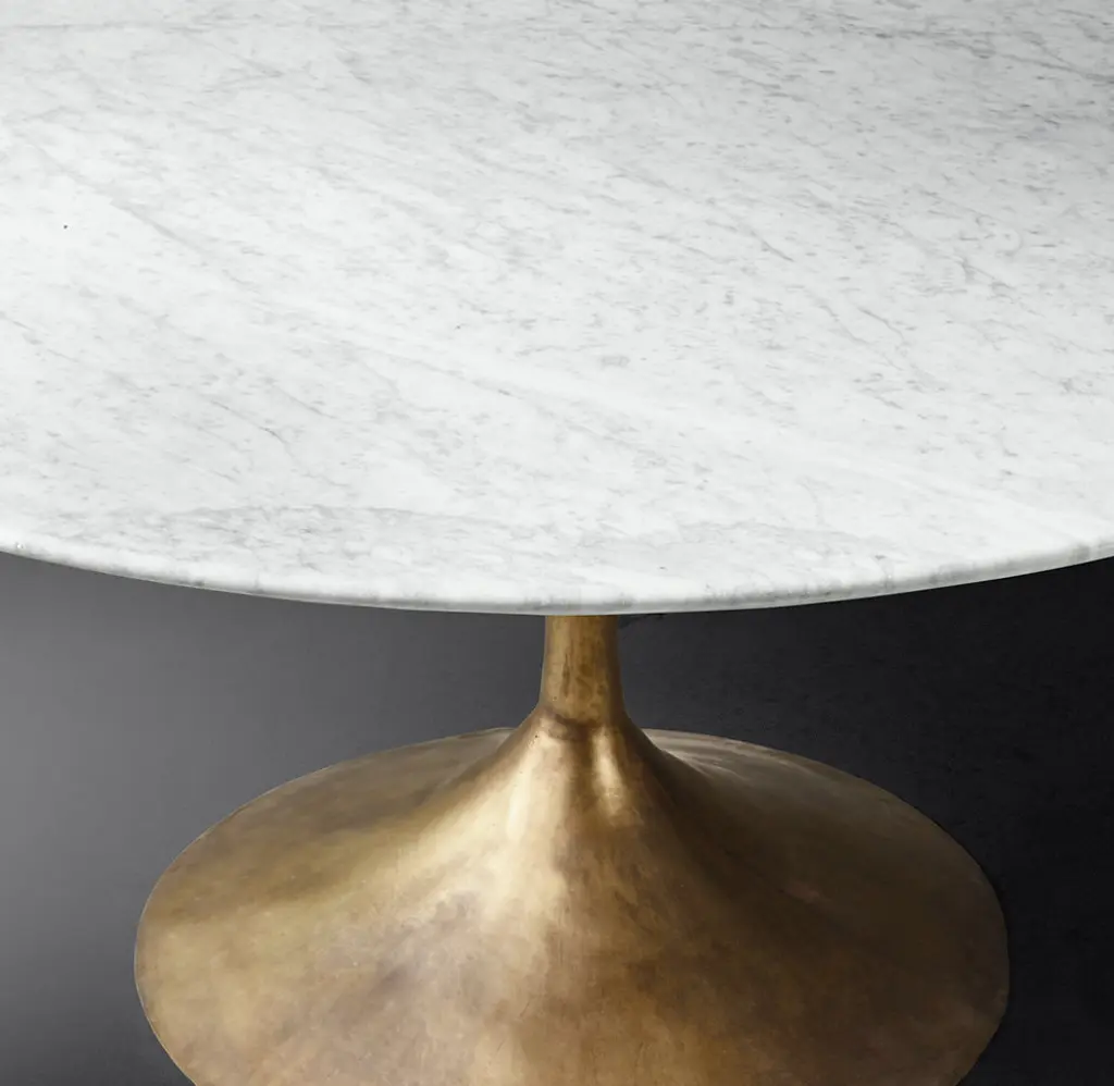 Paying homage to the sweeping lines of midcentury furnishings, our table is a study in simplicity. Defined by its balanced proportions and arching, sculptural curves, our interpretation pairs a cast metal pedestal base with a bullnose marble top. SHOP THE ENTIRE COLLECTION