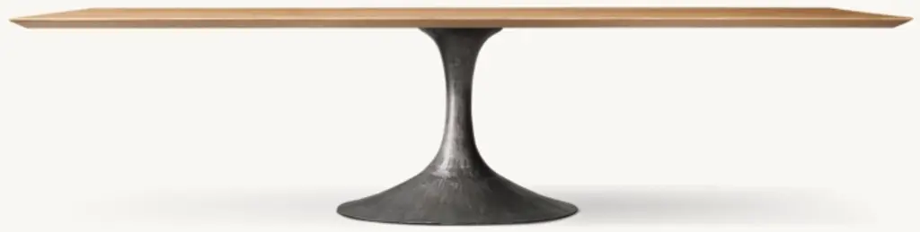 Paying homage to the sweeping lines of midcentury furnishings, our table is a study in simplicity. Defined by its balanced proportions and arching, sculptural curves, our interpretation pairs a cast steel pedestal base with a beveled-edge oak or walnut top. ALSO AVAILABLE IN STONESHOP THE ENTIRE COLLECTION